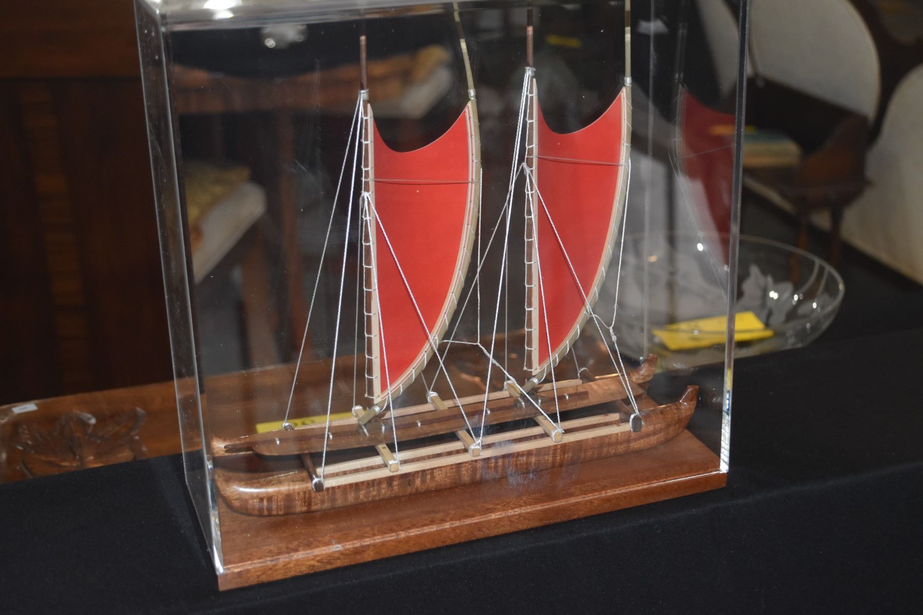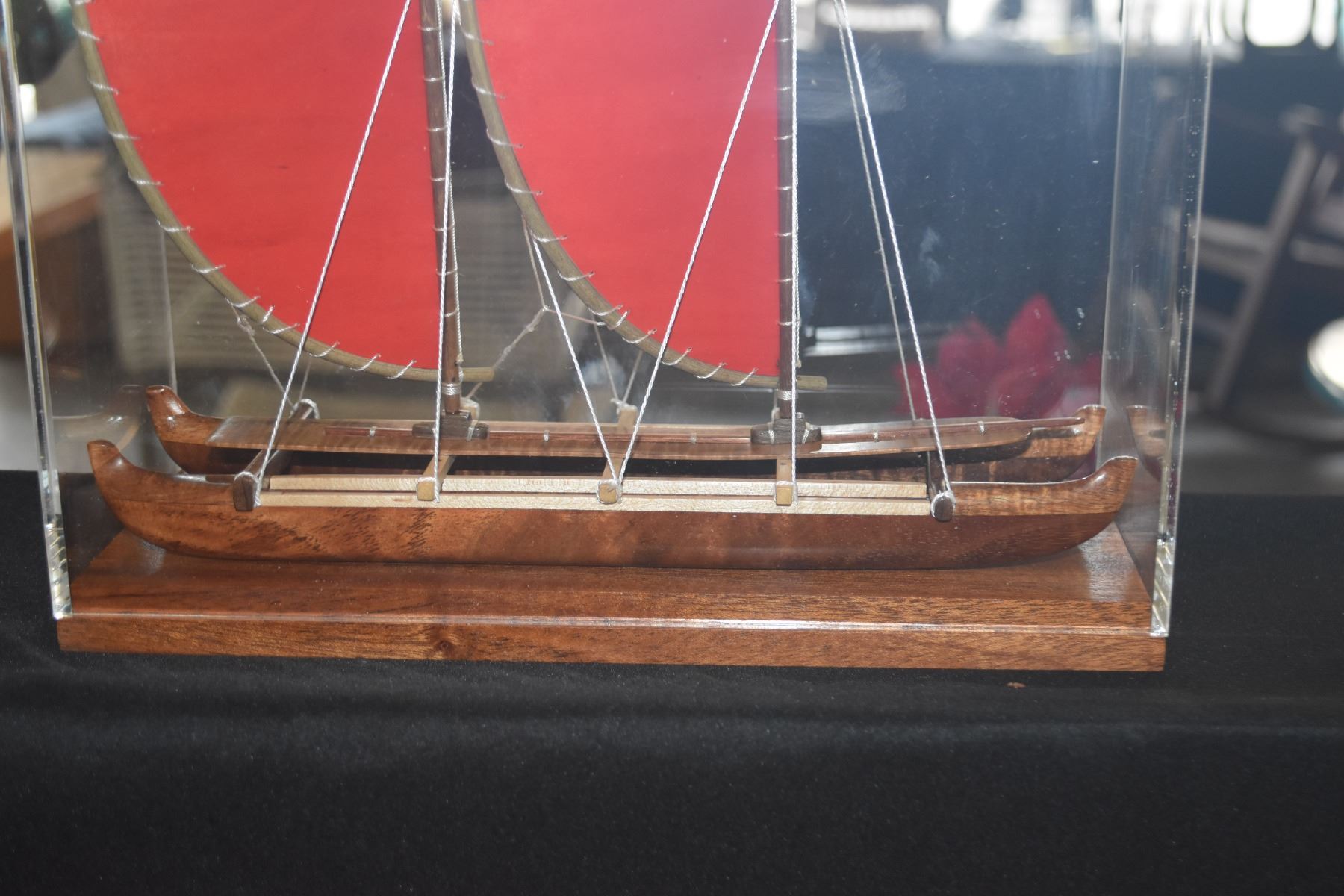 12" HAWAIIAN VOYAGING CANOE W/RED SAILS IN SHOWCASE BY FRANCIS PIMMEL