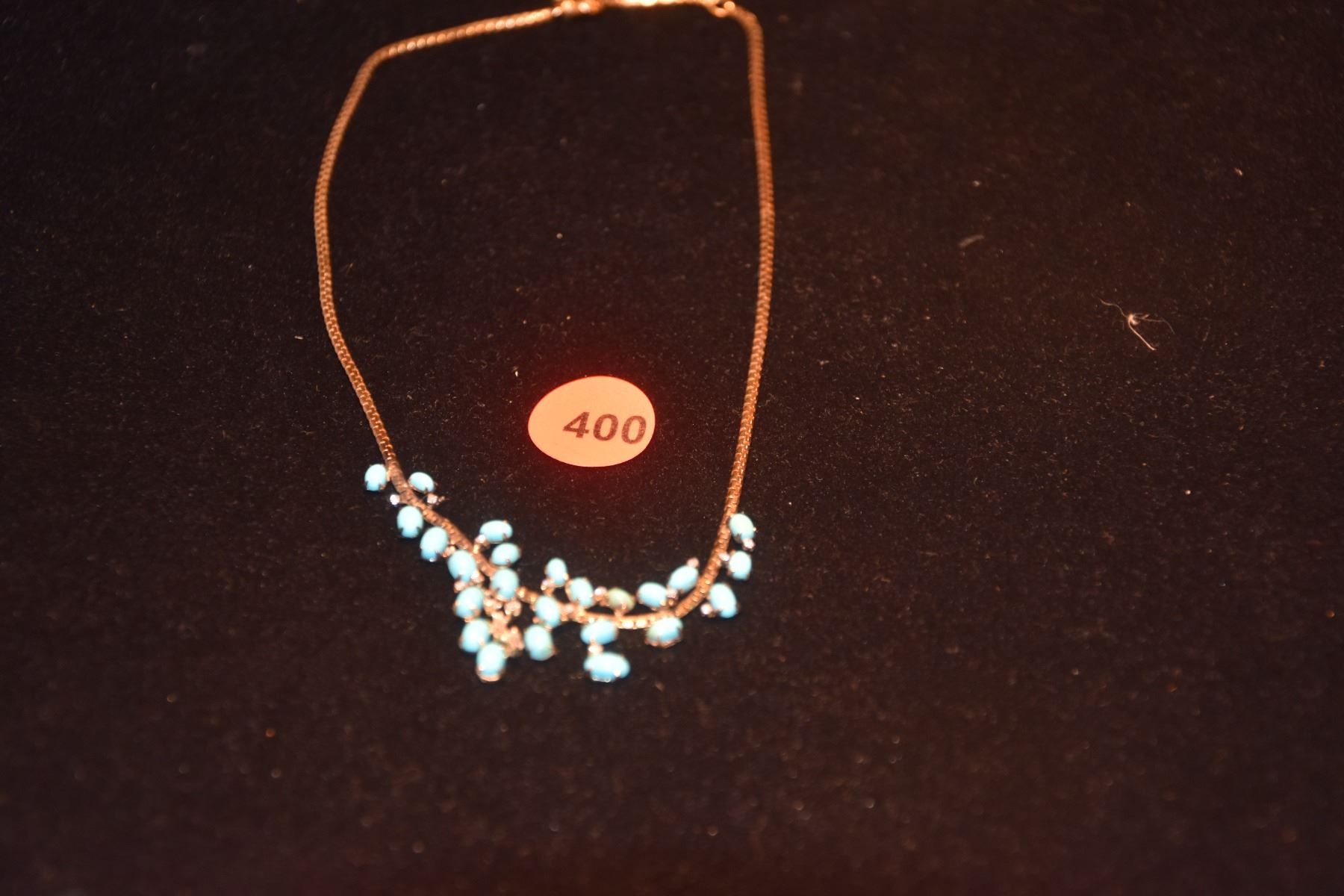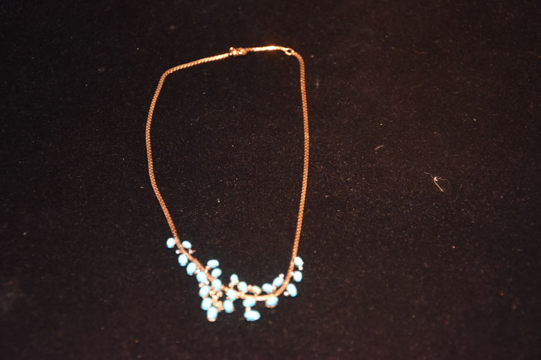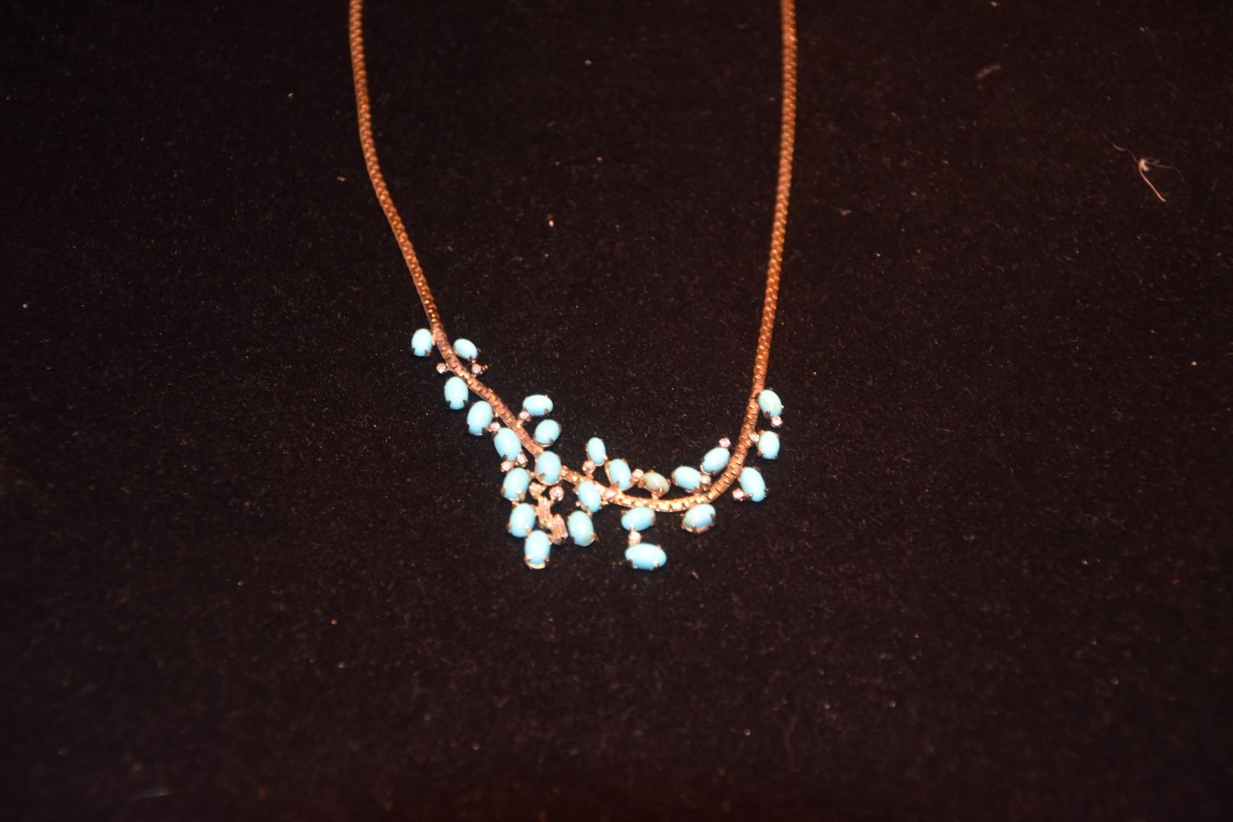 14K FAUX TURQUOISE NECKLACE (24 SMALL OVAL BLUE CABOCHON, 2 SMALL BAGUETTE DIAMOND (APPROX. 1/7 CT, SLIGHTLY CHIPPPED) & 17 SMALL SINGLE-CUT DIAMONDS (APPROX. 1/4 CT.) (APPROX. VVS-SI, SOME CHIPPED)) (APPROX. 9.9 G)