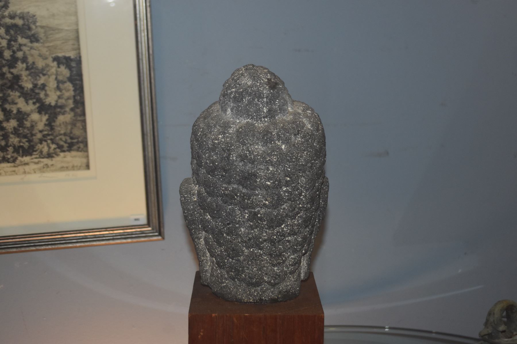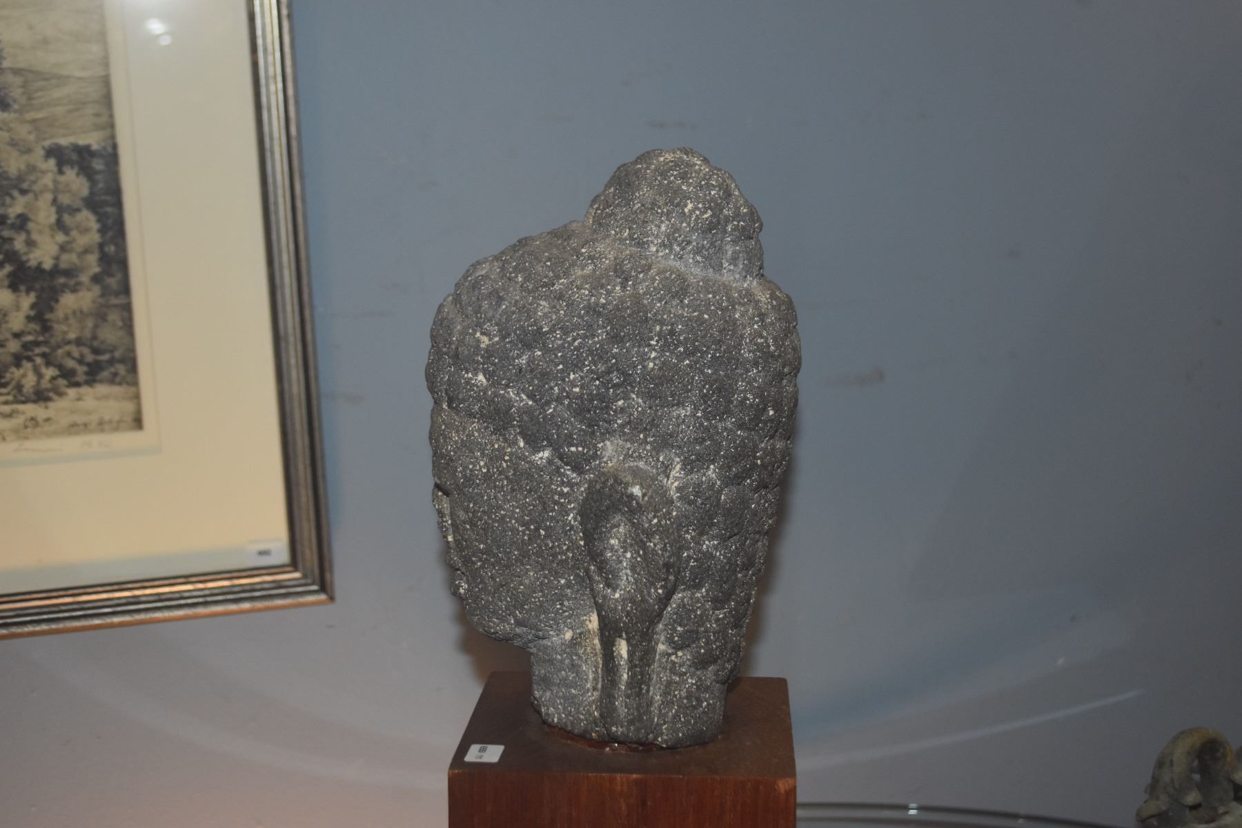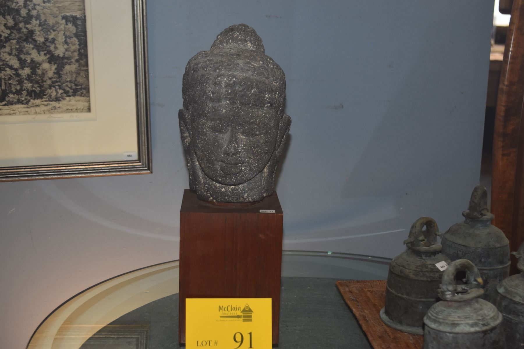 16" STONE BUDDHA HEAD ON WOOD STAND