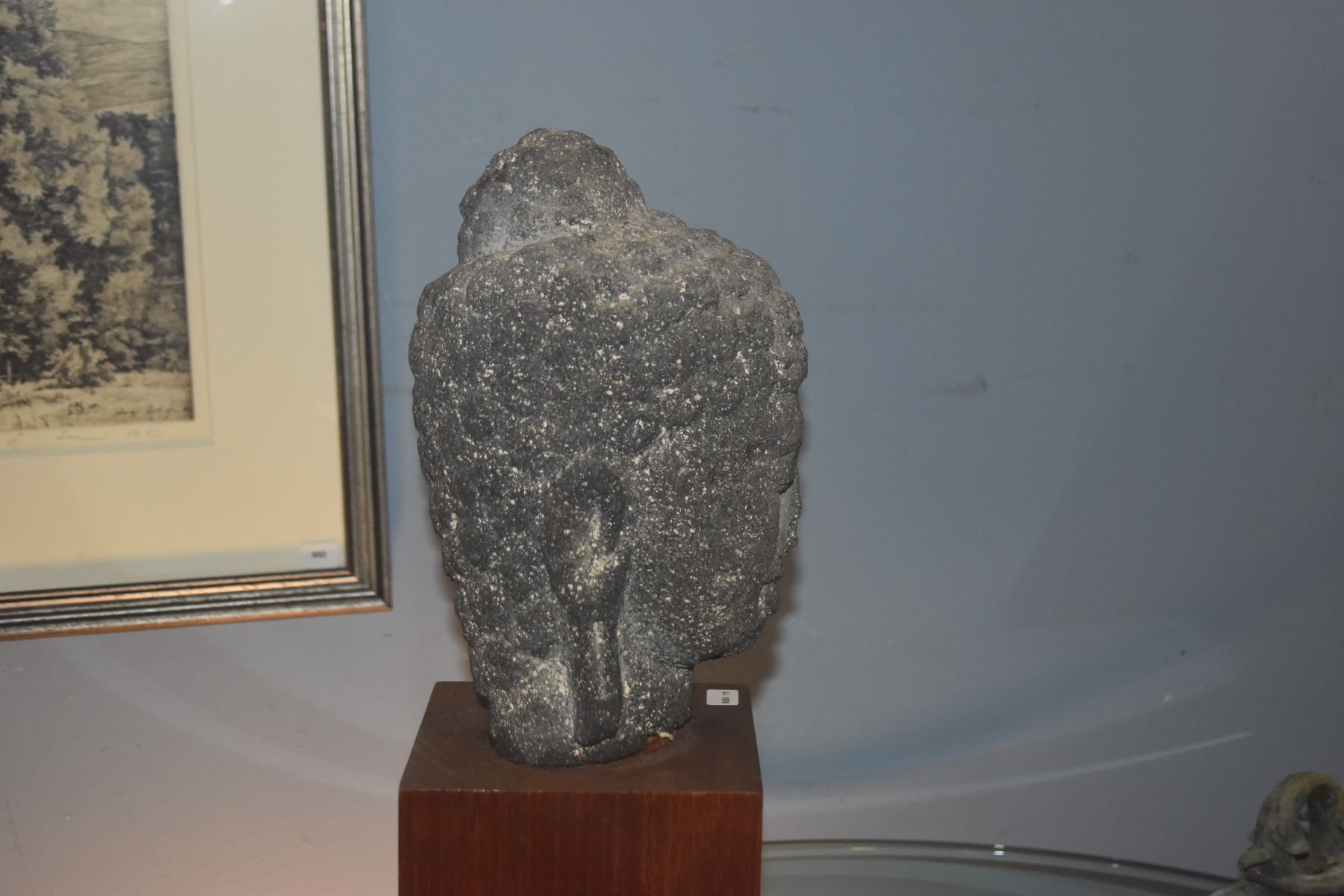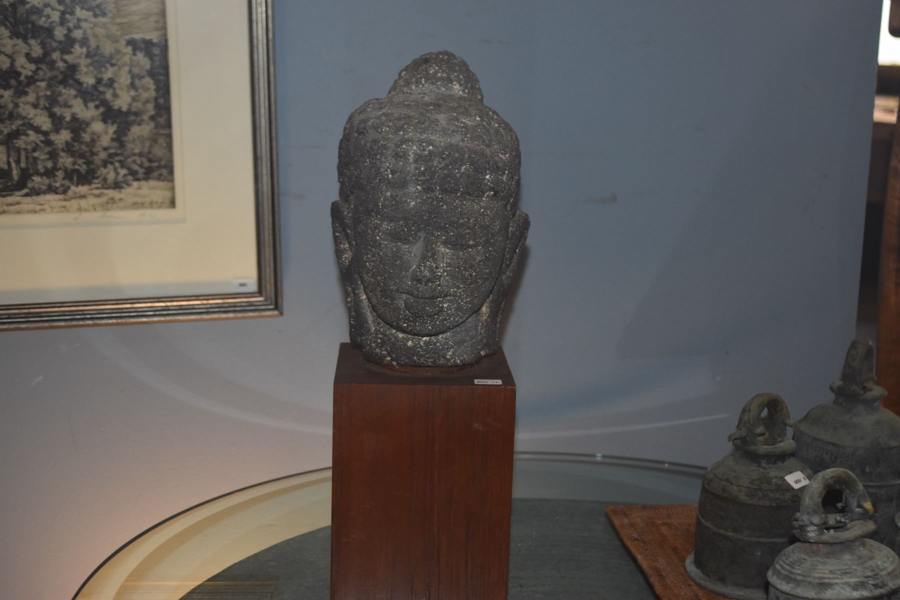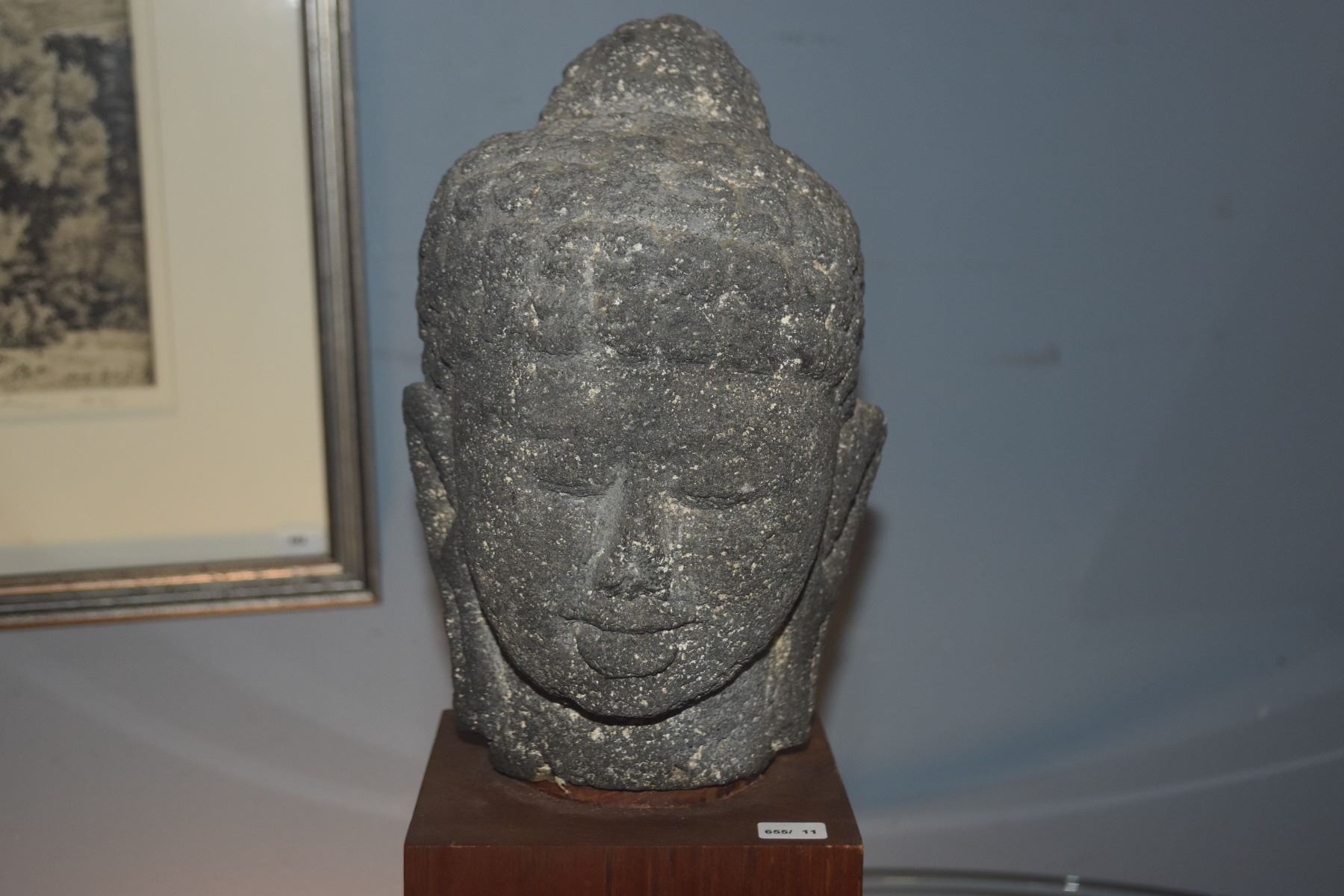 16" STONE BUDDHA HEAD ON WOOD STAND