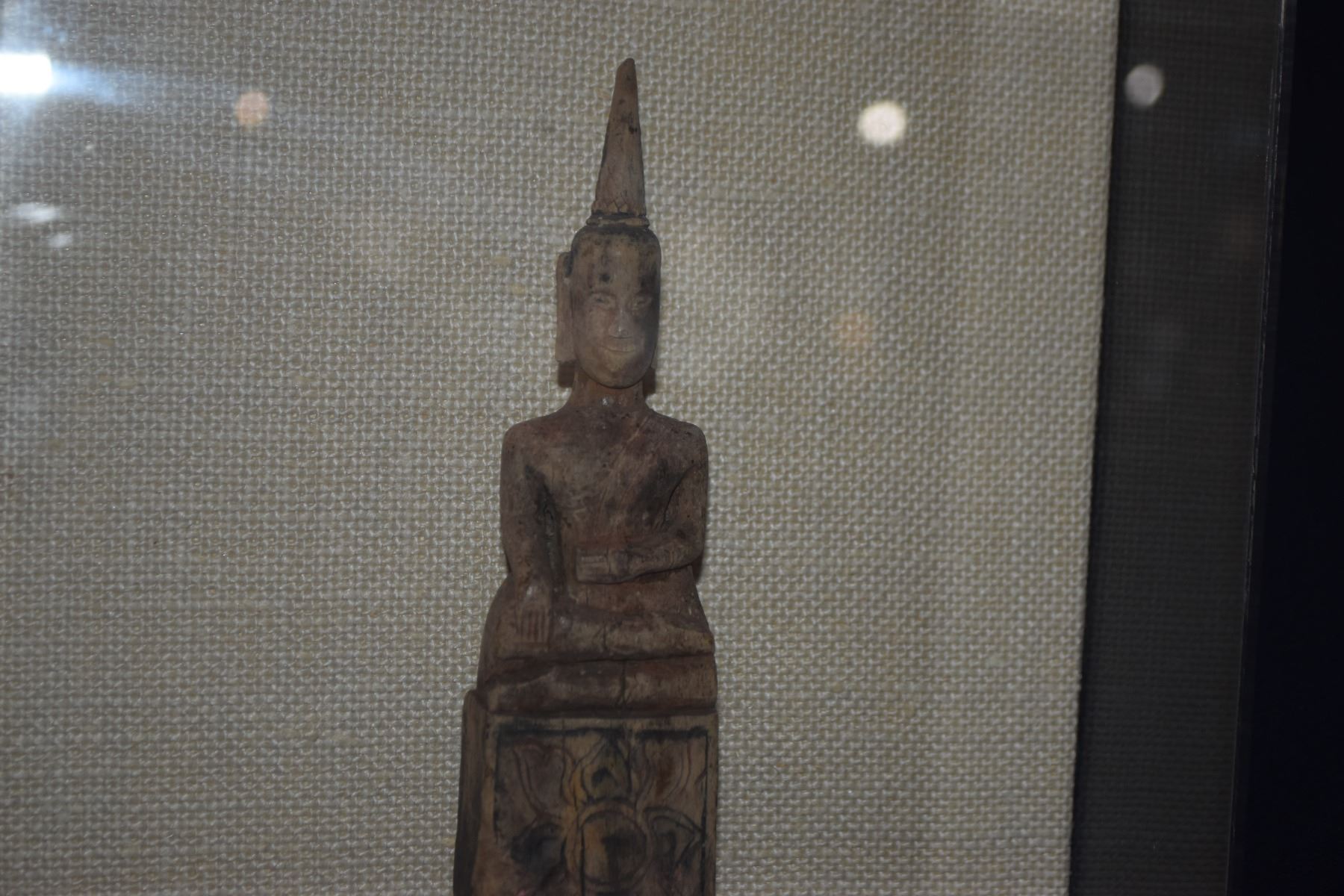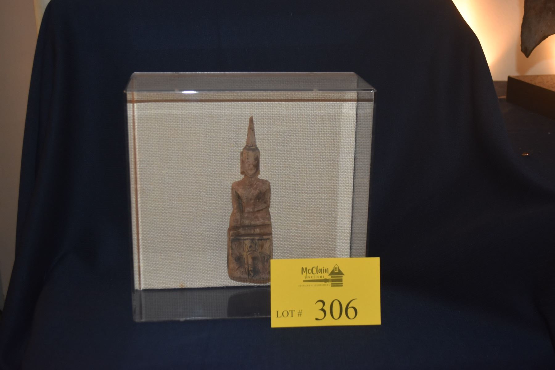 17TH CENTURY WOOD BUDDHA IN PLEXIGLASS DISPLAY CASE (9 1/4" X 9 1/4")