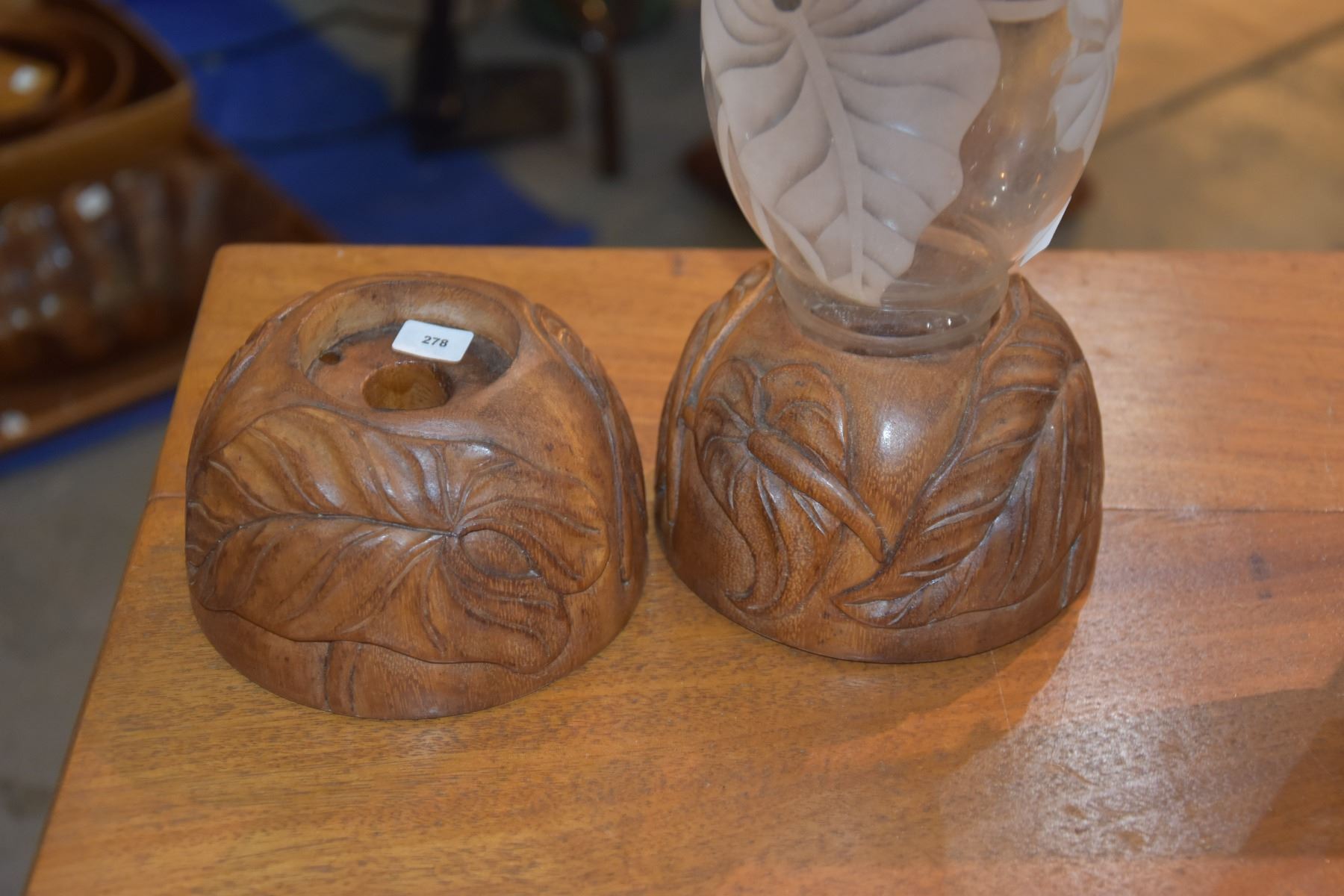 1930'S CARVED ANTHURIUM CANDLE HOLDERS, 1 W/ETCHED HURRICANE GLASS, KATHERINE REID FOR THE WOODROSE SHOP (PAIR)