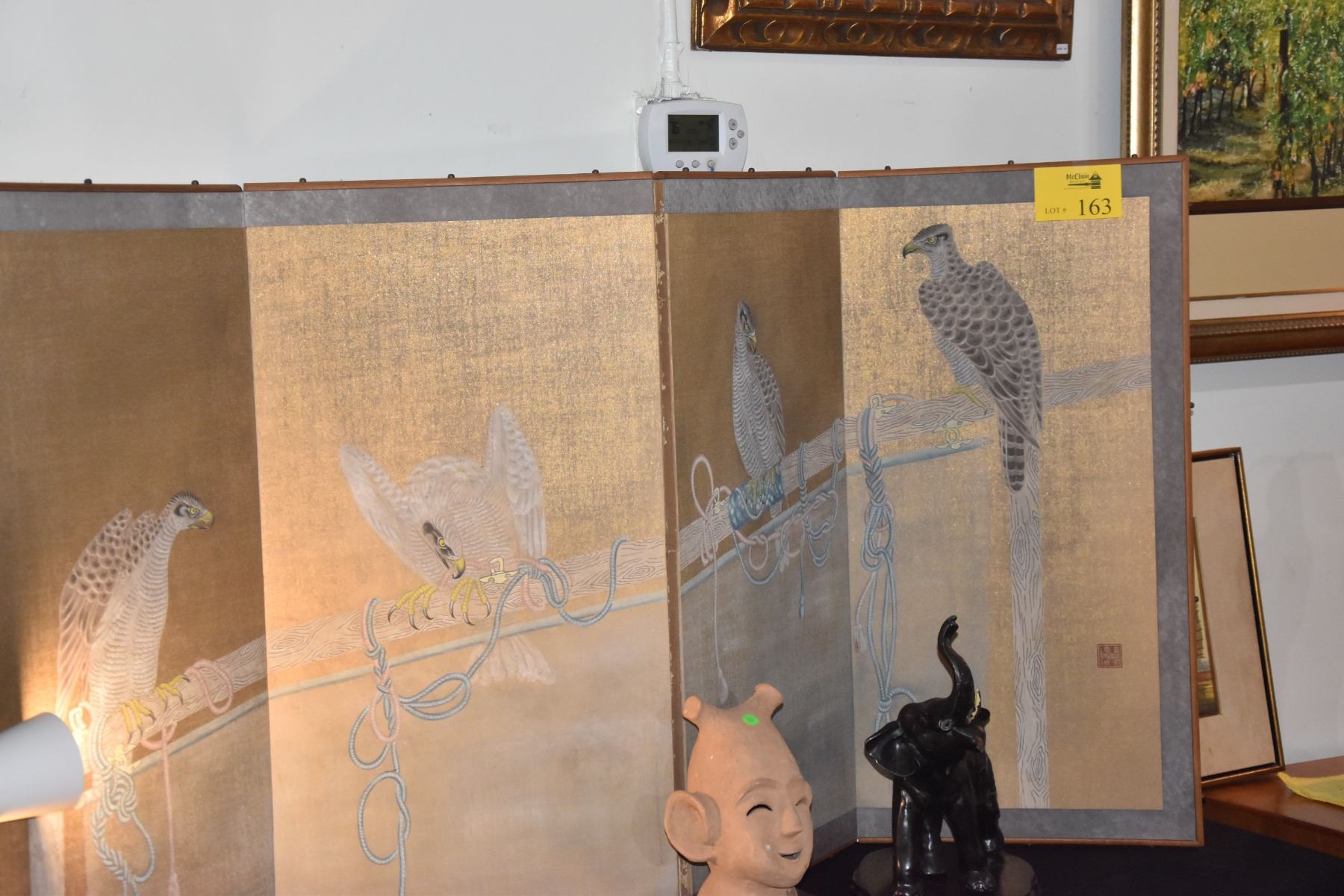 4 PANEL JAPANESE FALCONS SCREEN, POLYCHROME & SIGNED (68" X 34 1/2")