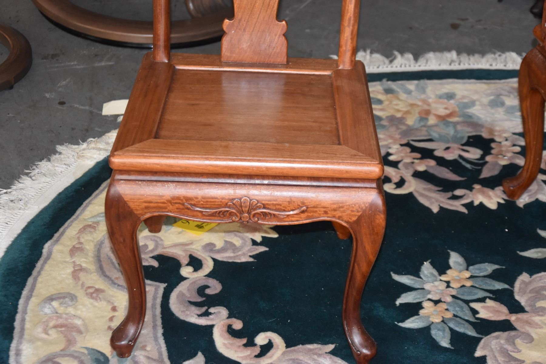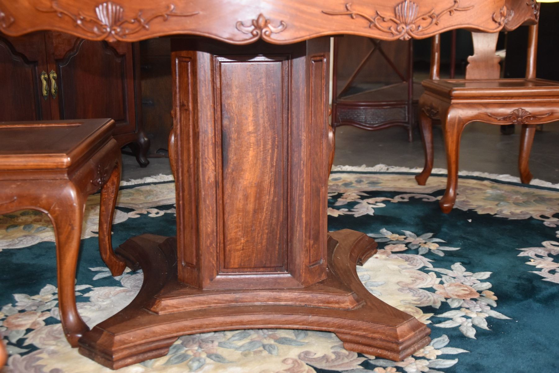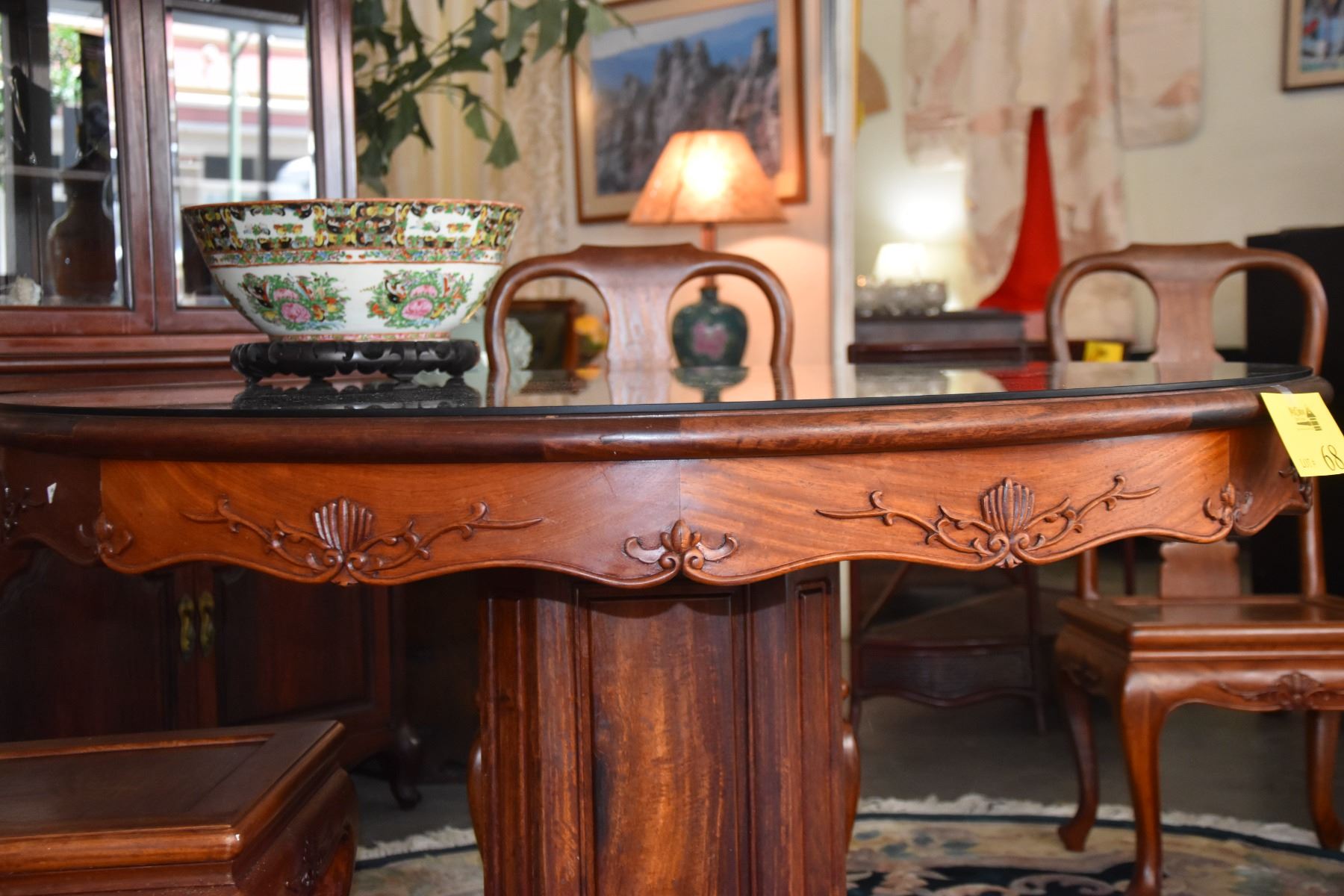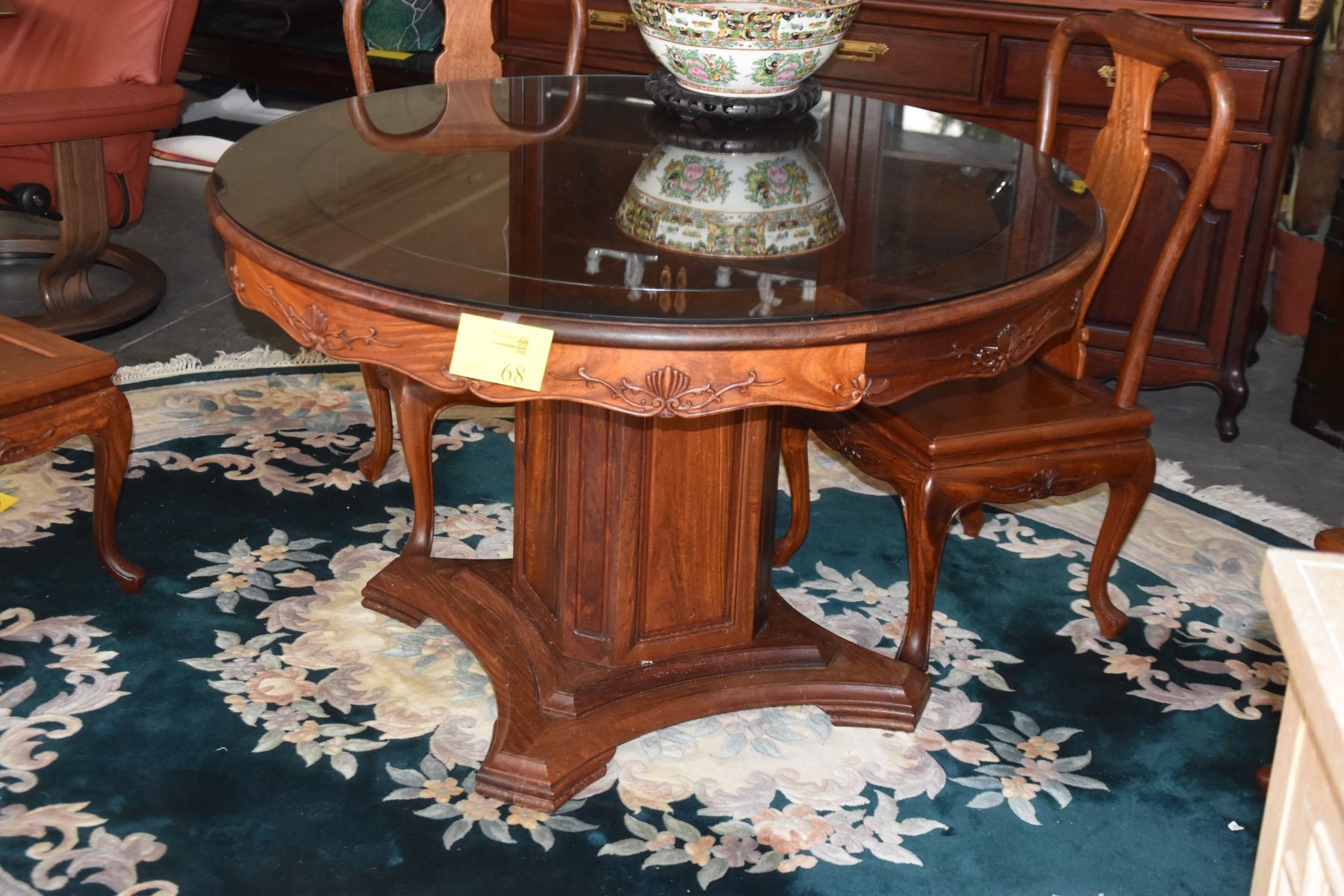 47" CHINESE CARVED ROSEWOOD TABLE W/SHALLOW RELIEF APRON, GLASS TOP & 4 ROSEWOOD CHAIRS (5 PCS)
