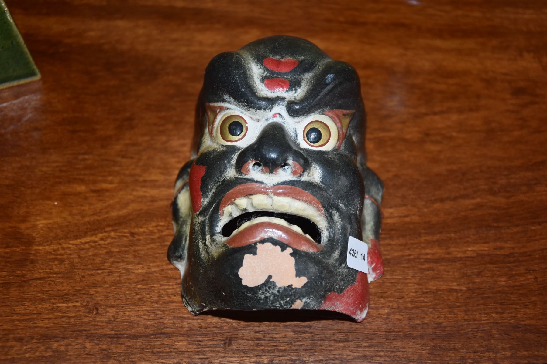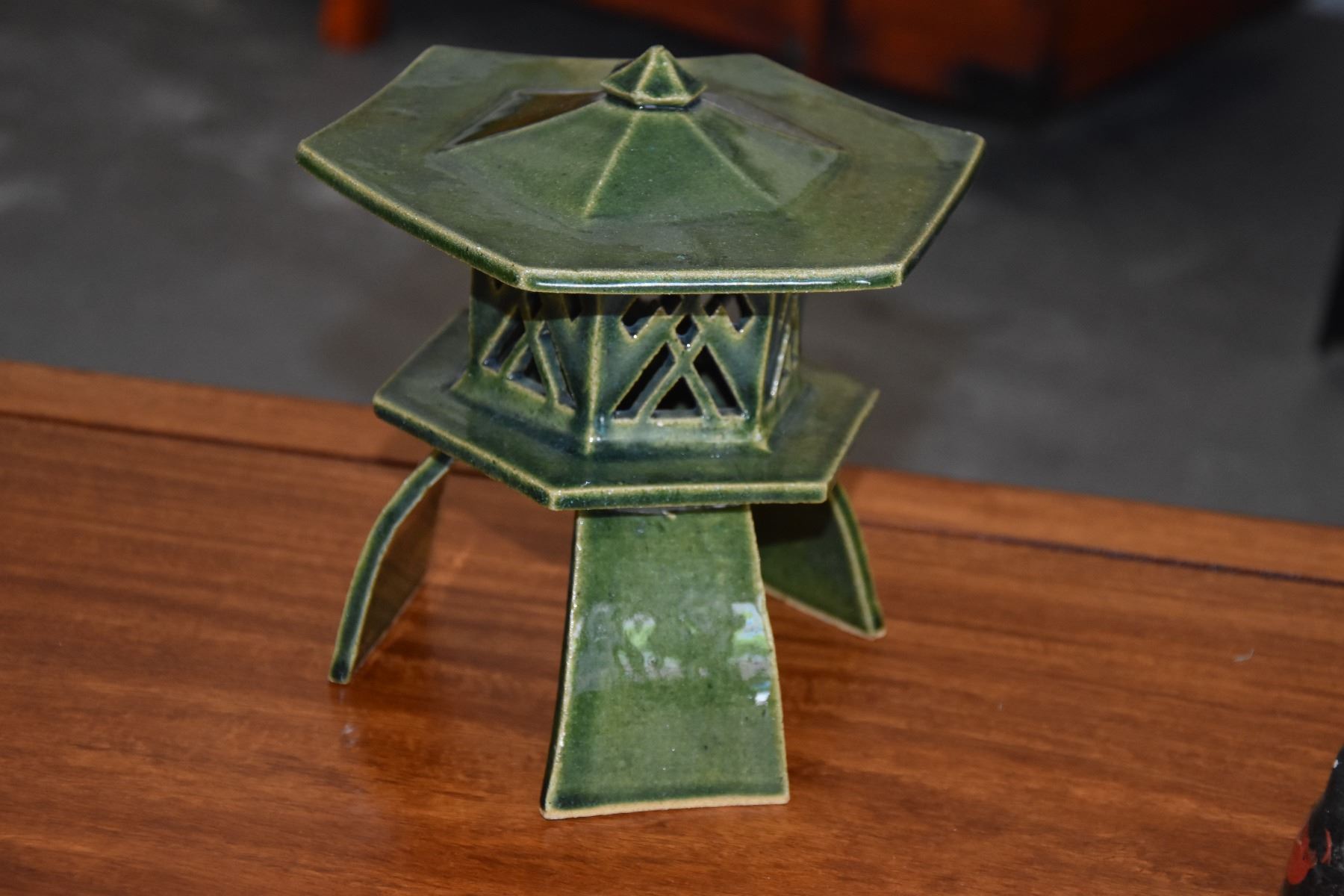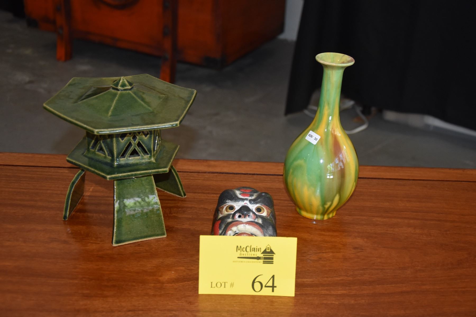 7" GREEN GLAZED CERAMIC ISHIDORO (LANTERN), GREEN, YELLOW & BROWN CERAMIC VASE; SIGNED & TERRA COTTA ONI MASK (6") (3 PCS)