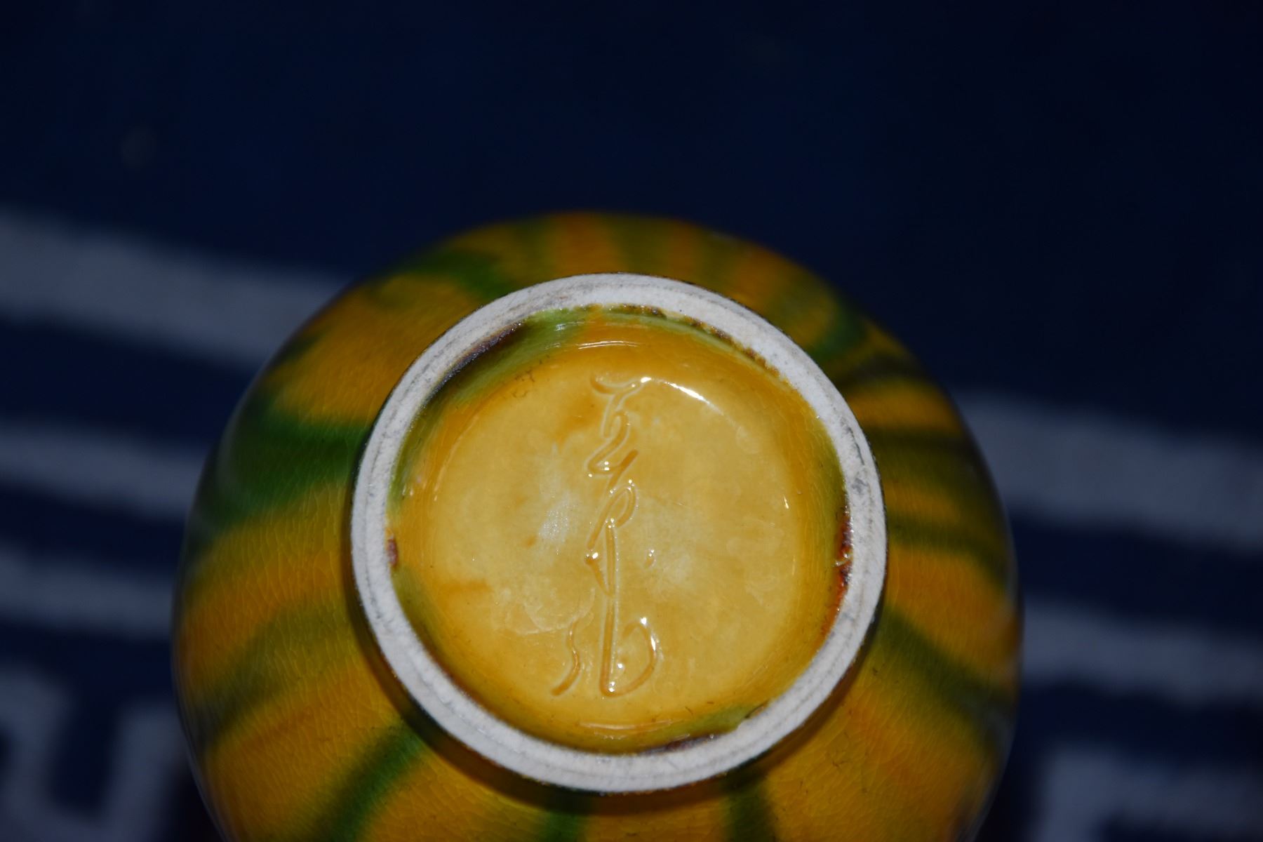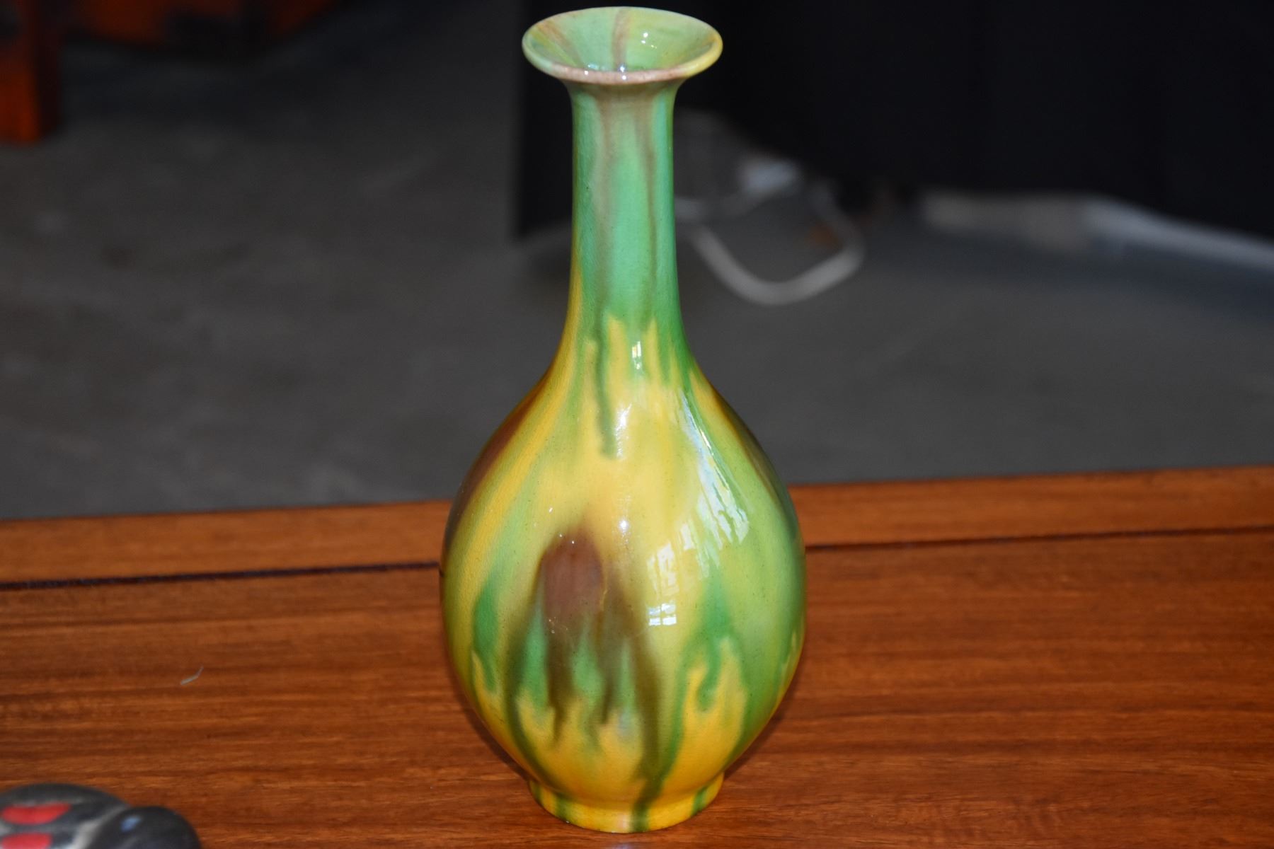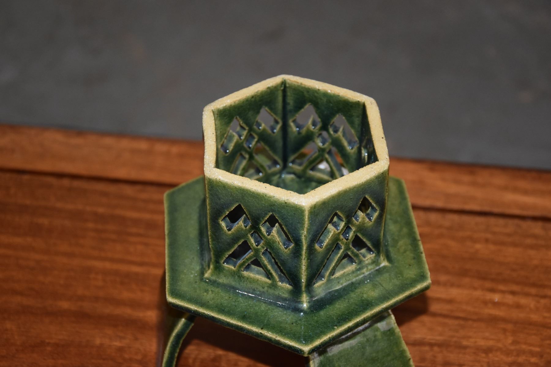 7" GREEN GLAZED CERAMIC ISHIDORO (LANTERN), GREEN, YELLOW & BROWN CERAMIC VASE; SIGNED & TERRA COTTA ONI MASK (6") (3 PCS)