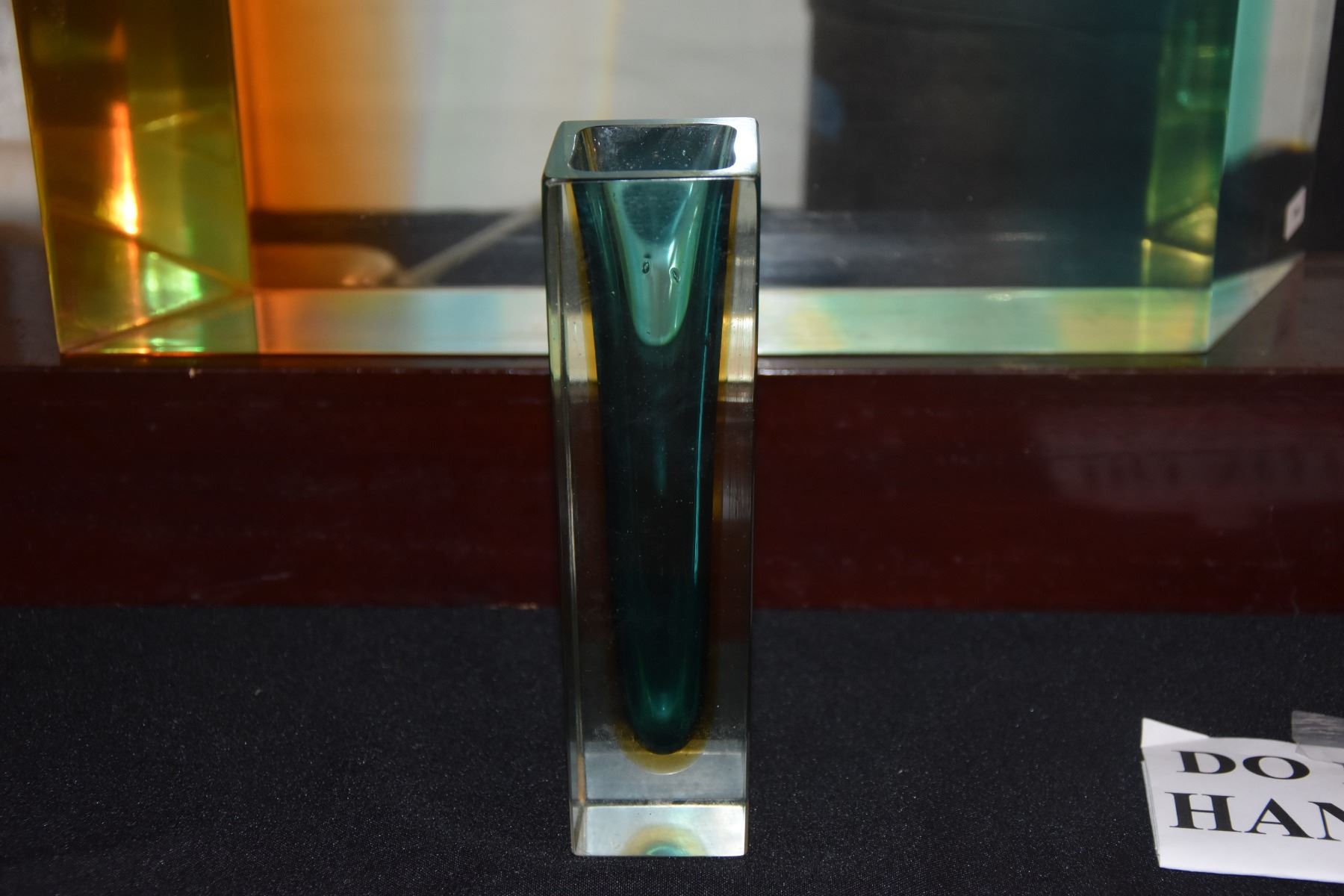 ACRYLIC CUBE ABSTRACT SCULPTURE; SIGNED DENNIS BYNG '78 & 2 CRYSTAL VASES (3 PCS) (DOES NOT INCLUDE STAND)