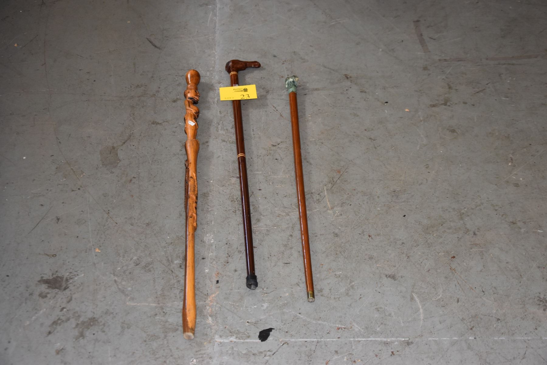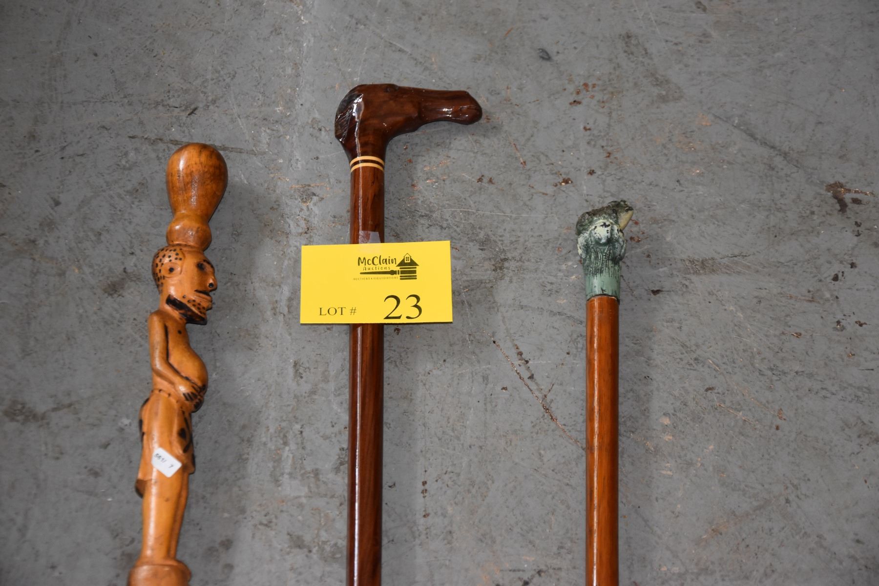 AFRICAN CARVED WOOD CANE, WOOD CANE W/HORSE HEAD & CANE W/FROG MOTIF (3 PCS)
