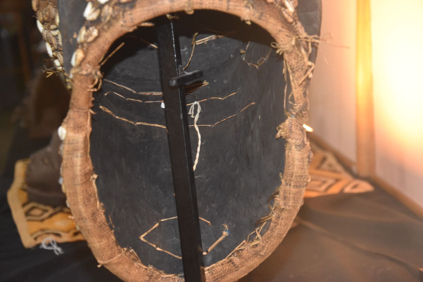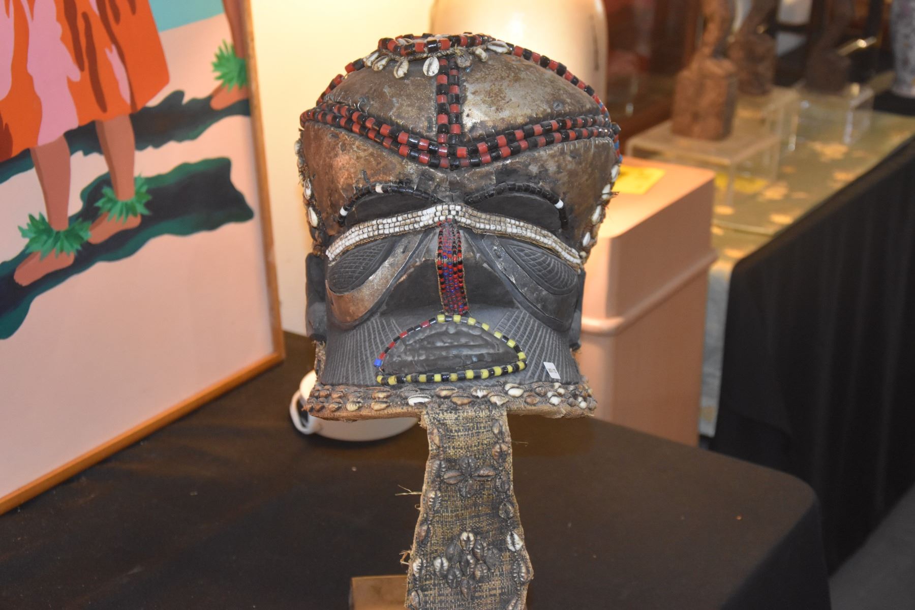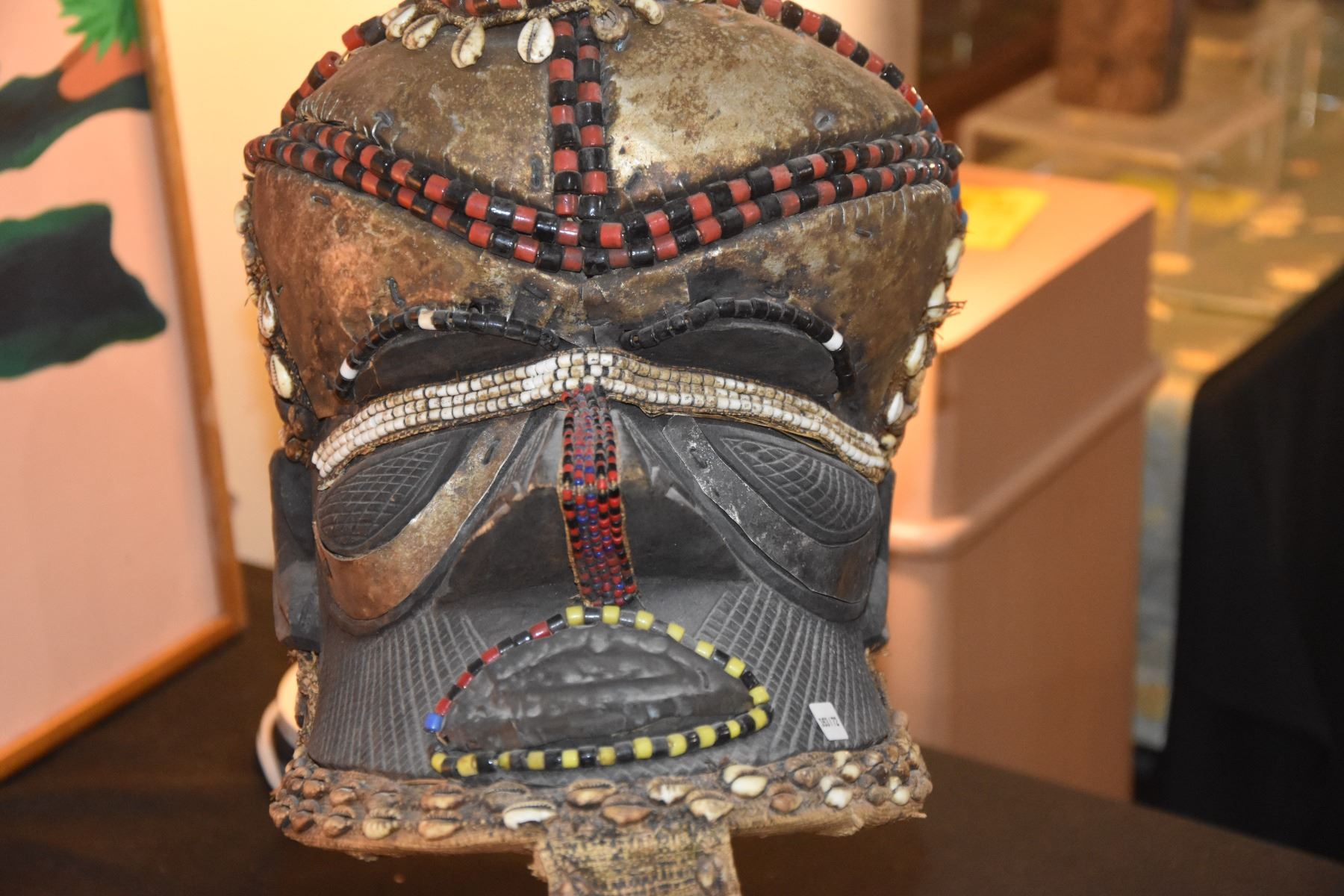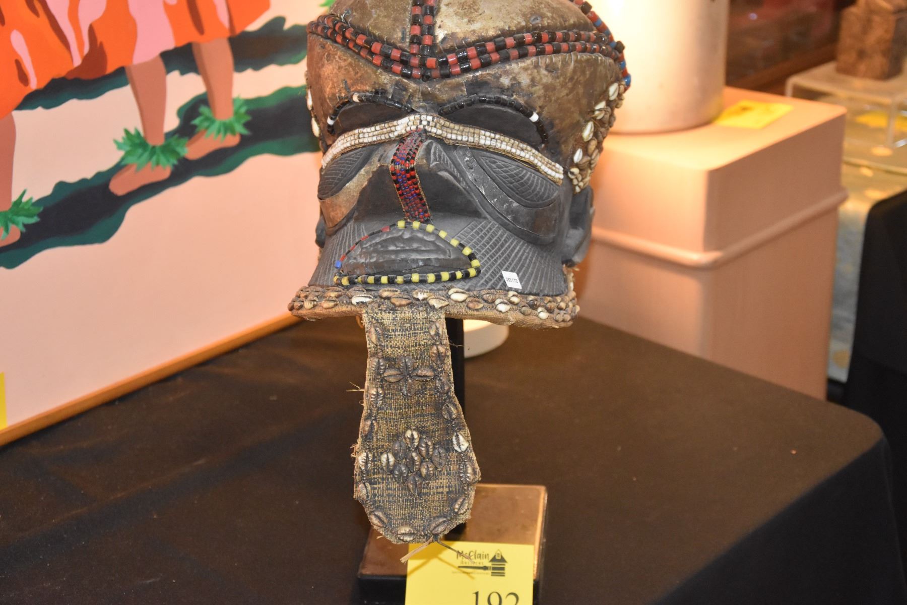 AFRICAN TRIBAL HELMET MASK W/SHELLS & BEADS ON STAND