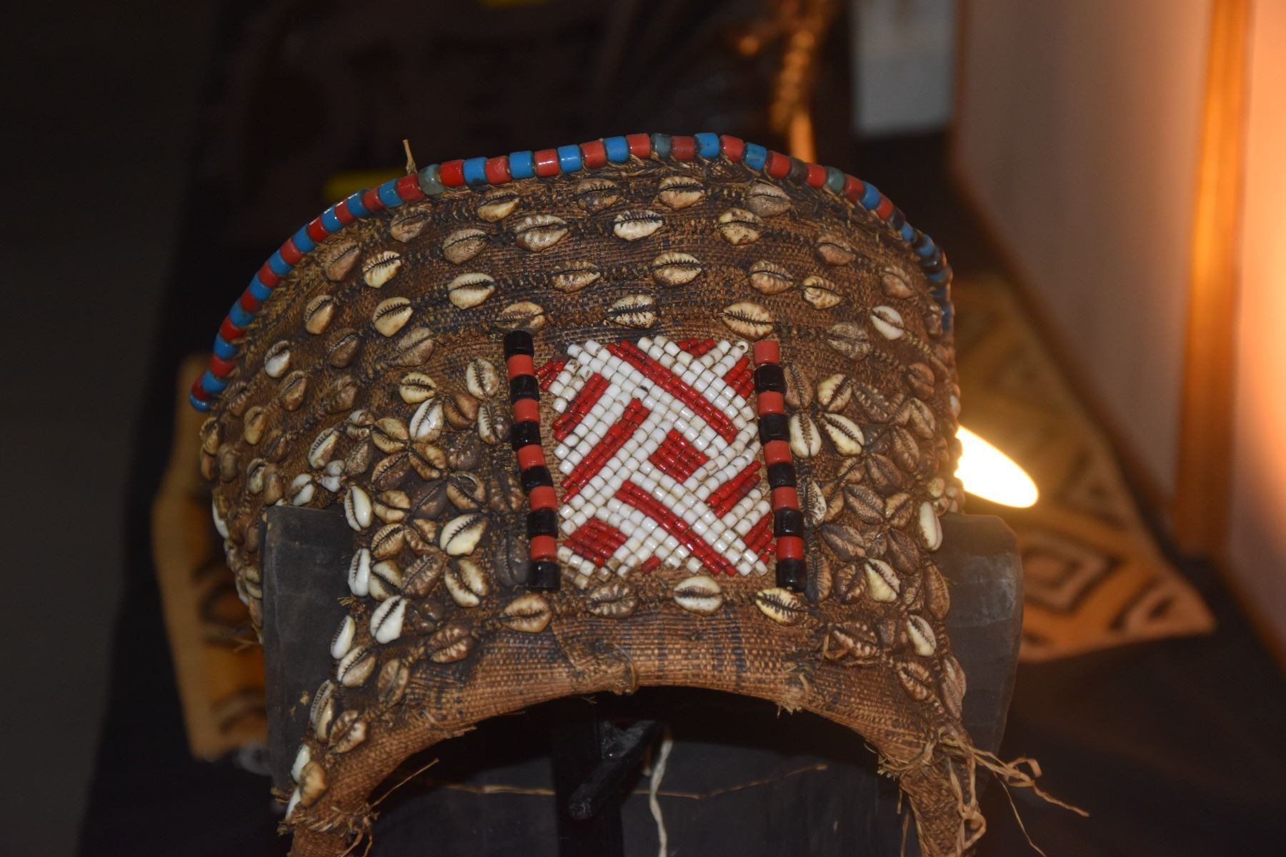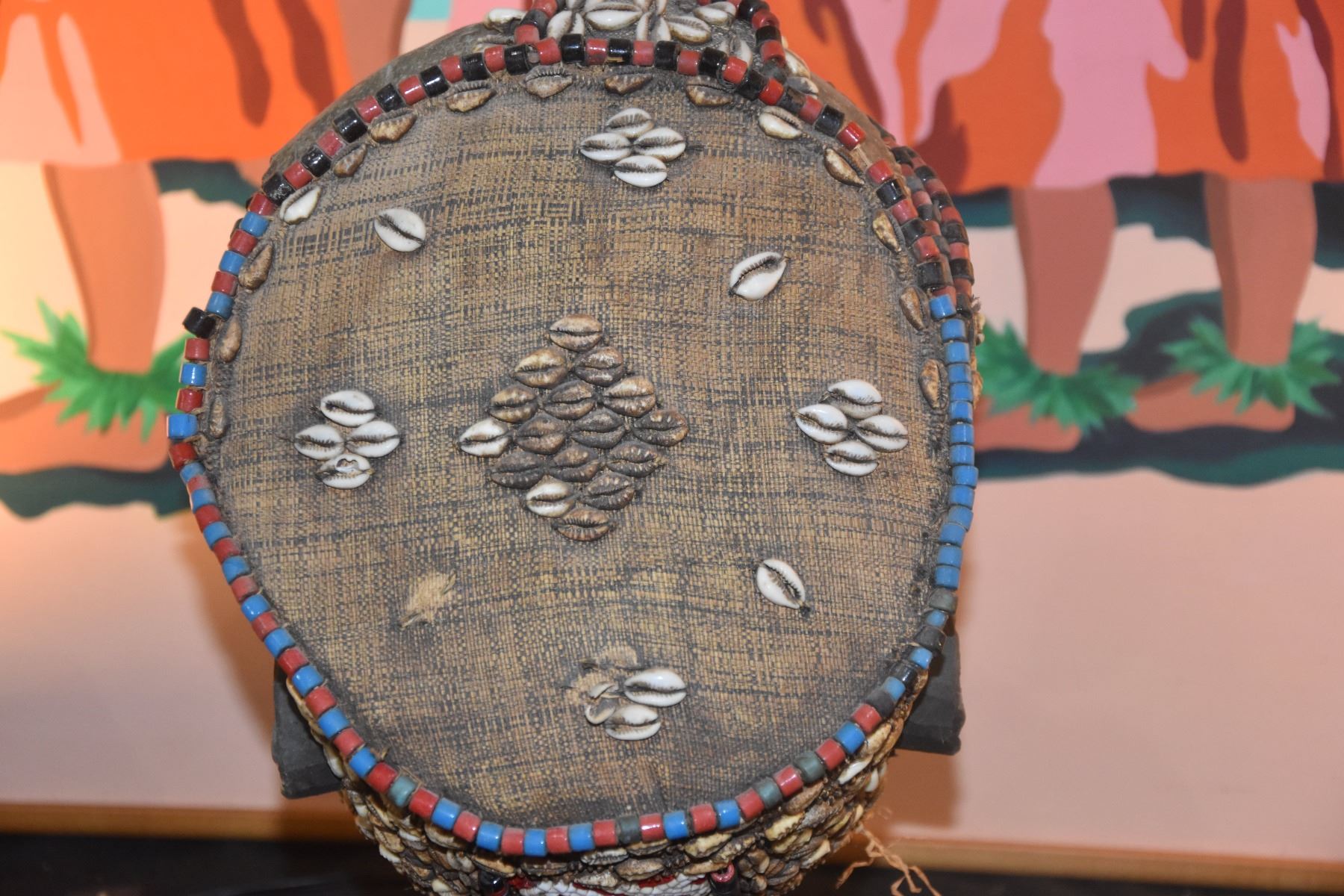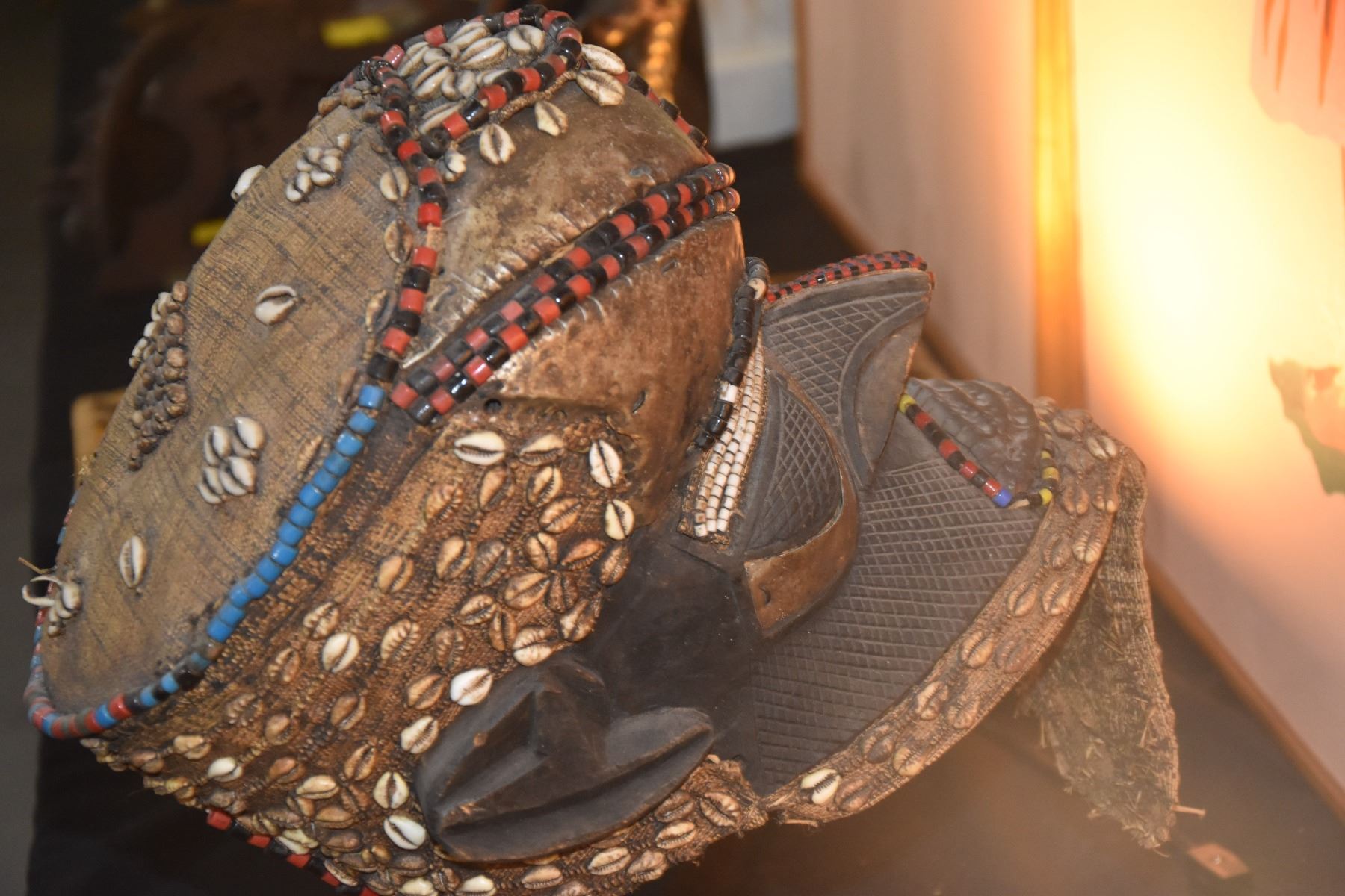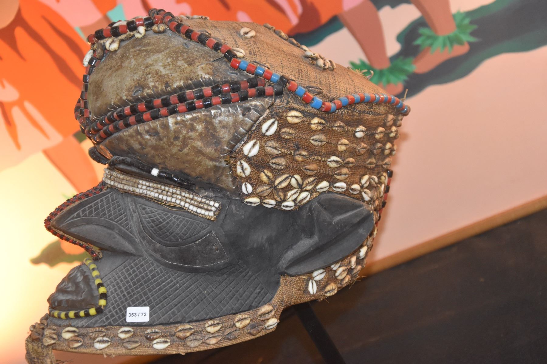 AFRICAN TRIBAL HELMET MASK W/SHELLS & BEADS ON STAND