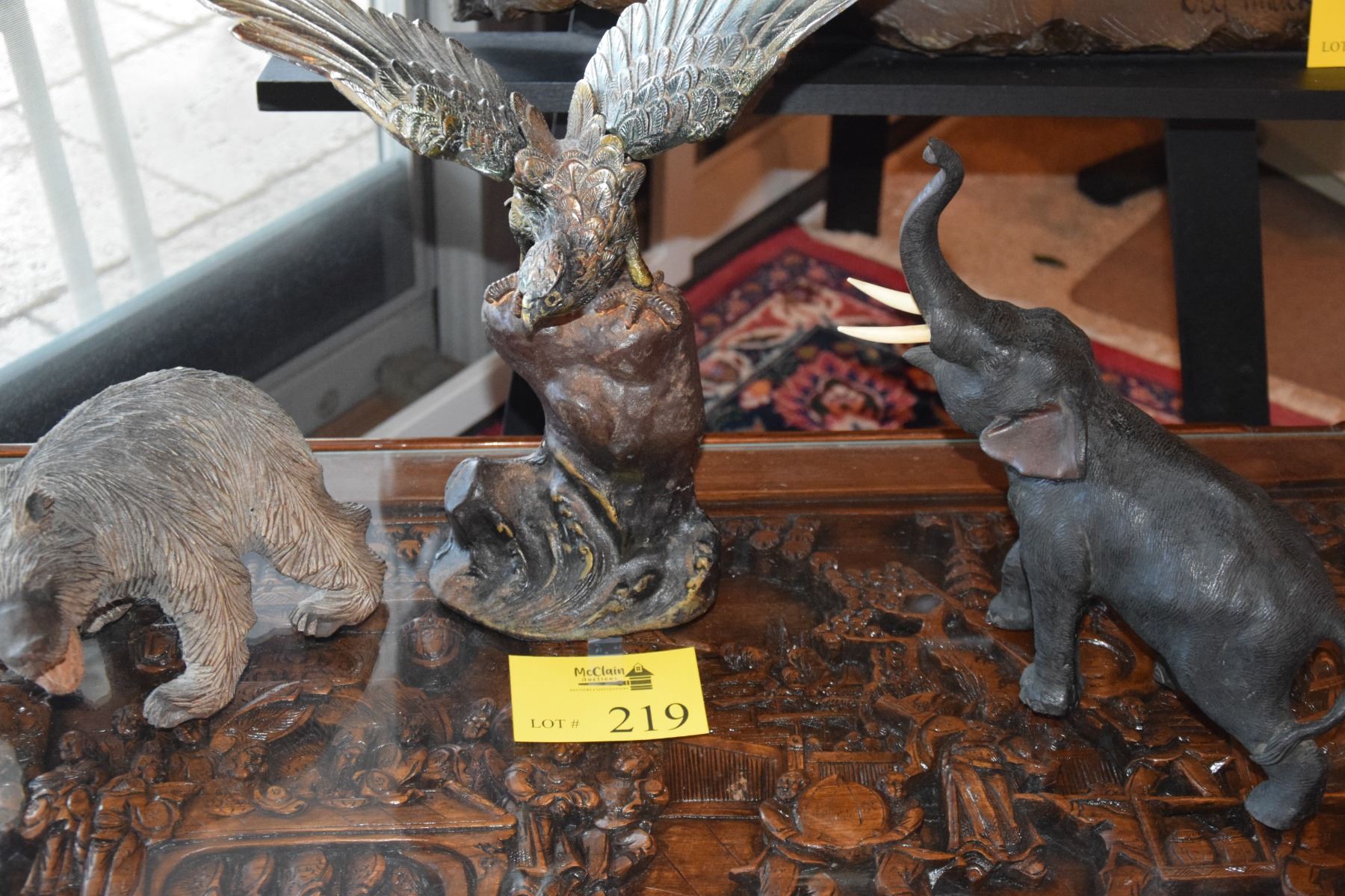 ANIMAL STATUARY: WOOD BEAR, BRONZE EAGLE & BRONZE ELEPHANT (3 PCS)