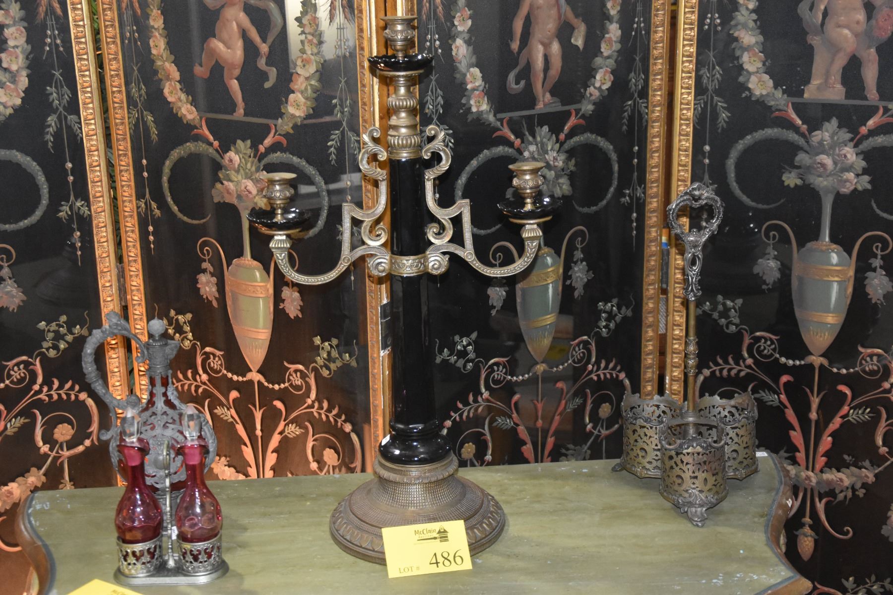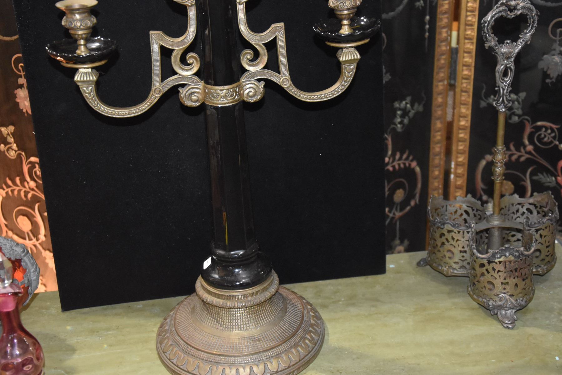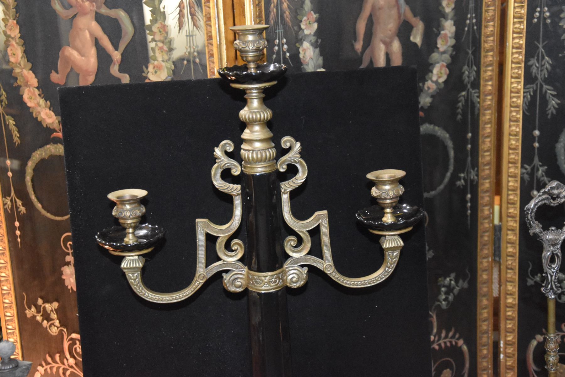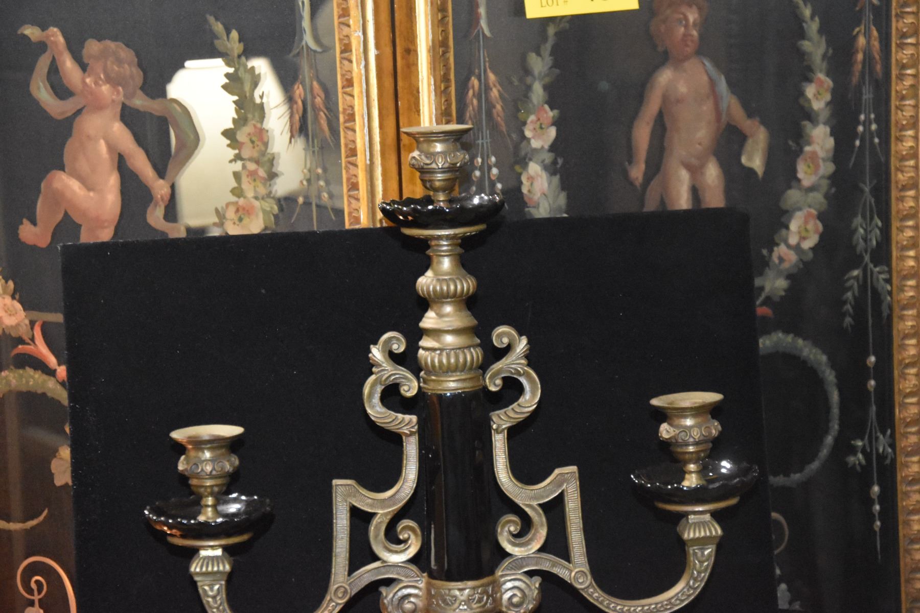 ANTIQUE 3-ARM PORCELAIN & BRASS CANDELABRA (26" X 15")