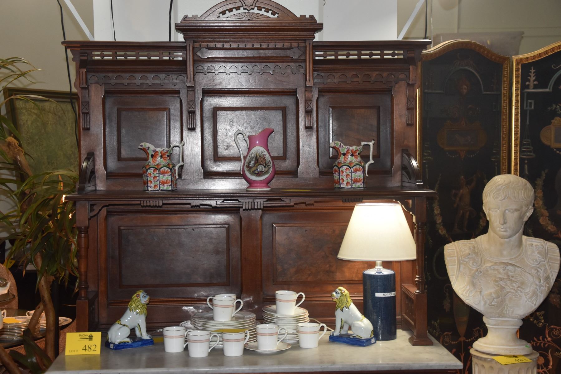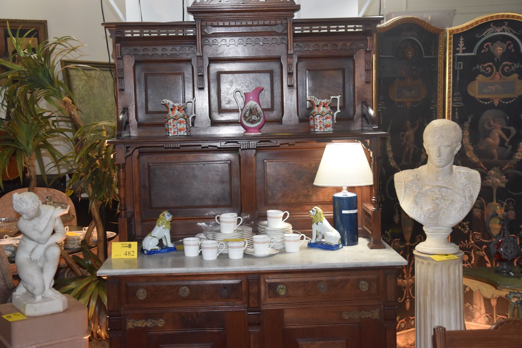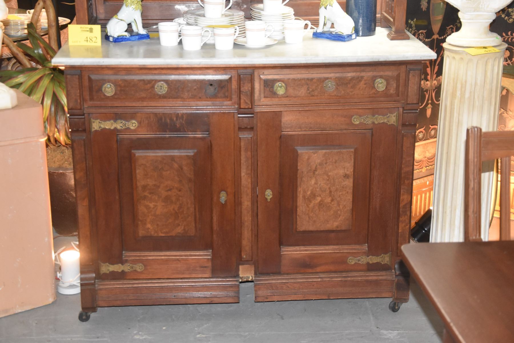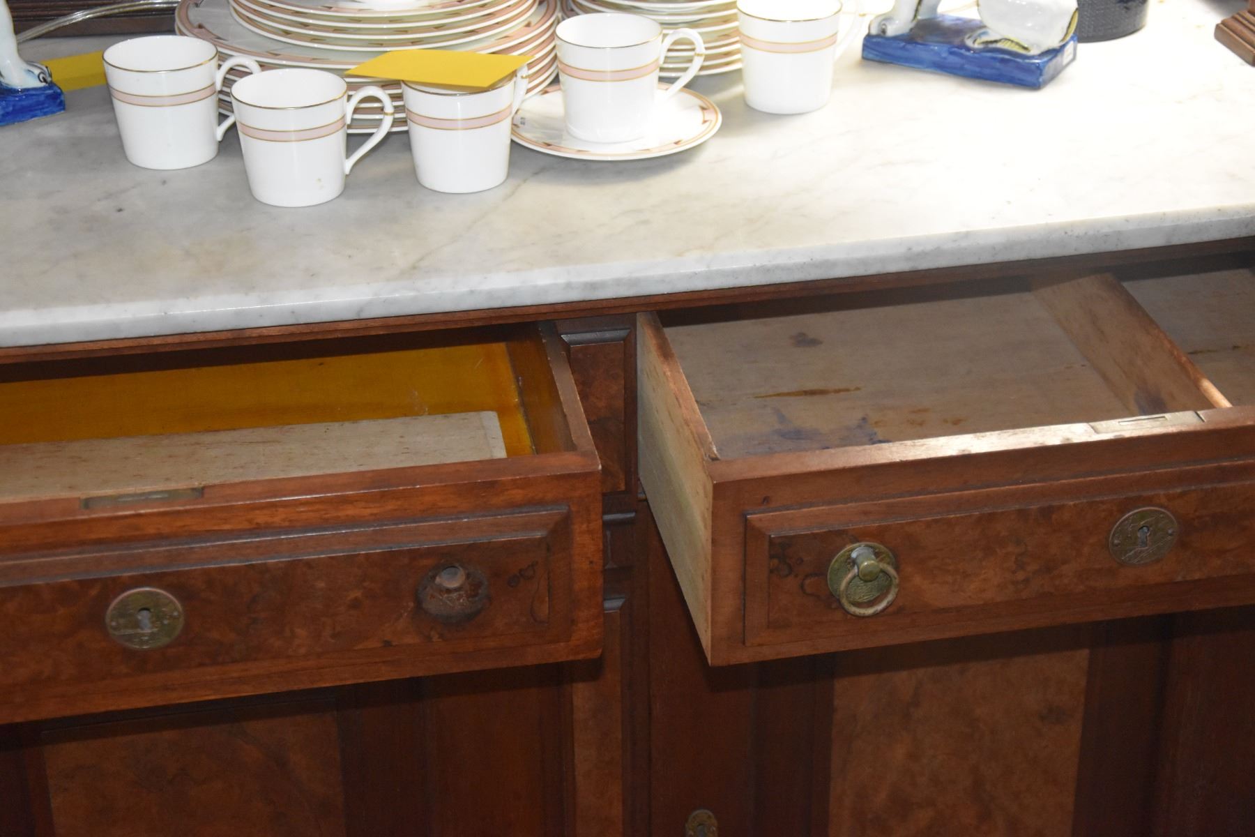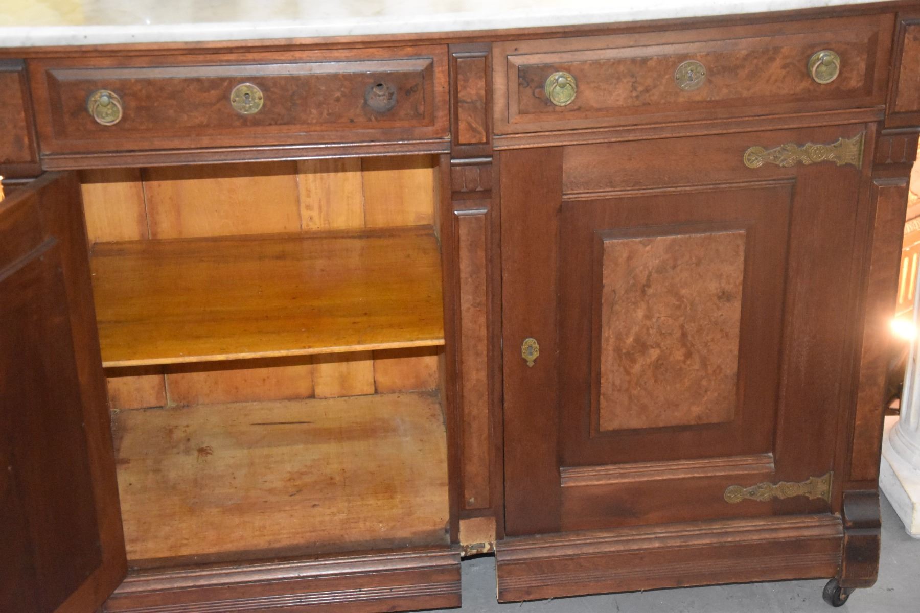ANTIQUE AMERICAN 19TH CENTURY EASTLAKE STYLE BUFFET SERVER W/MARBLE TOP, THE UPPER SECTION W/TALL SHELF SUPPORTED ON TURNED PILLAR STILES & BURL PANELS W/2 DRAWERS & 2 DOORS ON RAISED CASTERS (48" X 88" X 21 3/4")