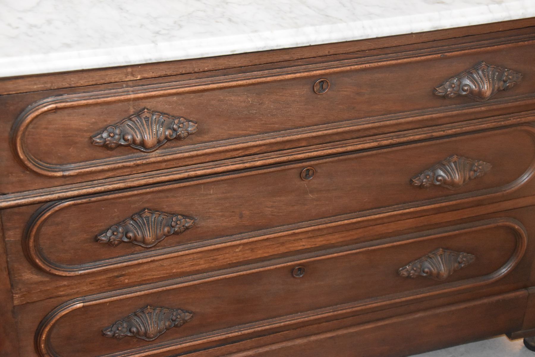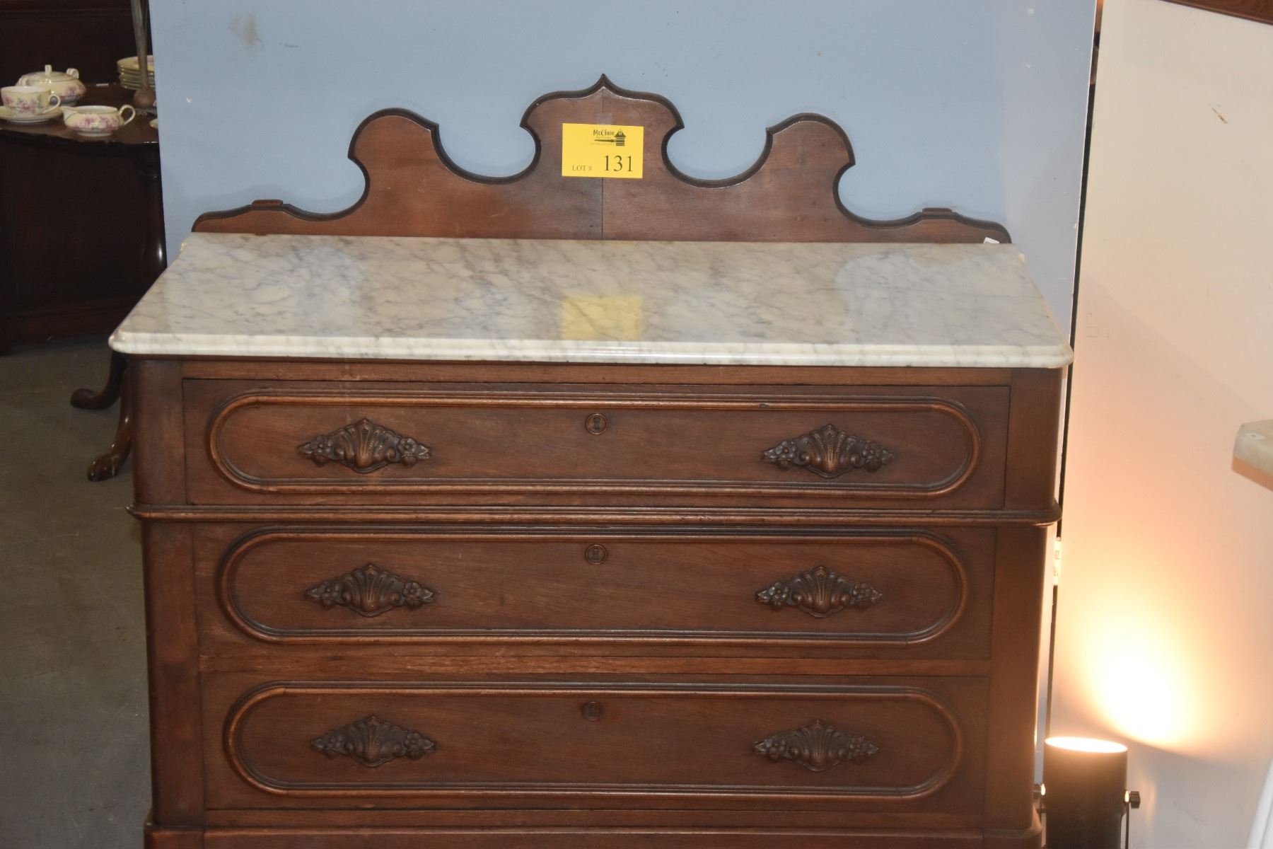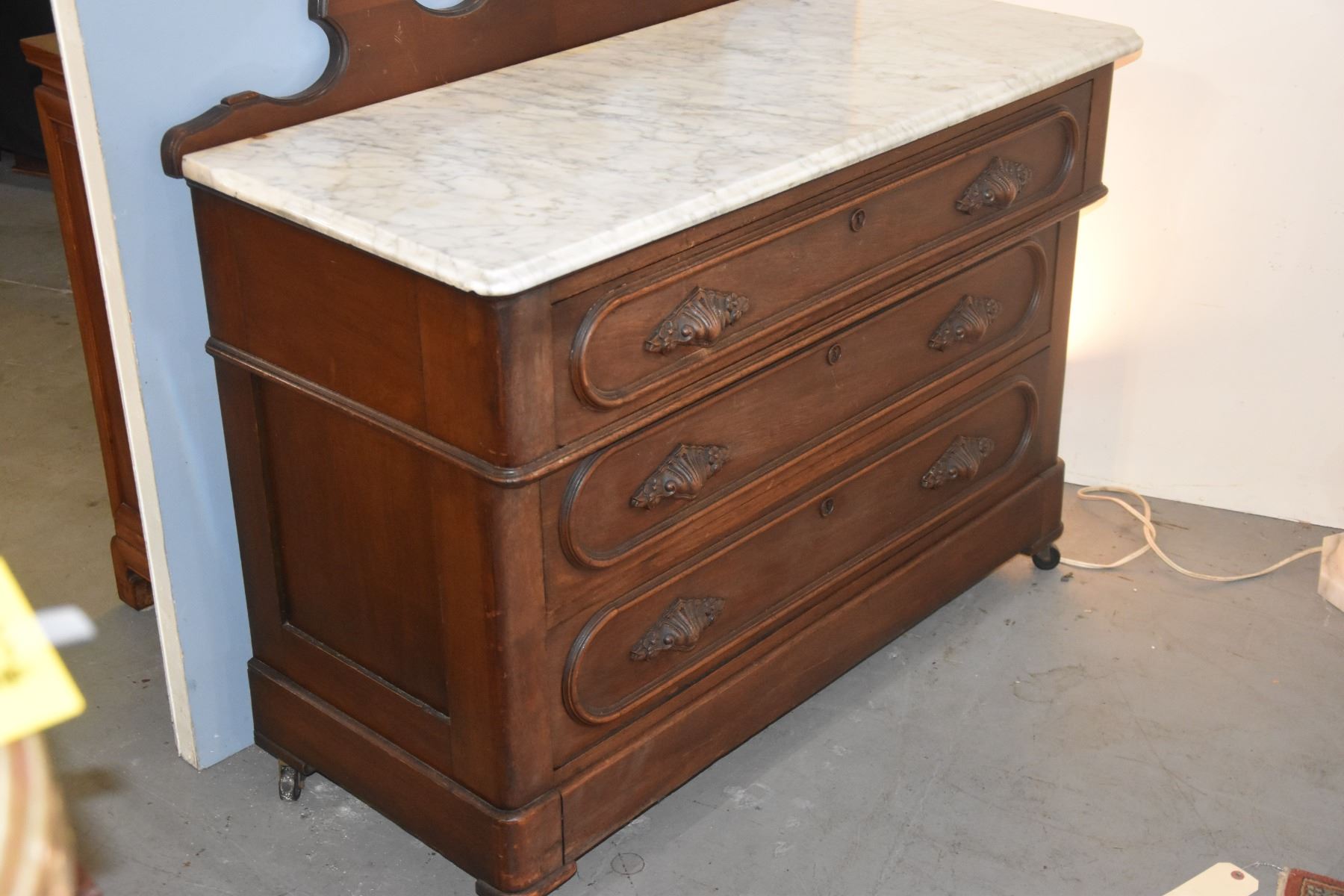 ANTIQUE AMERICAN 19TH CENTURY WALNUT SIDEBOARD W/FIGURED WHITE MARBLE TOP W/3 DRAWERS RAISED ON CASTERS (63" X 24" X 19 3/8")