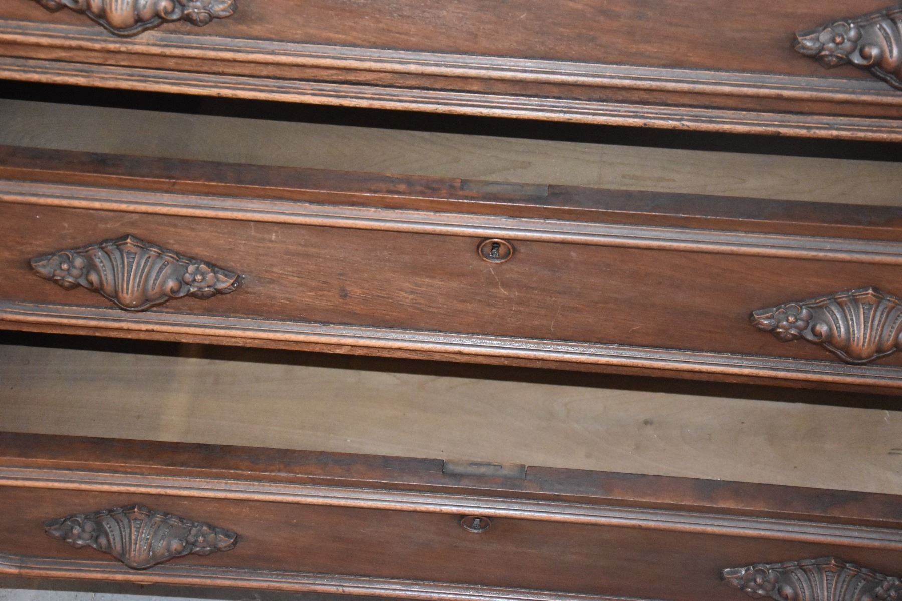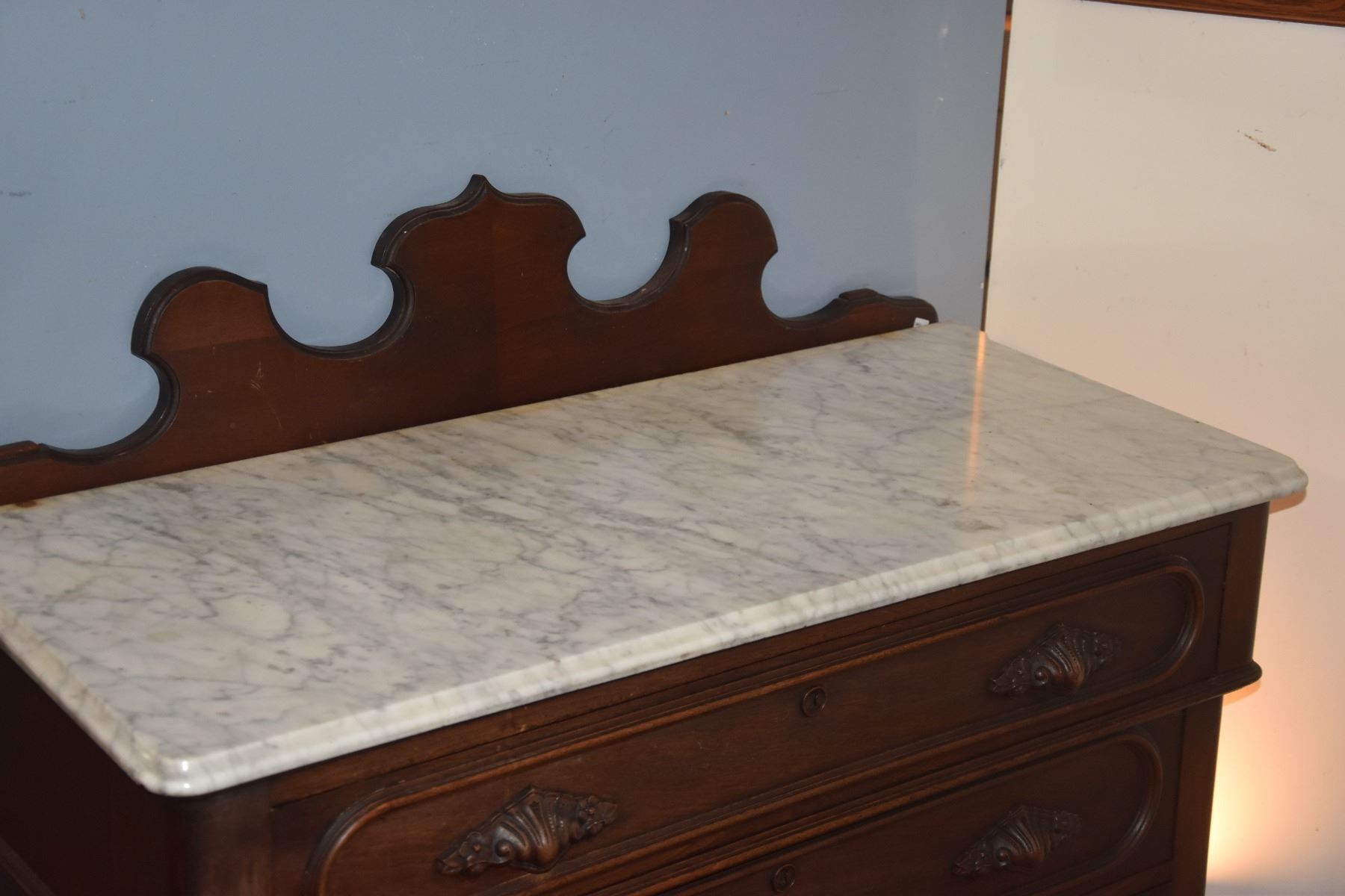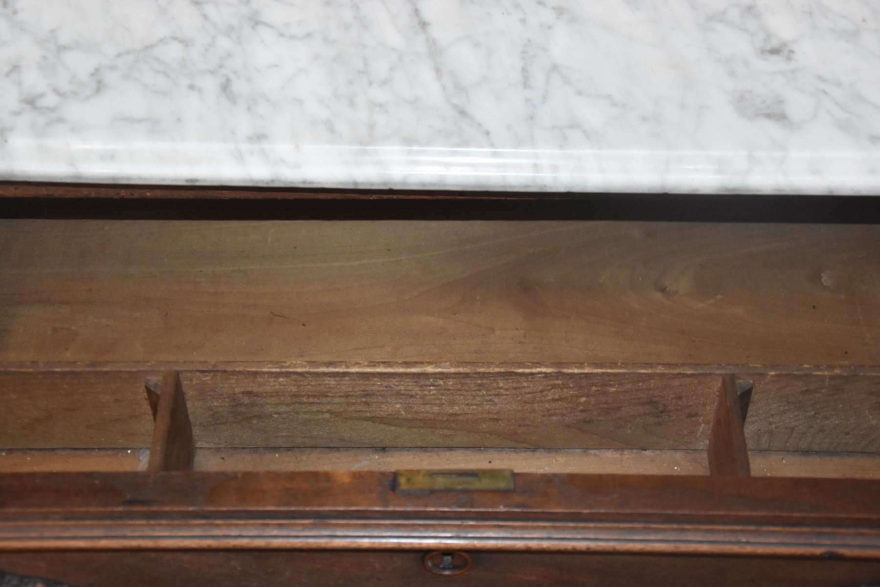 ANTIQUE AMERICAN 19TH CENTURY WALNUT SIDEBOARD W/FIGURED WHITE MARBLE TOP W/3 DRAWERS RAISED ON CASTERS (63" X 24" X 19 3/8")