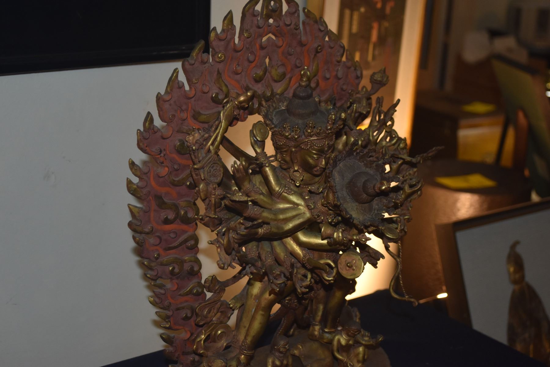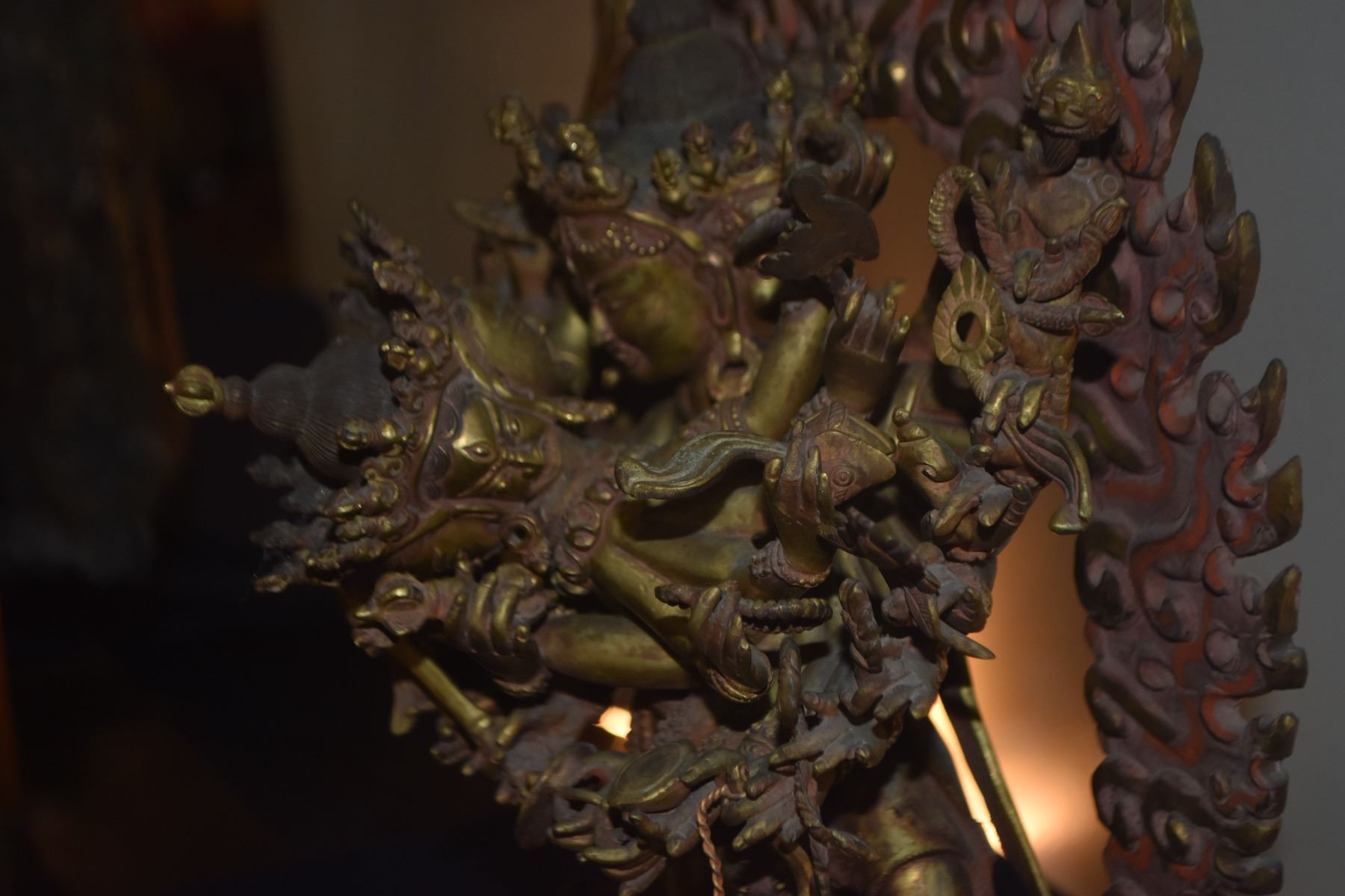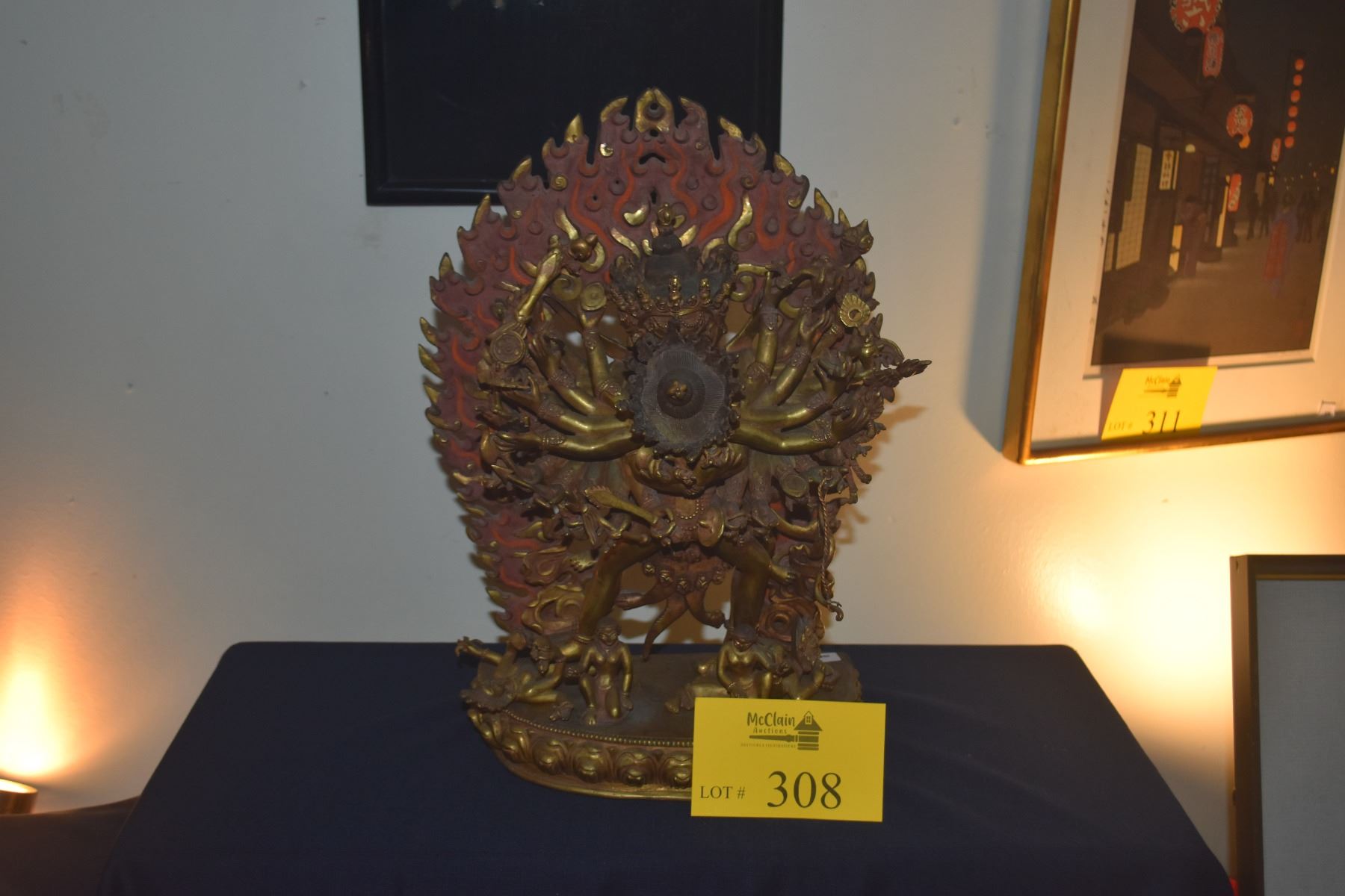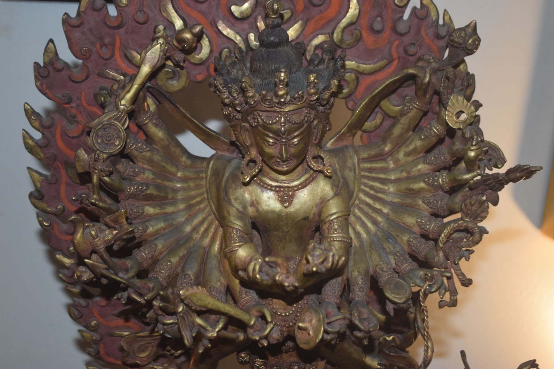 ANTIQUE BRASS NEPAL KALACHAKRA BUDDHA W/FLAME AURA; SIGNED (16")