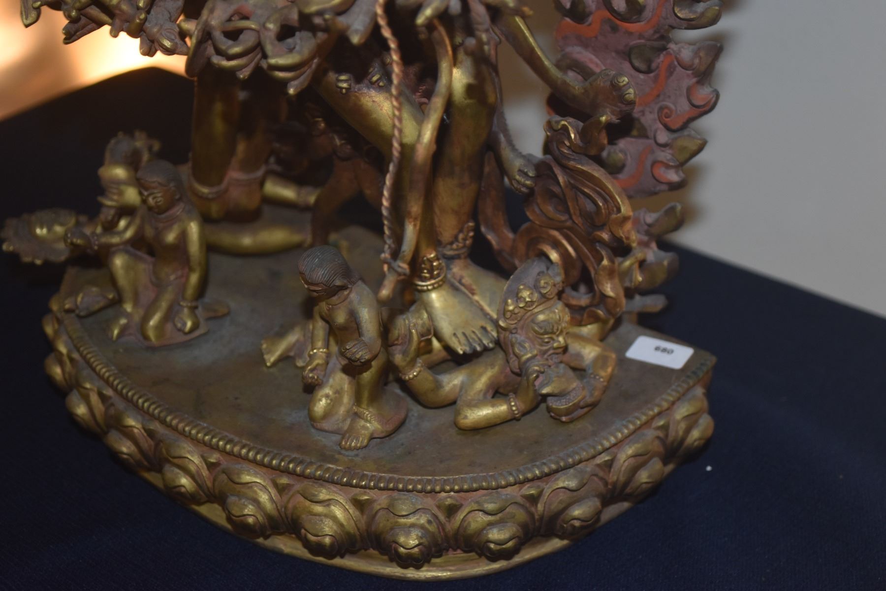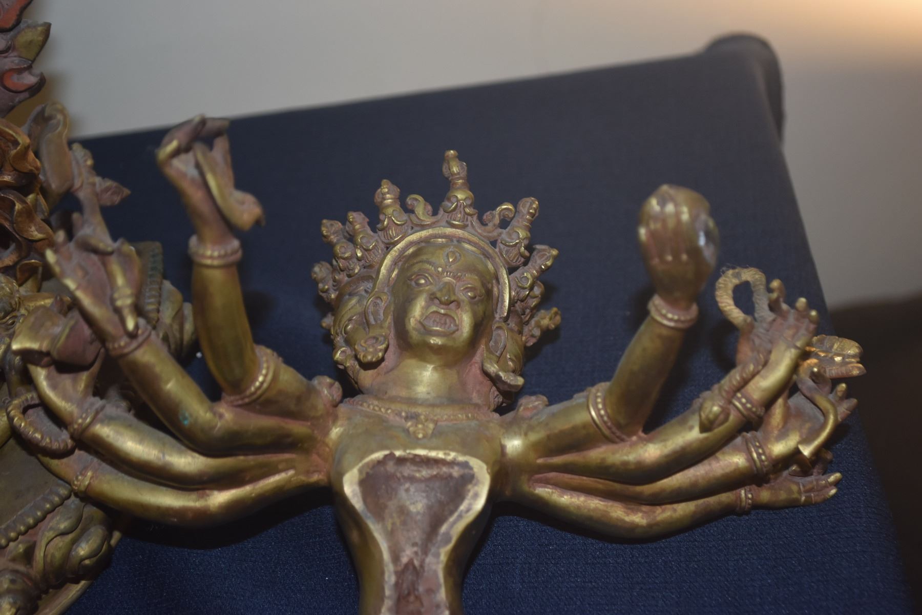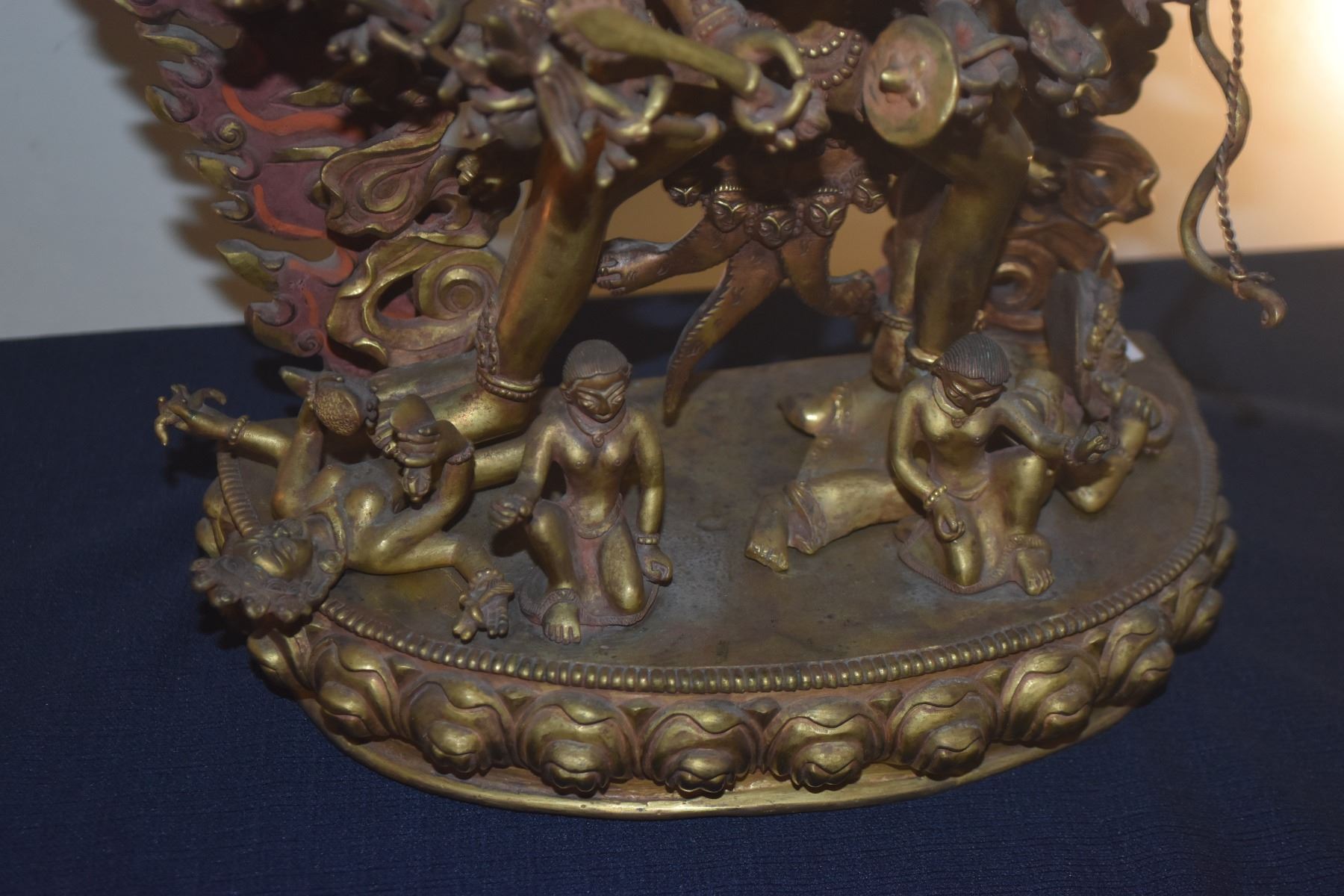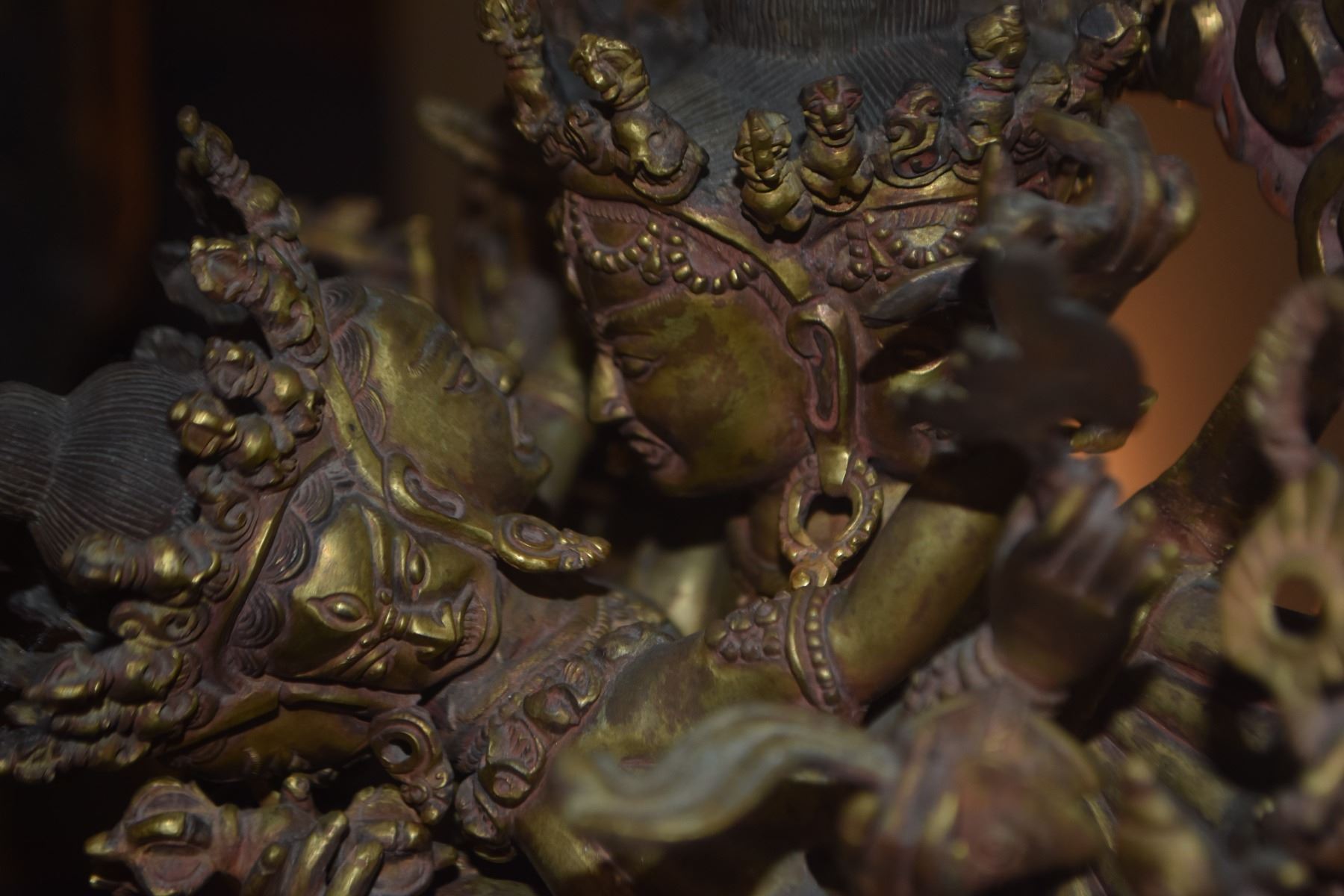 ANTIQUE BRASS NEPAL KALACHAKRA BUDDHA W/FLAME AURA; SIGNED (16")