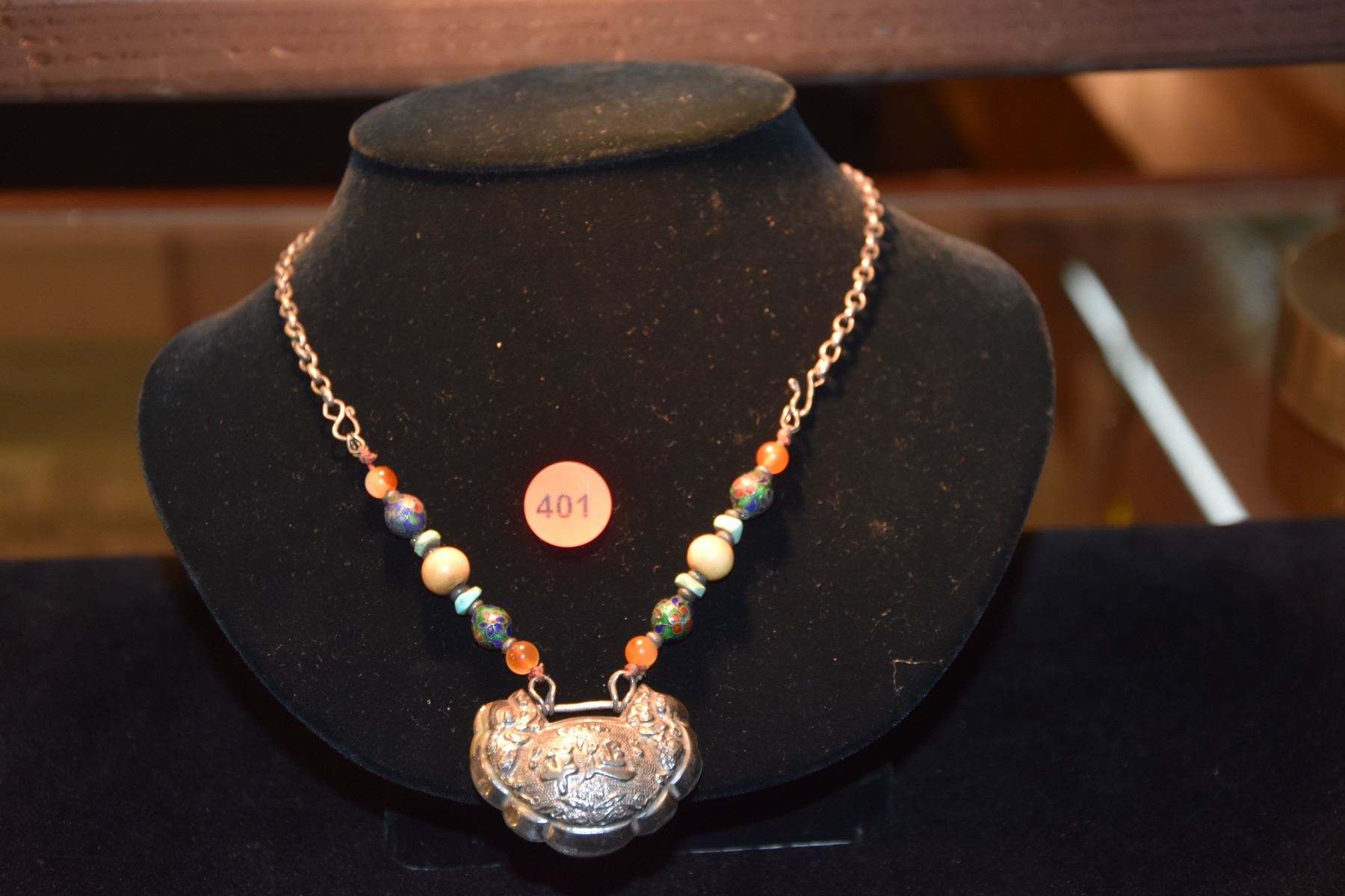 ANTIQUE CHINESE AMULET ON SILVER & ANTIQUE BEAD CHAIN