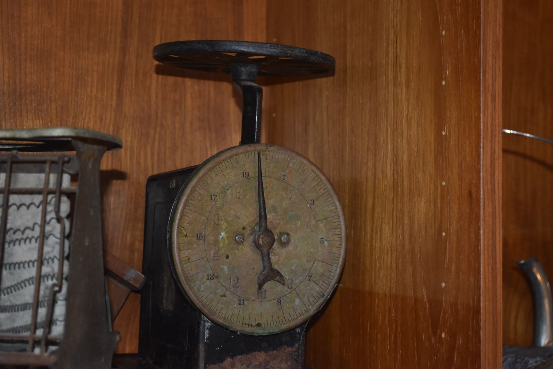 ANTIQUE ELECTRIC TOASTER (NO CORD), ANTIQUE BUTTER CHURN, ANTIQUE KITCHEN SCALE & ANTIQUE WOODEN MANDOLINE (4 PCS)