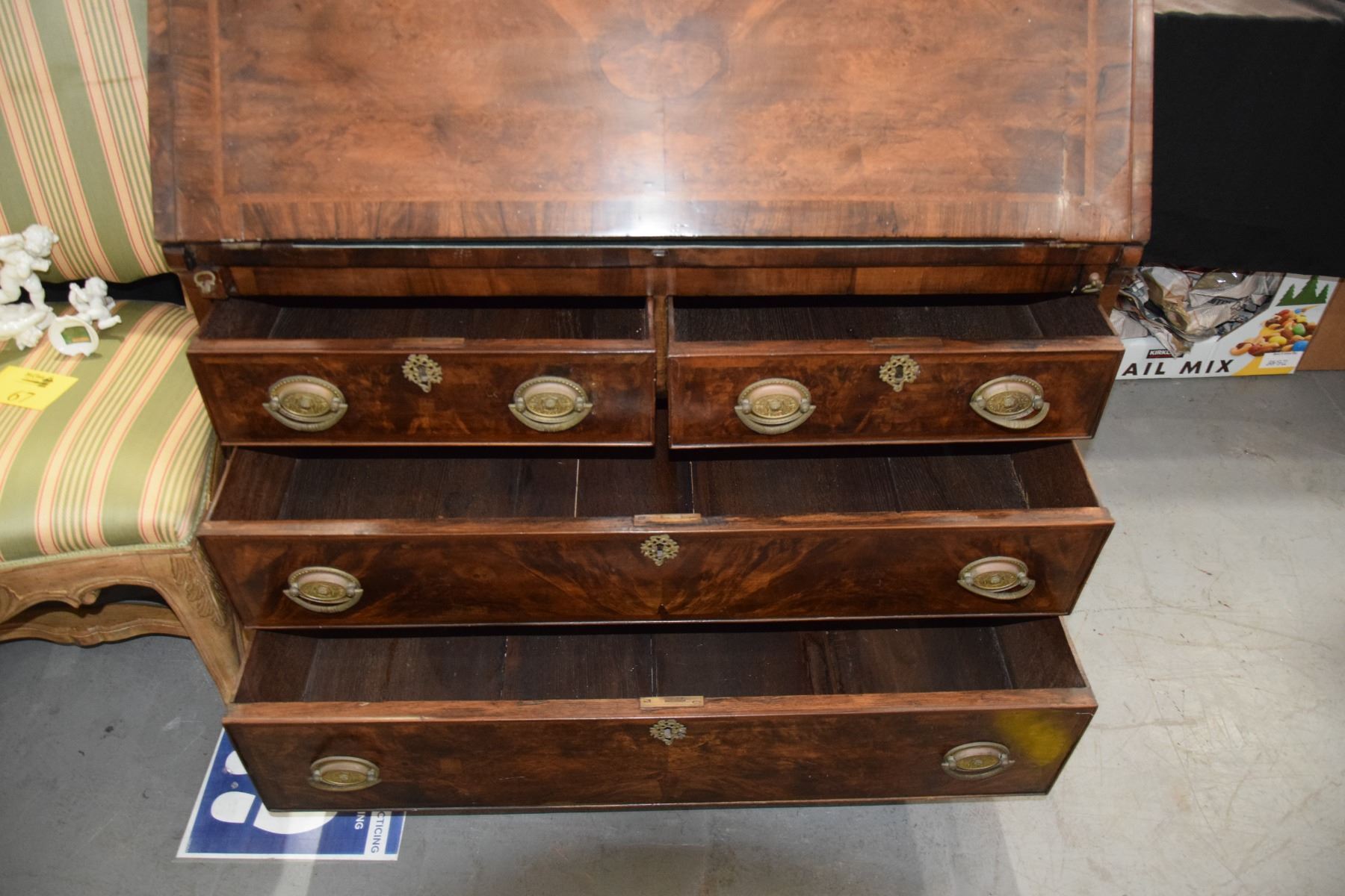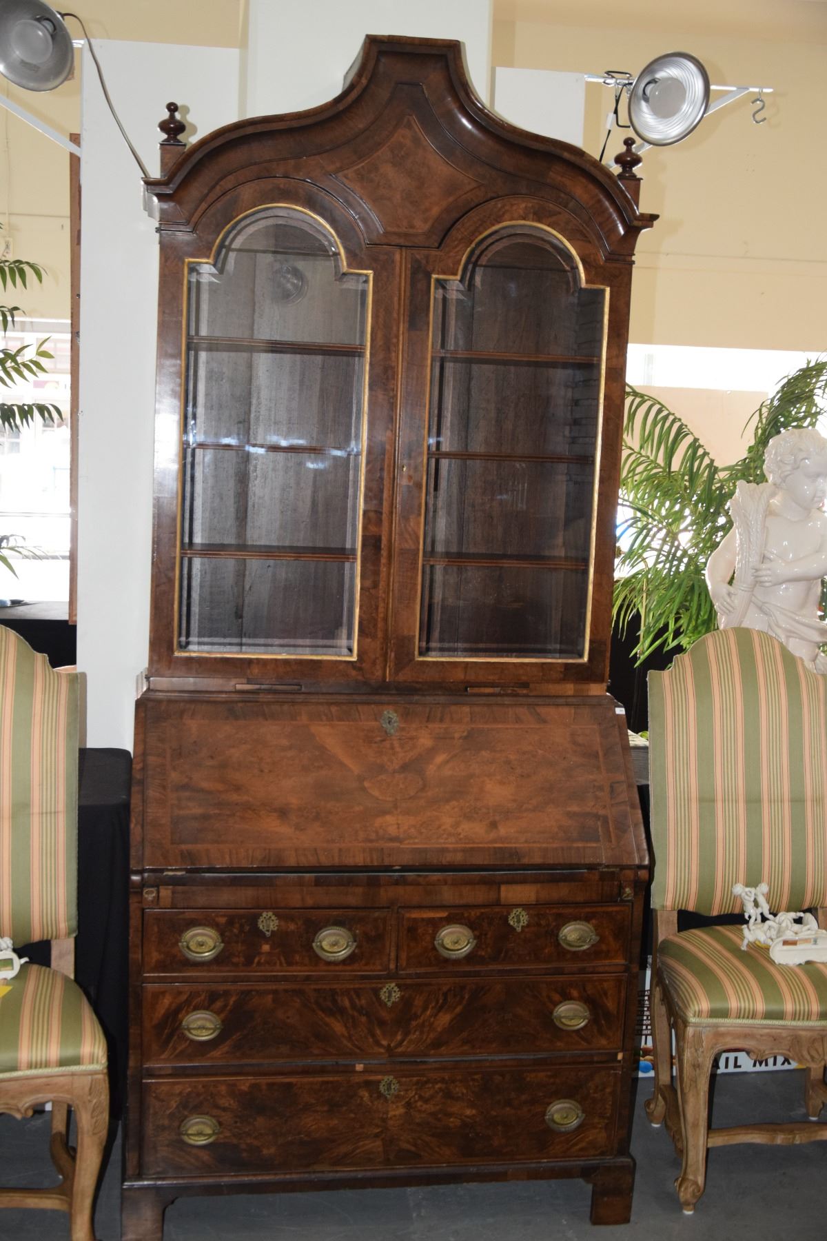 ANTIQUE ENGLISH BONNET TOP SECRETARY, IN MAHOGANY & BURL WOOD W/2 GLAZED DOORS OVER SLANT FRONT & 2 SHORT DRAWERS OVER 2 LONG DRAWERS (38 1/4" X 21" X 90")