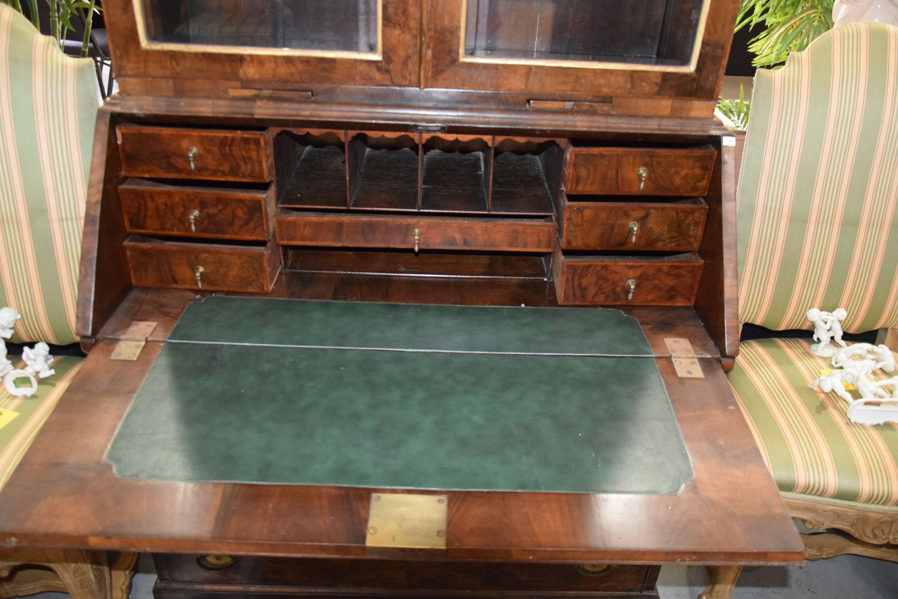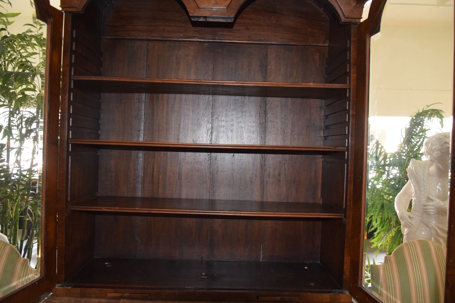 ANTIQUE ENGLISH BONNET TOP SECRETARY, IN MAHOGANY & BURL WOOD W/2 GLAZED DOORS OVER SLANT FRONT & 2