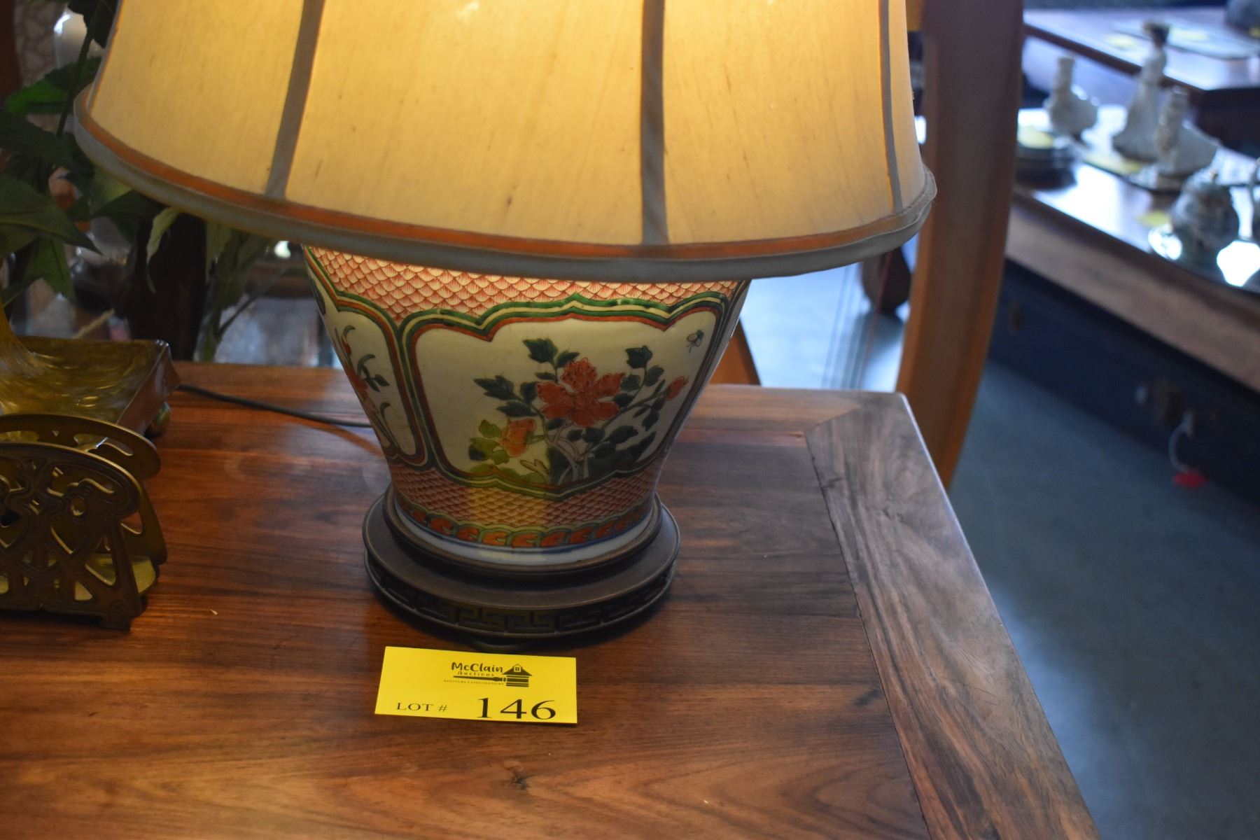 ANTIQUE GINGER JAR LAMP W/SILK SHADE, DOUBLE BULBS & CARVED IRONWOOD BASE