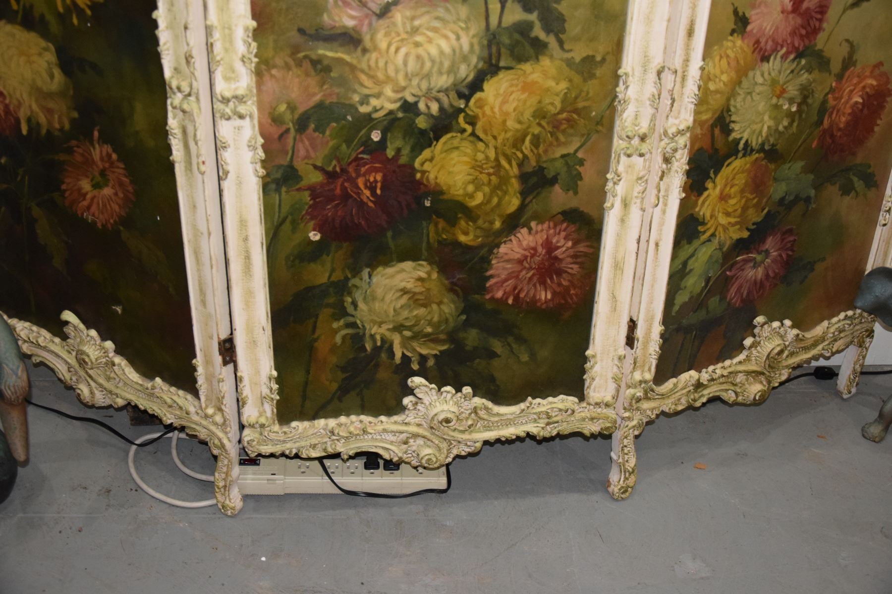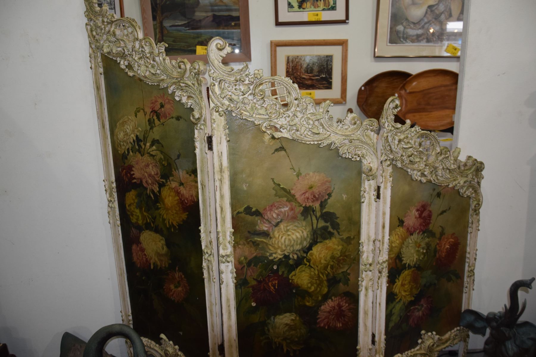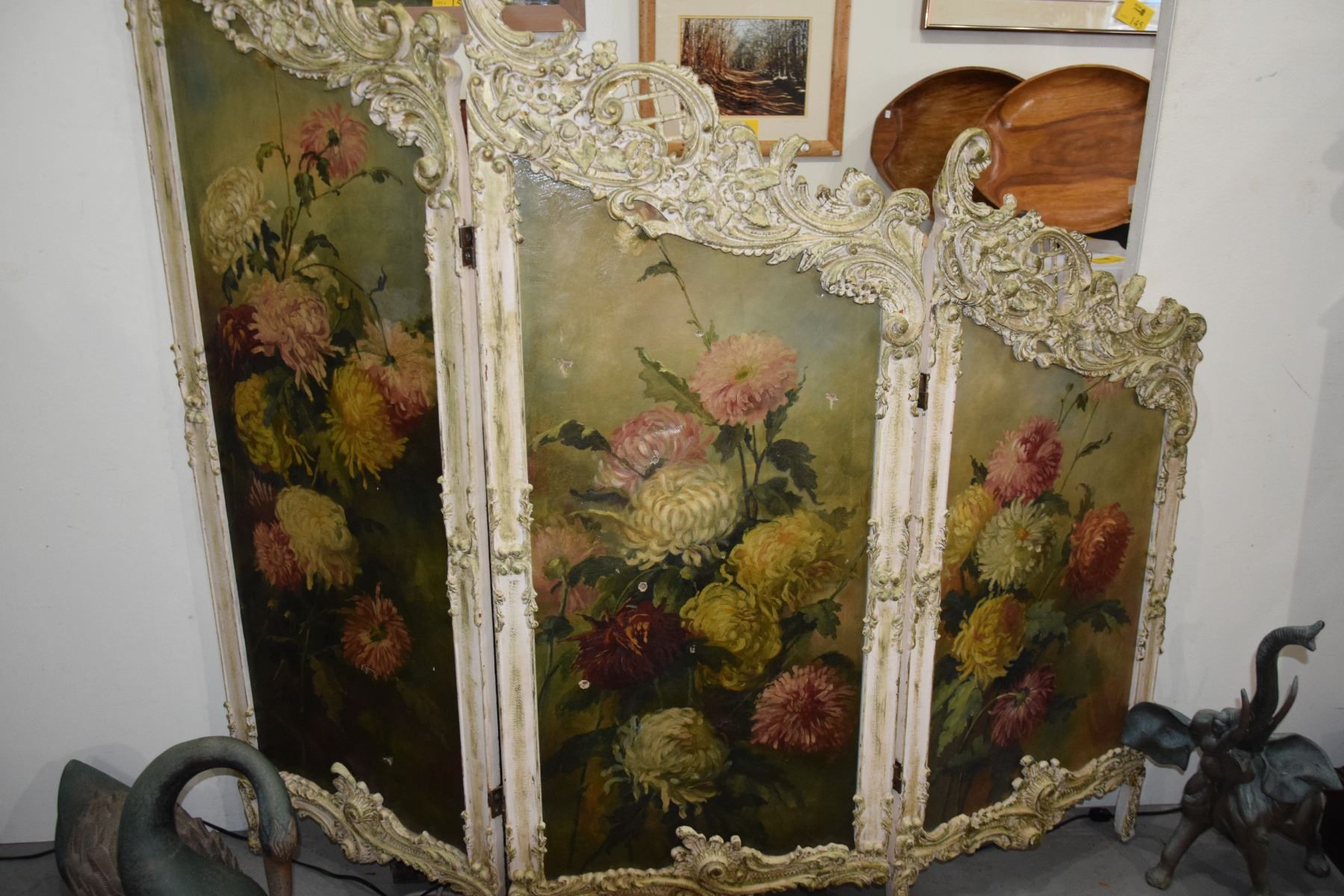 ANTIQUE ORNATE BAROQUE SCREEN W/3 PAINTED FLORAL PANELS