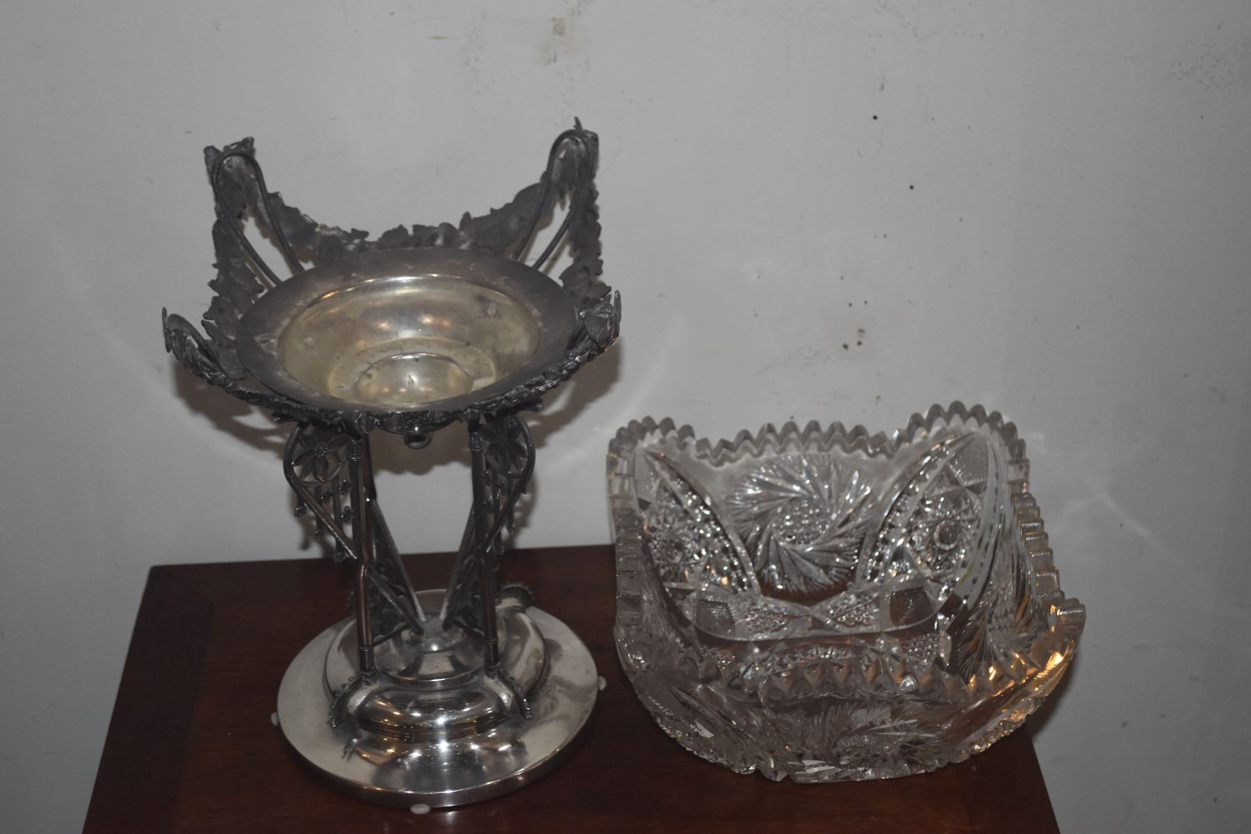 ANTIQUE VICTORIAN ERA COMPOTE W/CUT CRYSTAL SUNBURST PATTERN BOWL ON ORNATE ART NOUVEAU WHITE METAL BASE