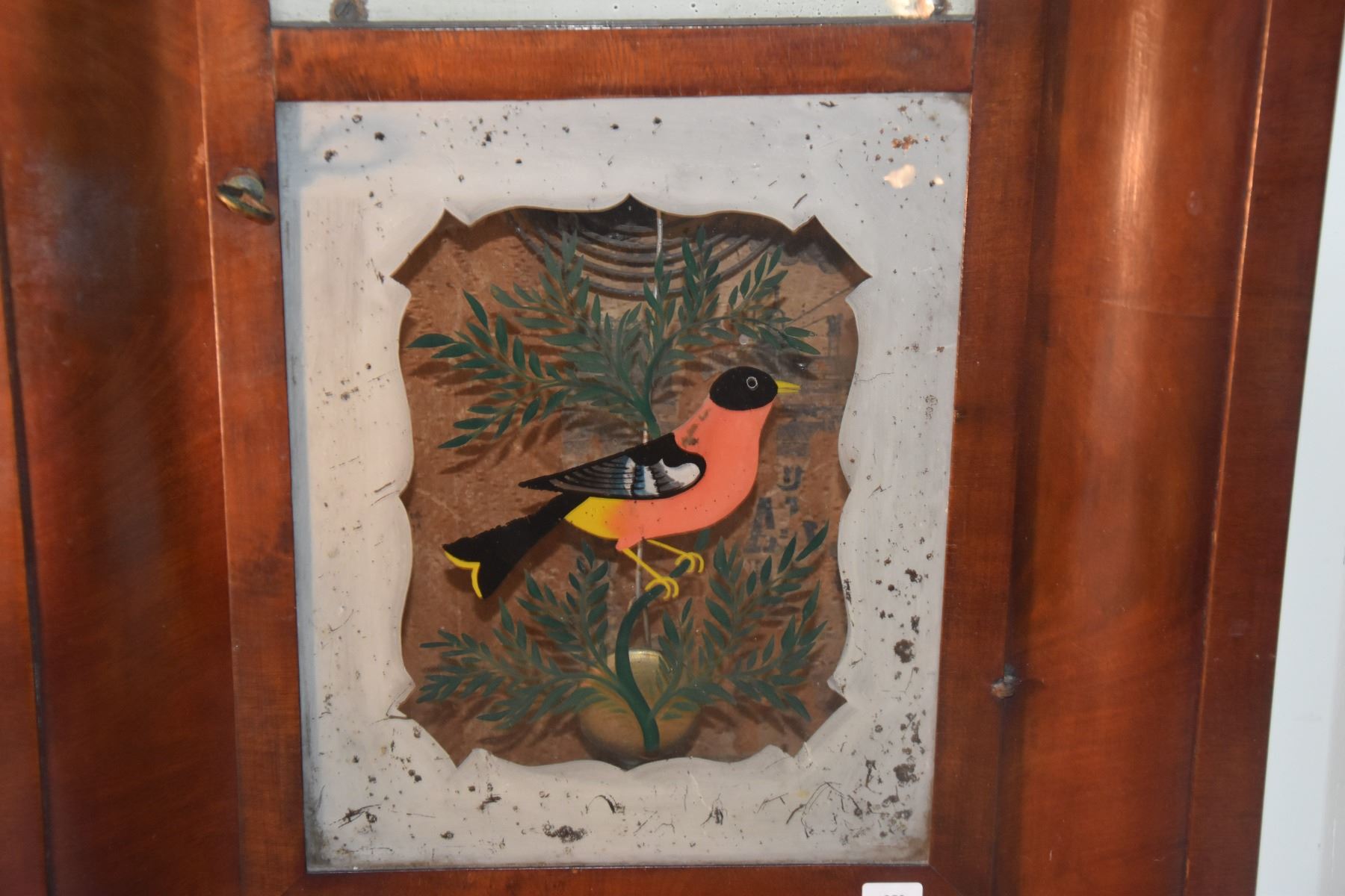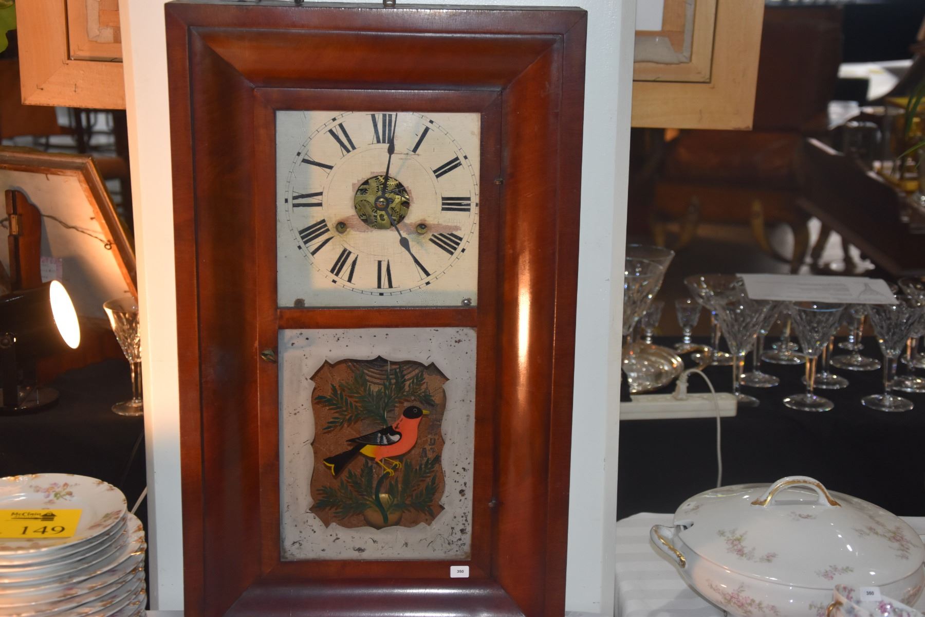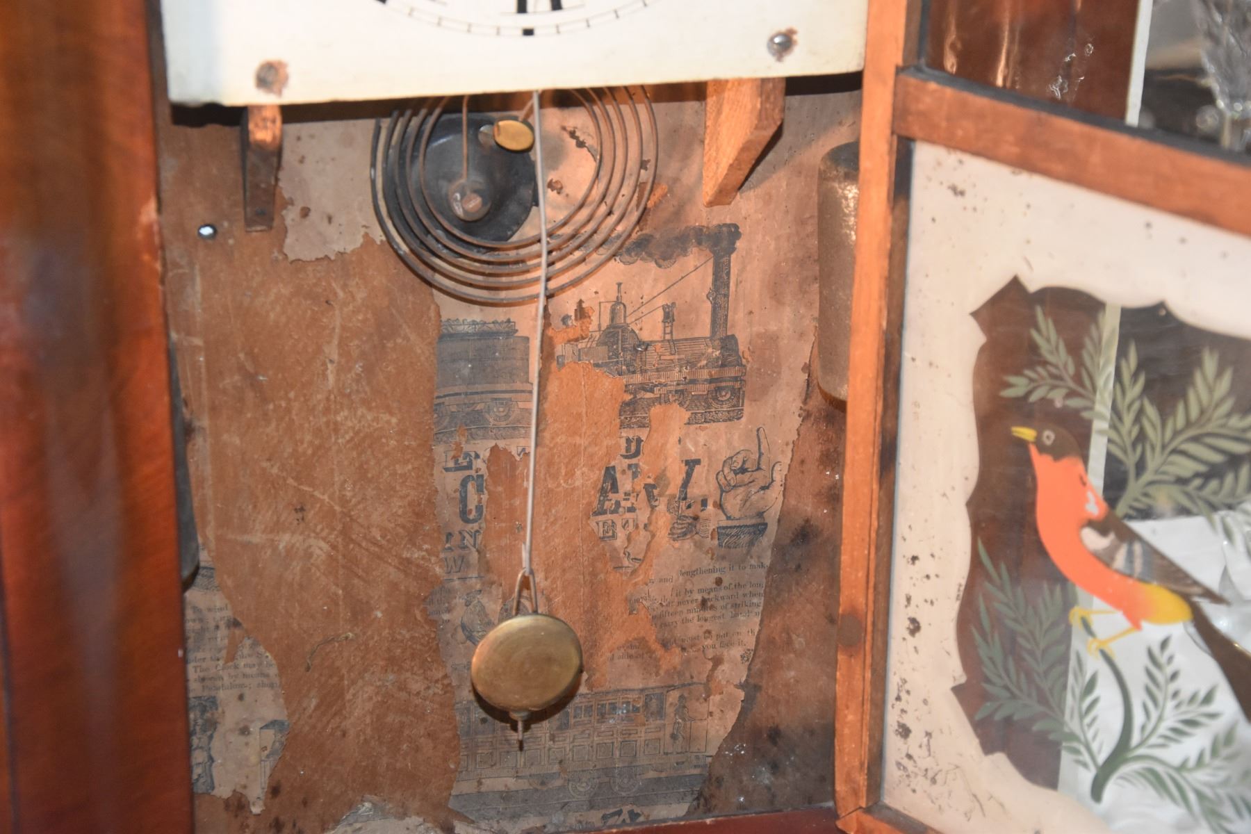 ANTIQUE WOODEN CASE WALL CLOCK W/BIRD MOTIF (15 1/2" X 26")