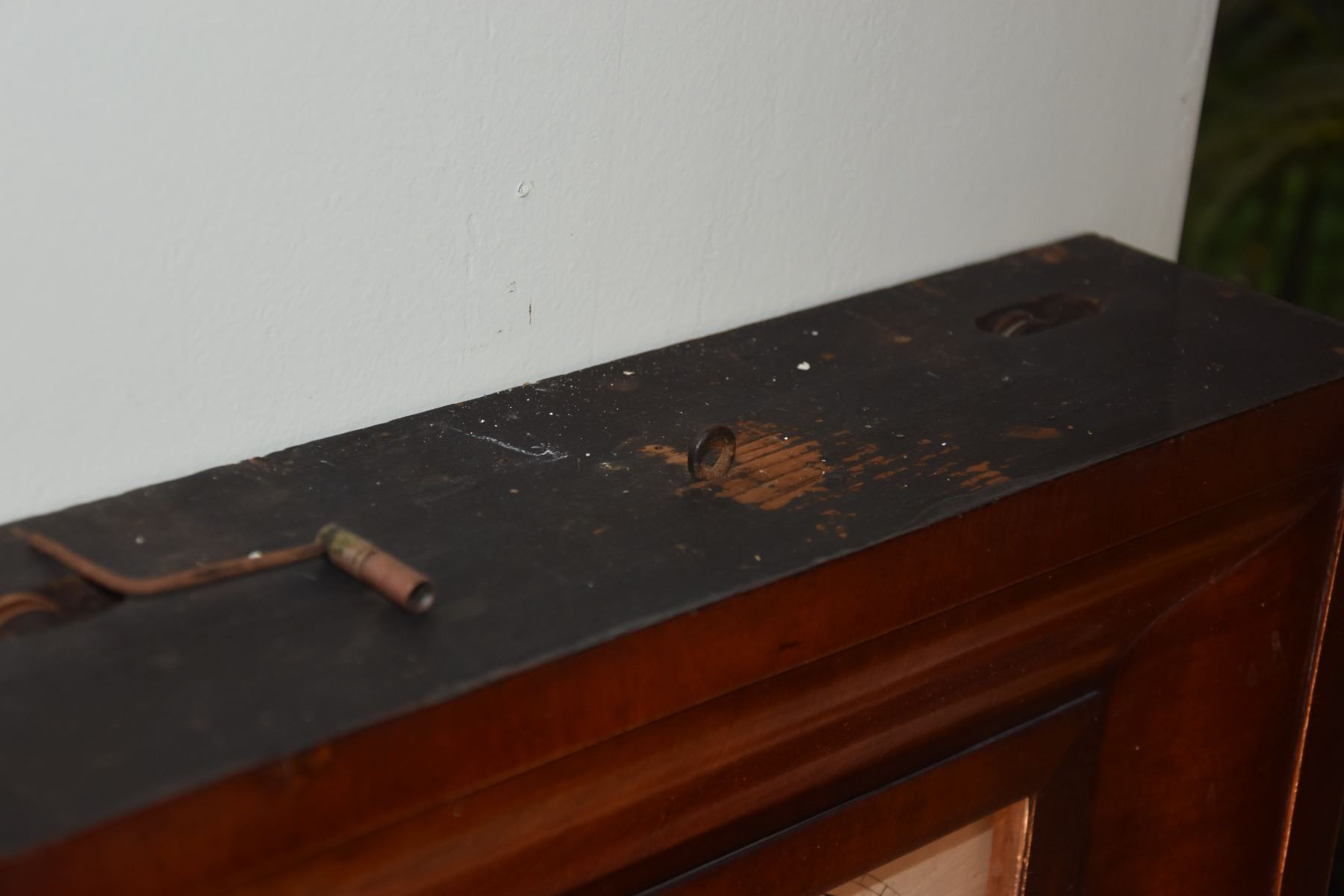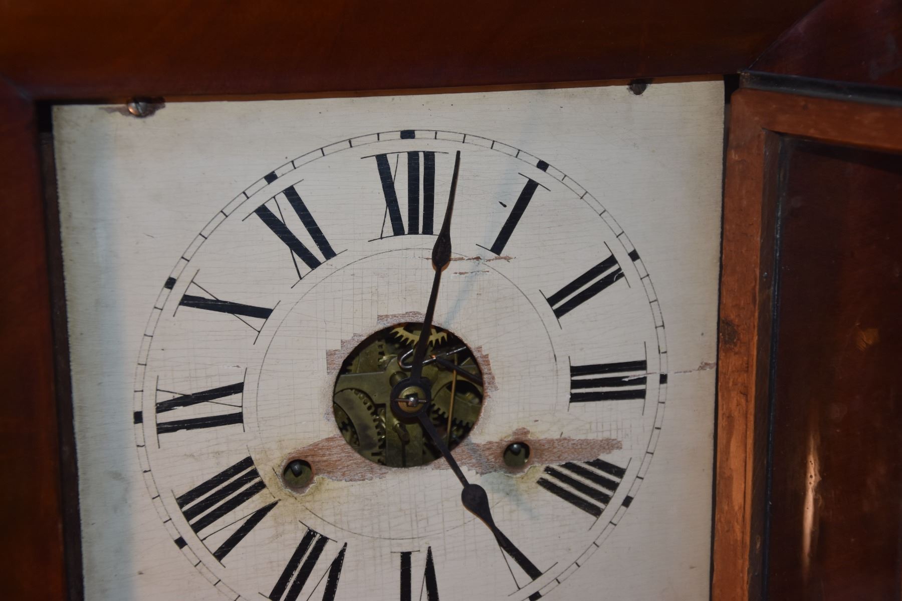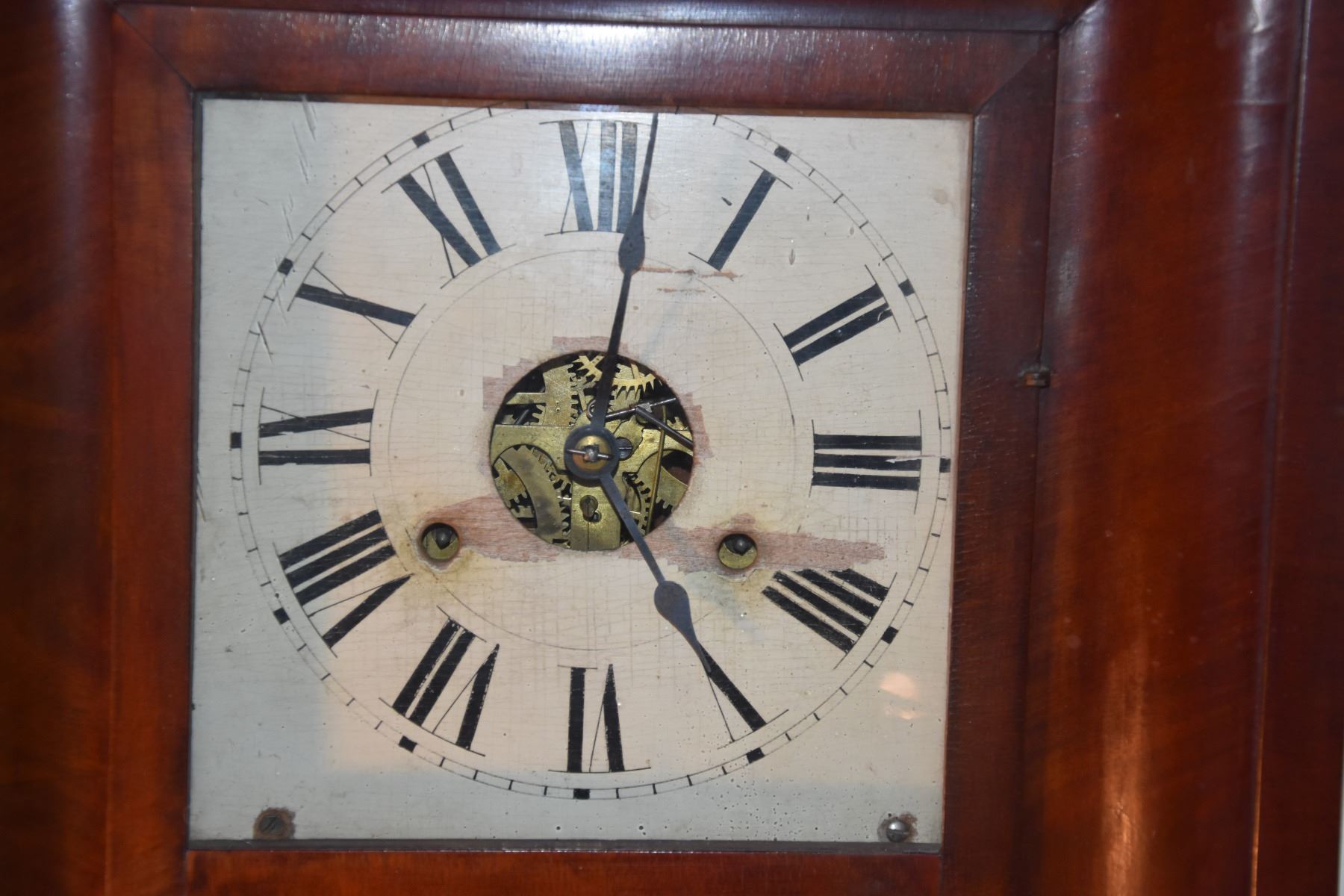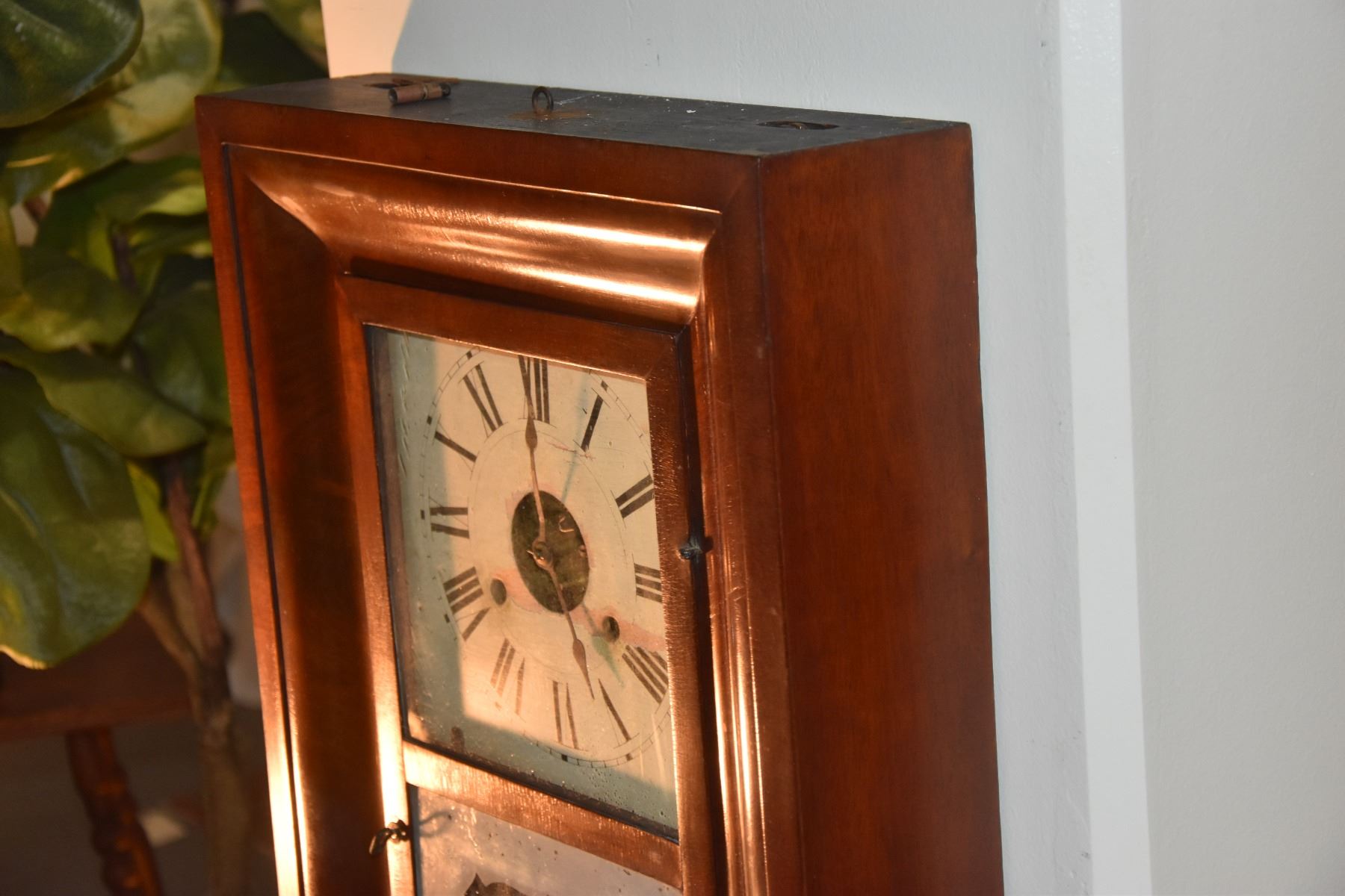 ANTIQUE WOODEN CASE WALL CLOCK W/BIRD MOTIF (15 1/2" X 26")
