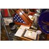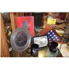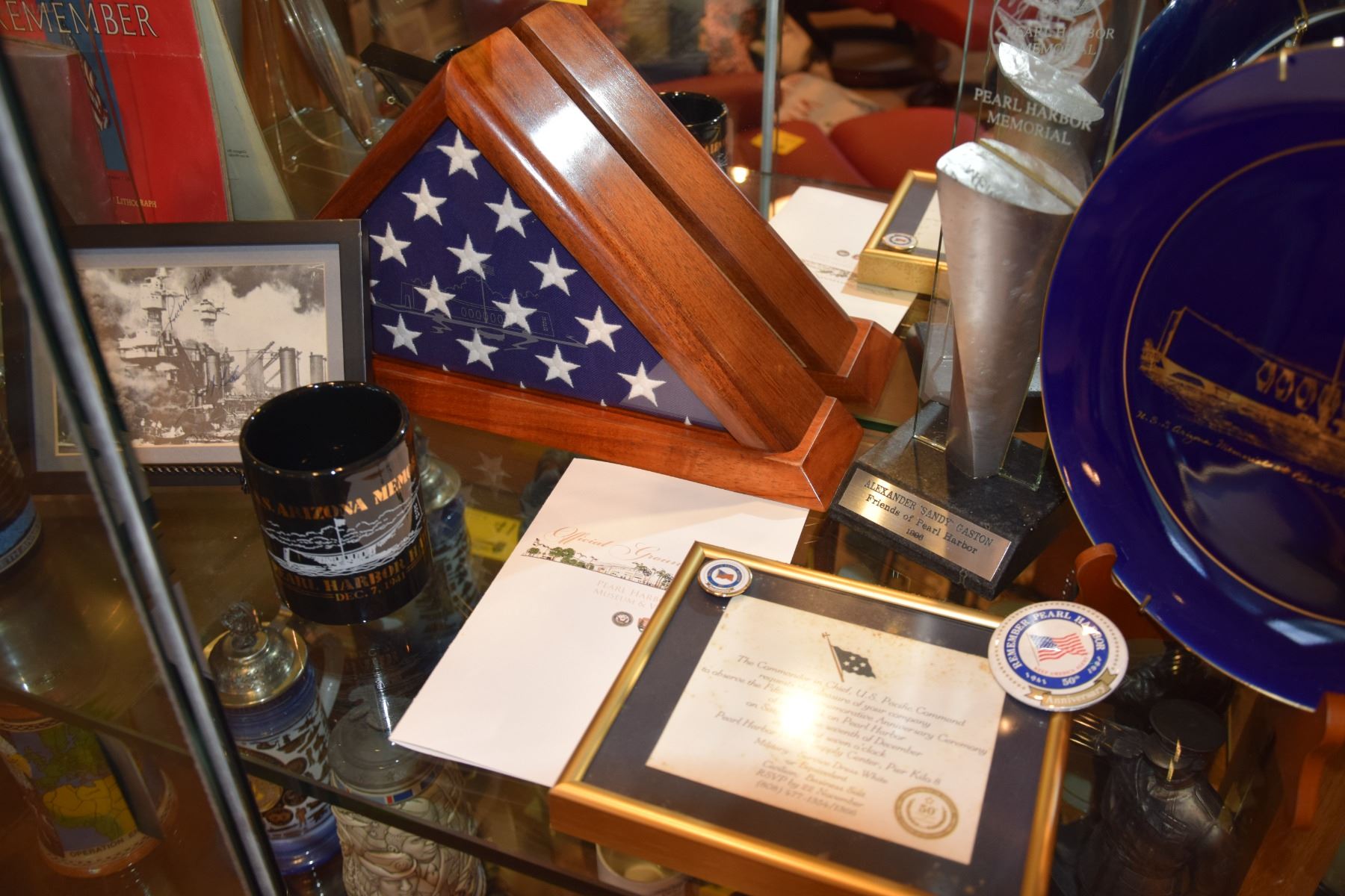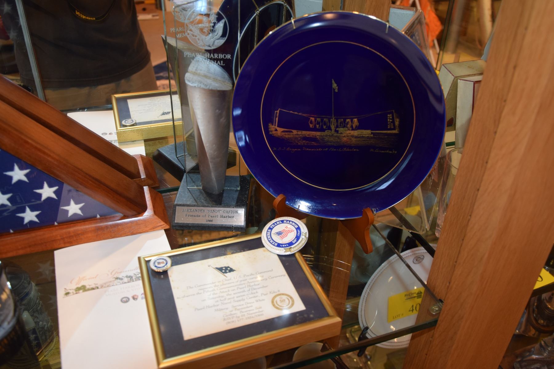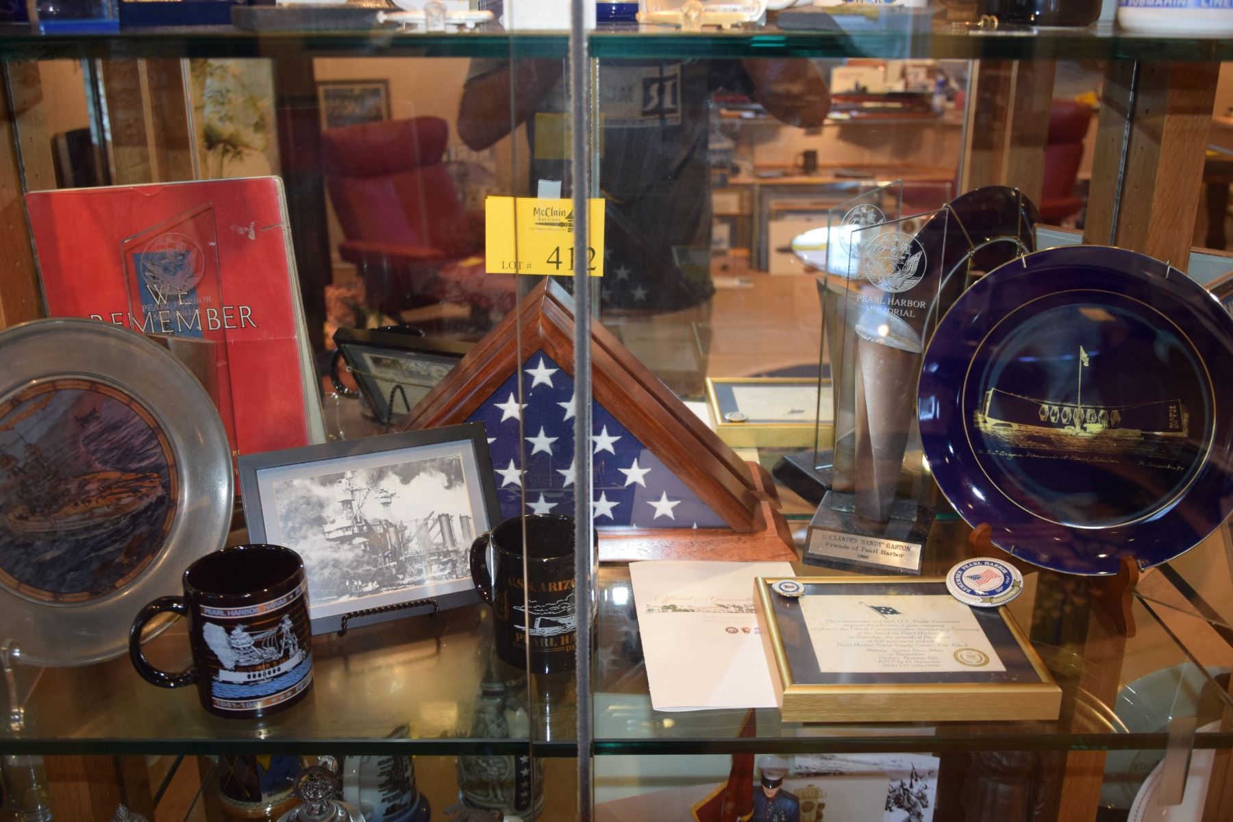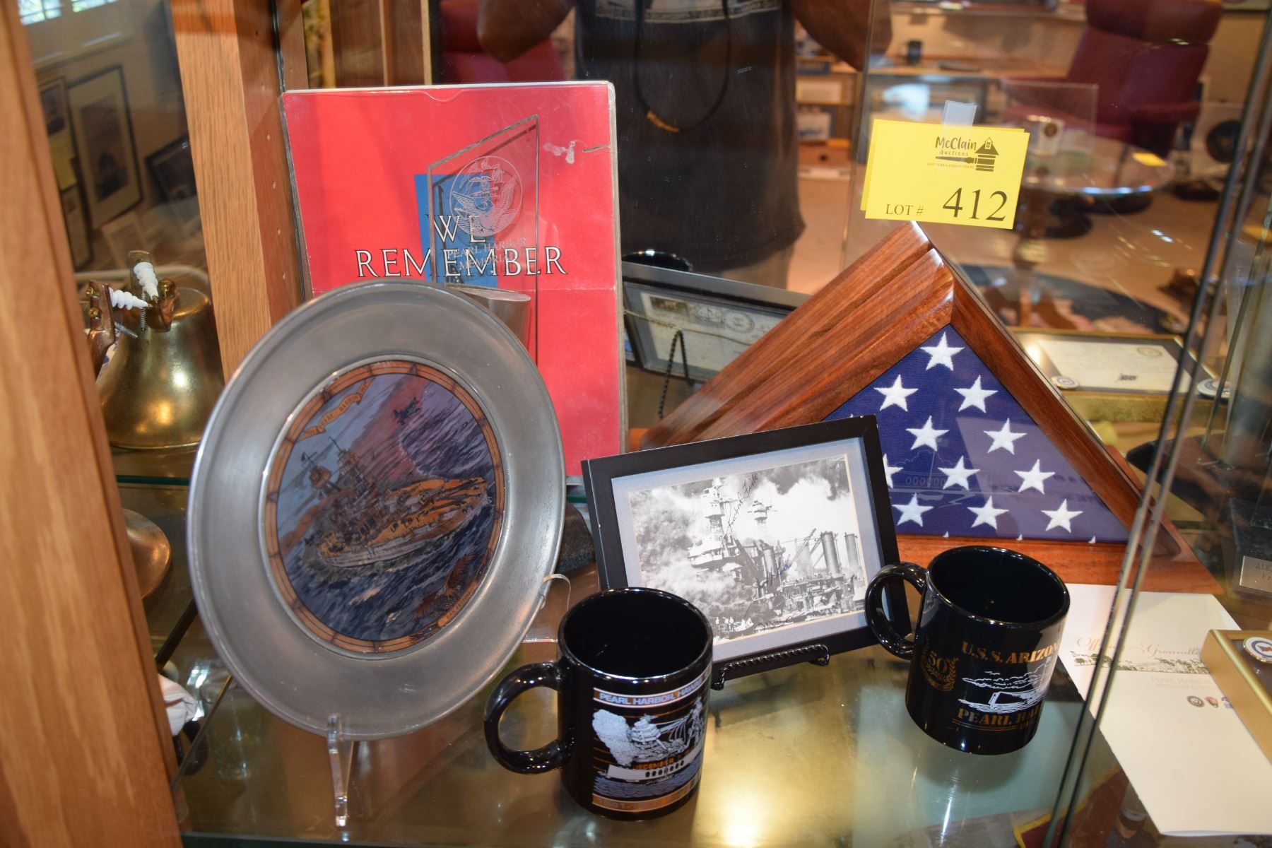 ARIZONA MEMORAL MEMORABILIA: SHADOW BOX FRAMED FLAG, PLATES, MUGS, STATUARY, POST CARDS, ETC. (9 PCS)