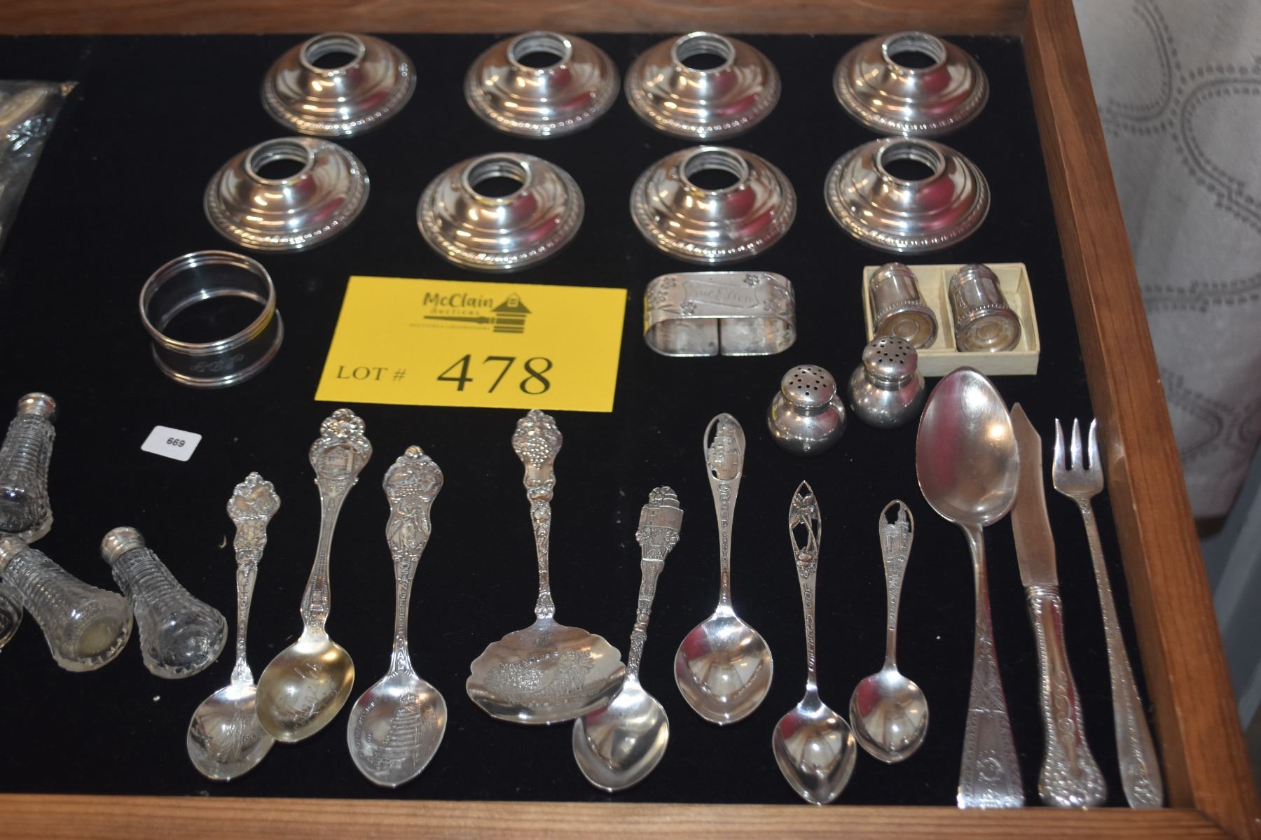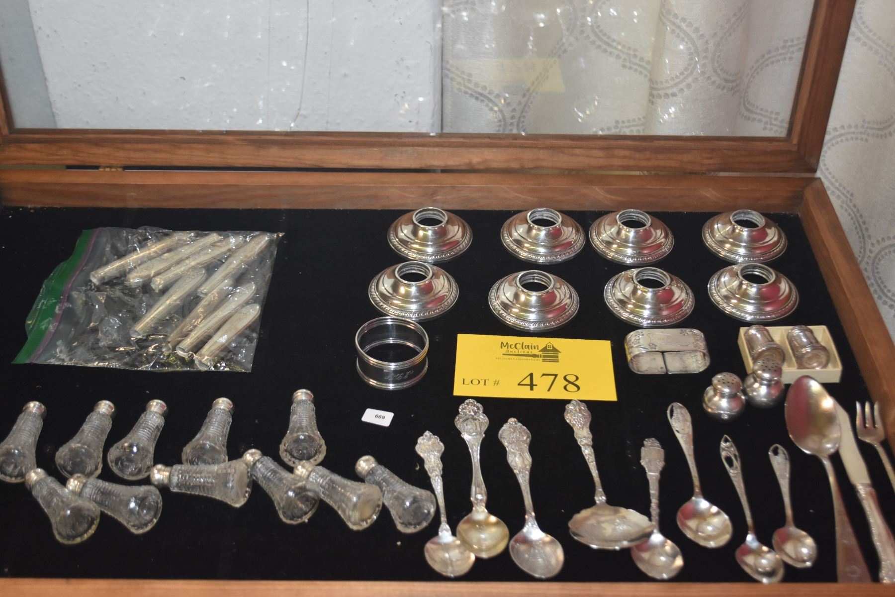 ASSORTED STERLING FLATWARE, NAPKIN RINGS, SALT & PEPPER SHAKERS, KNIFE HANDLES, ETC.