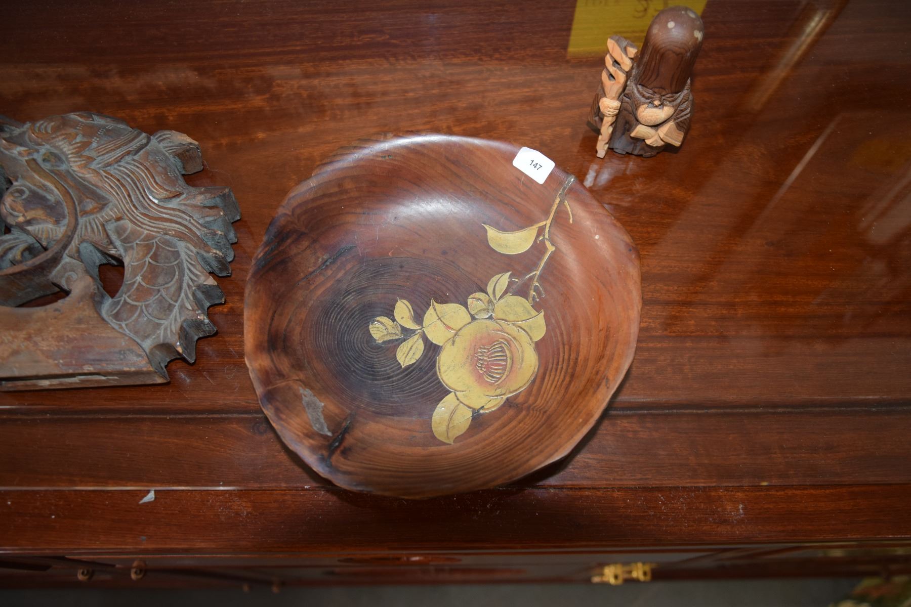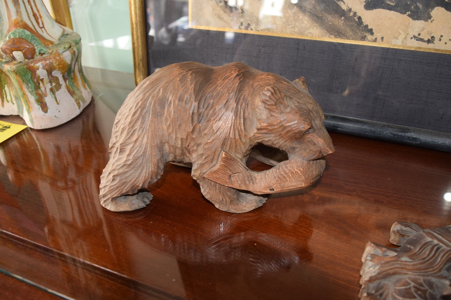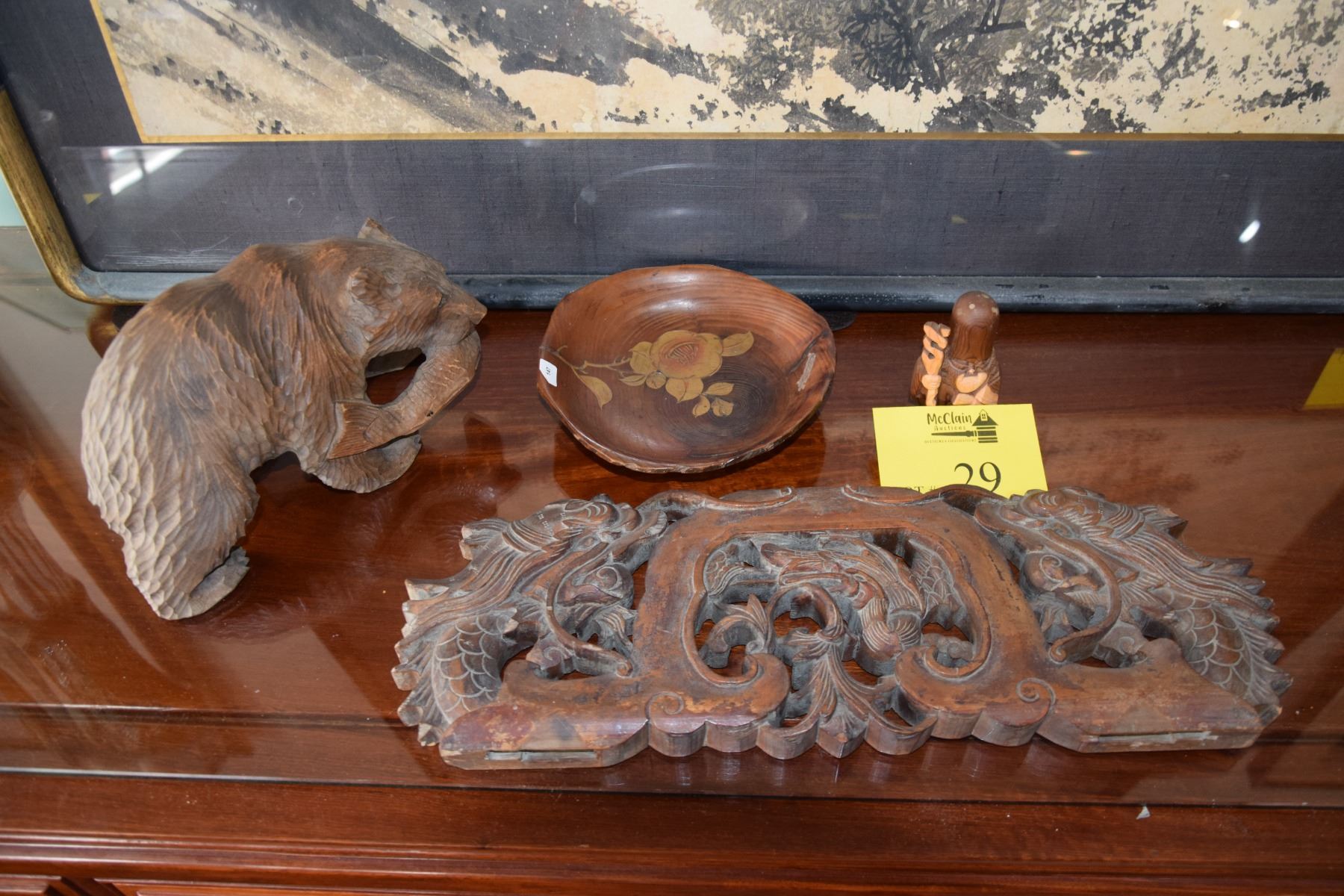 ASSORTED WOOD CARVINGS, BOWL, FIGURE, BEAR W/FISH & PANEL (4 PCS)
