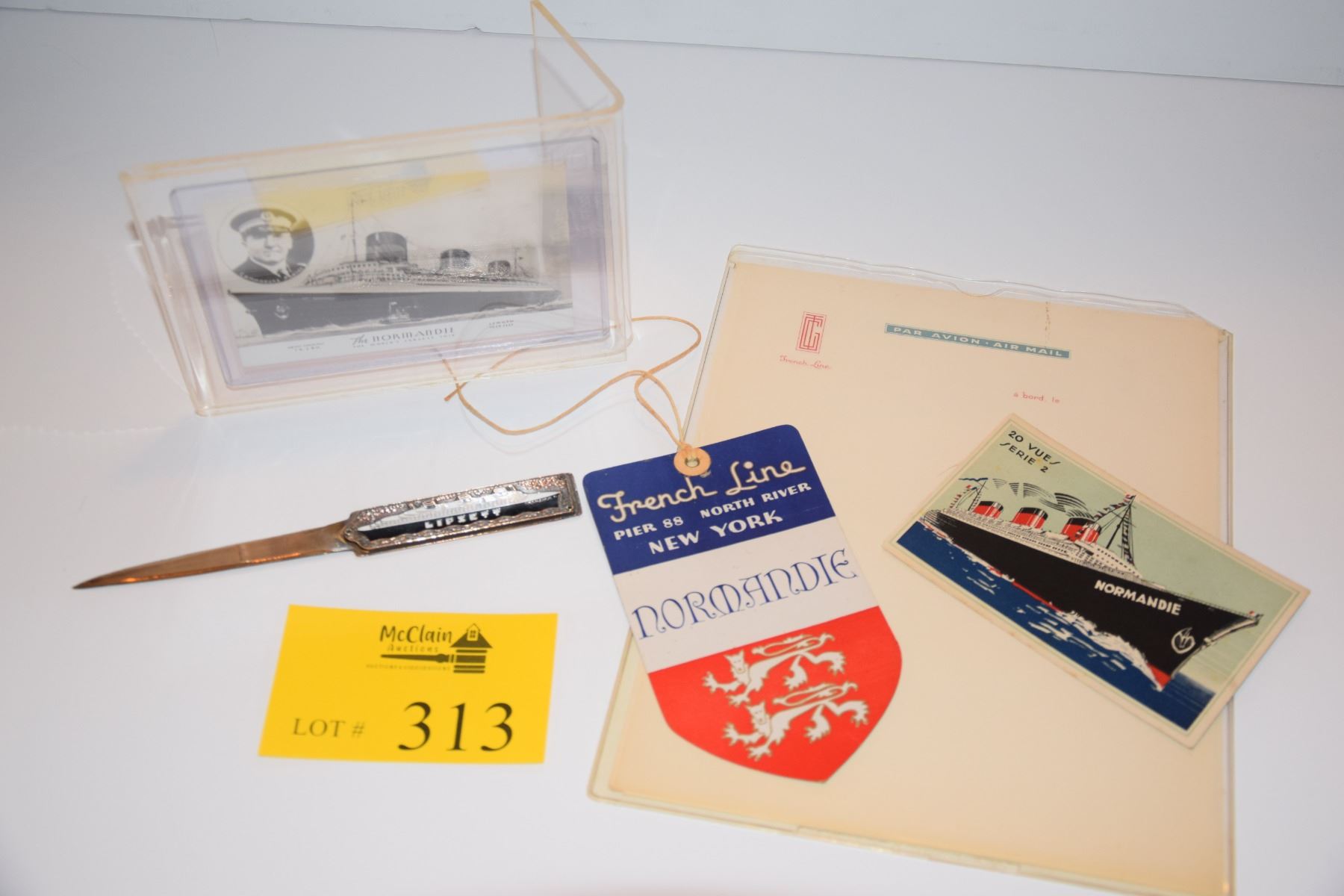 BAGGAGE TAG FROM THE NORMANDIE IN THE SHIELD FORM, RARE 8"L BRONZE LETTER OPENER MADE FROM THE NORMANDIE HERSELF, HANDLE ENAMELED W/HER RAISED PORTRAIT/THE NAME LIPSETT, LIPSETT SCRAPPED THE NORMANDIE, MADE 500 LETTER OPENERS & POST CARDS (4 PCS)