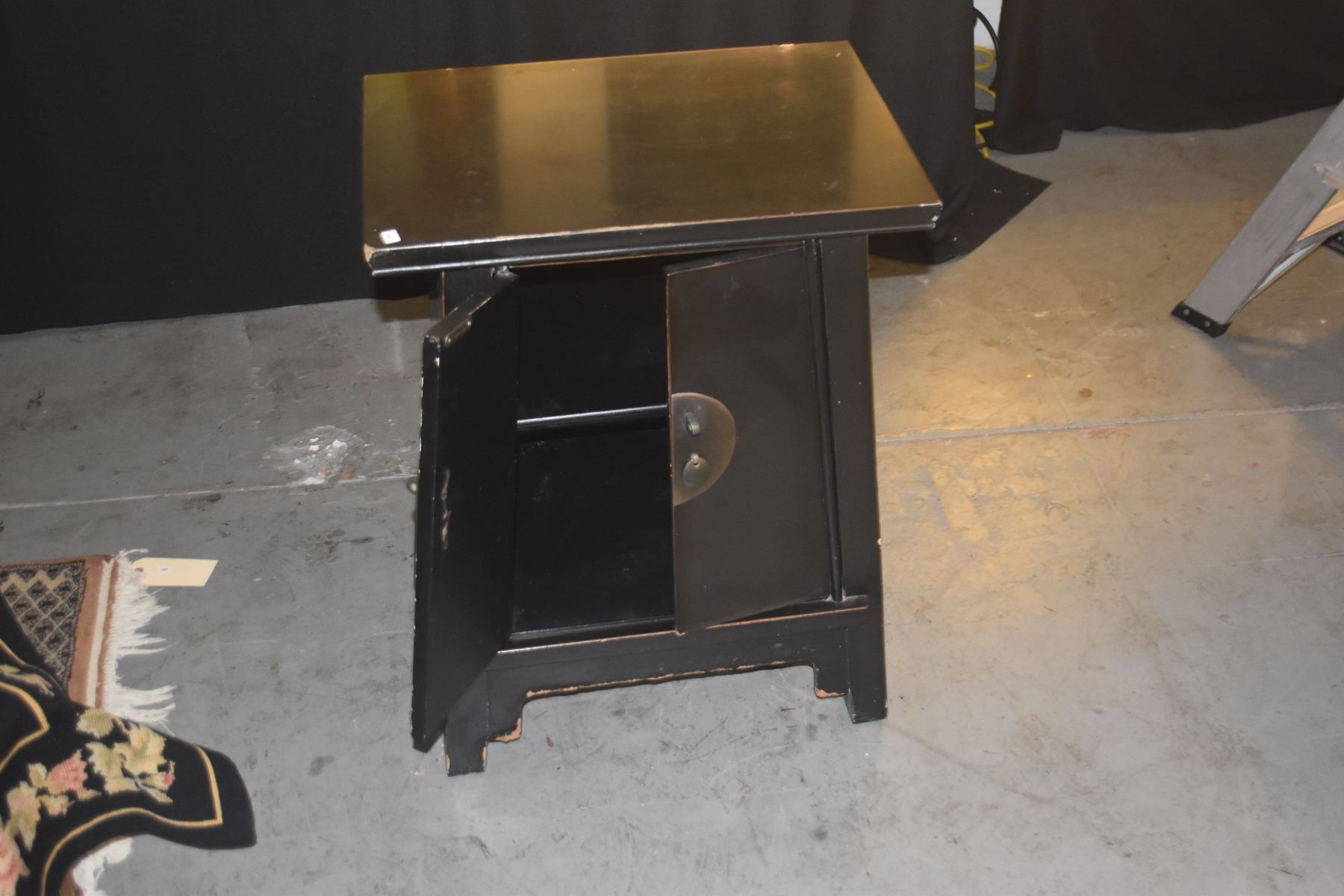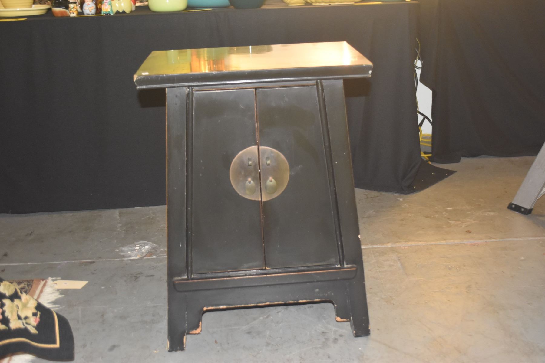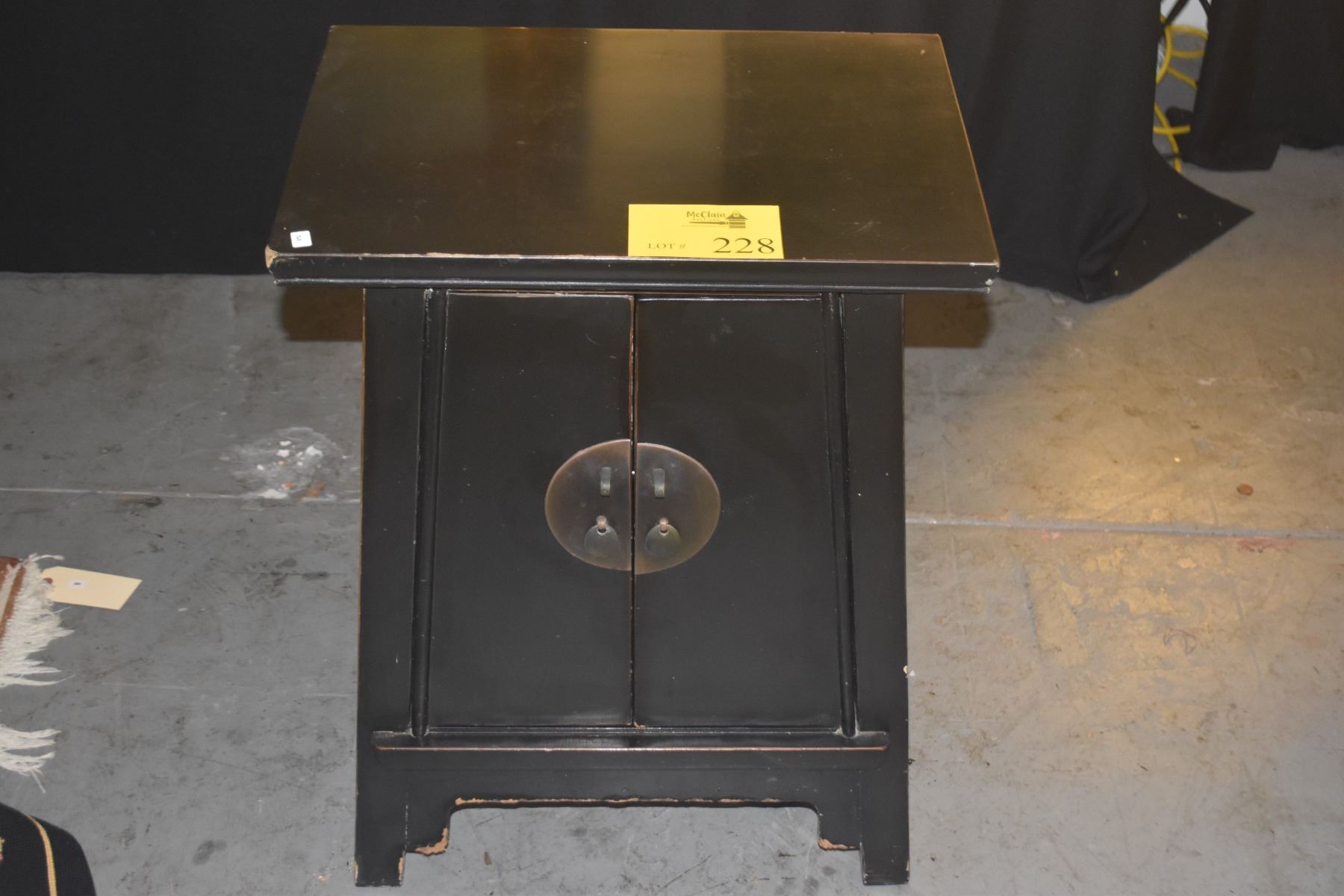 BLACK LACQUER SMALL CABINET W/2 DOORS, 1 SHELF (20" X 14" X 27 1/2")