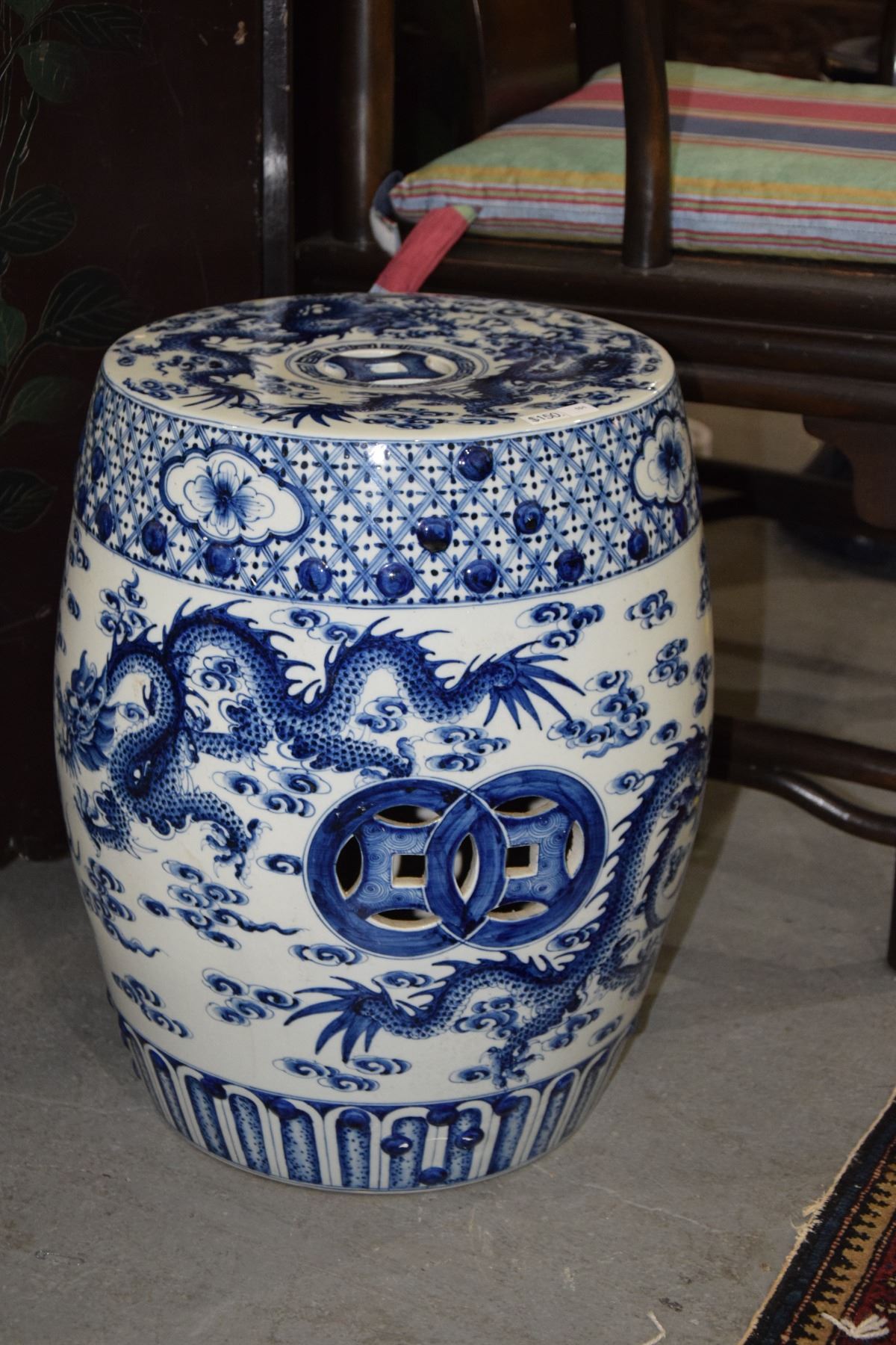 BLUE & WHITE PORCELAIN GARDEN BARREL STOOL W/DRAGON MOTIF