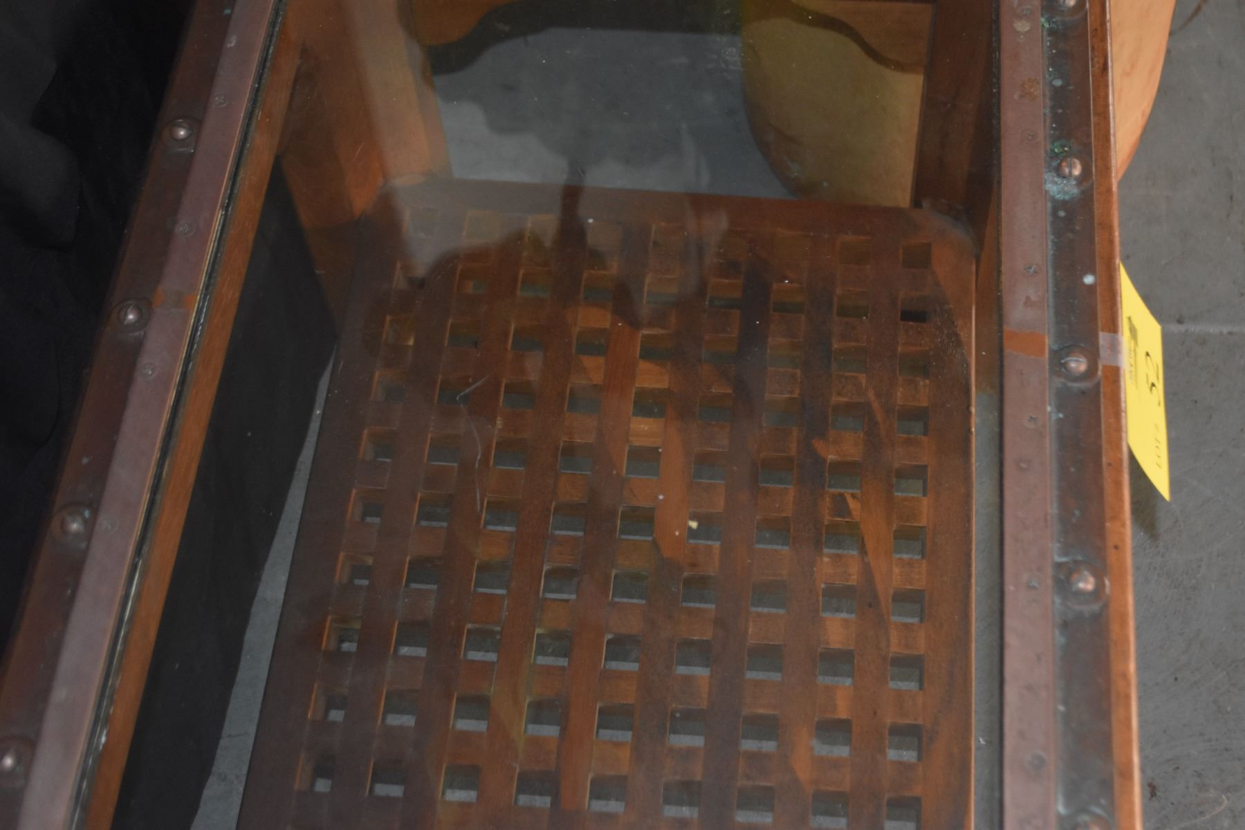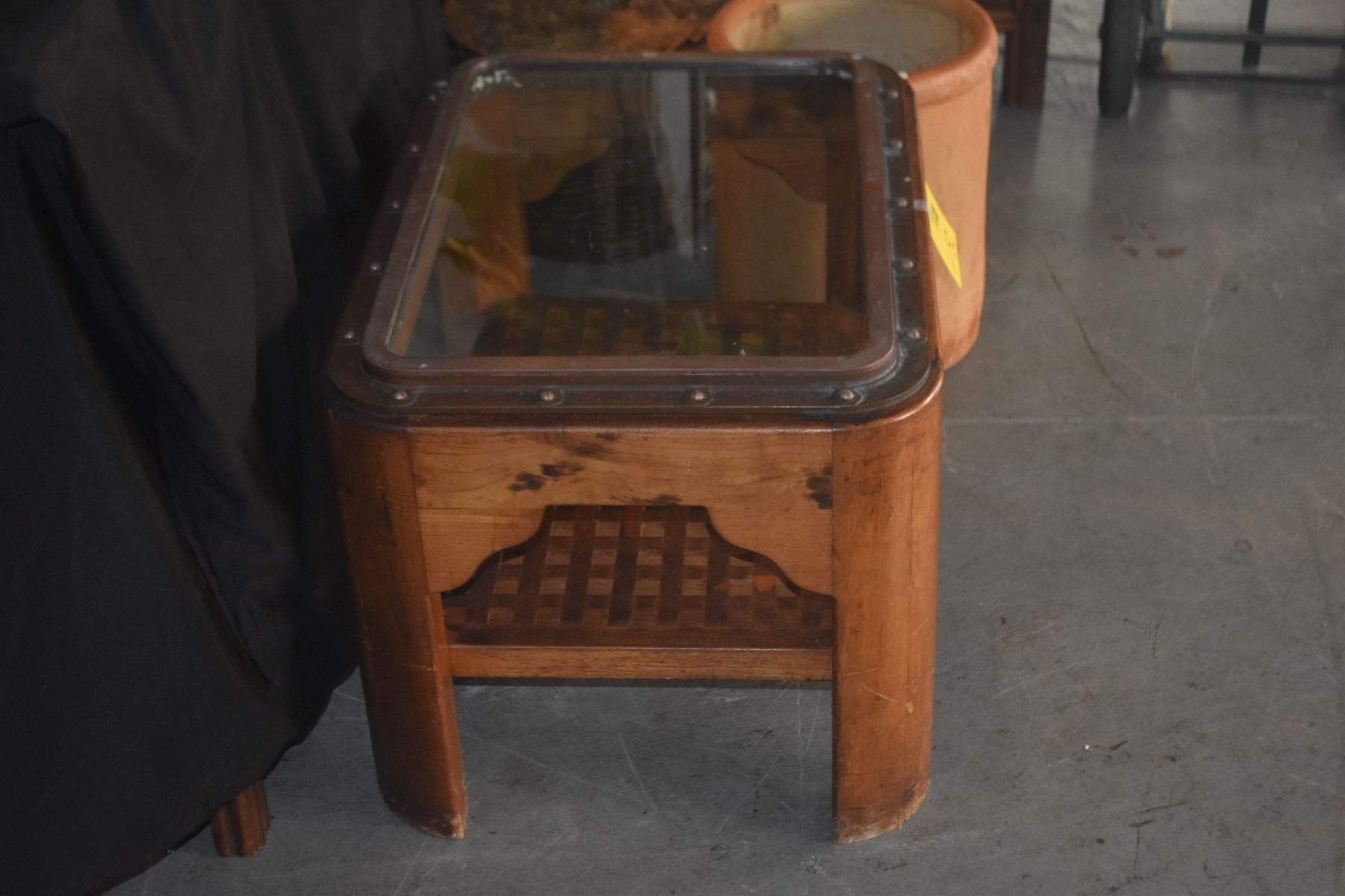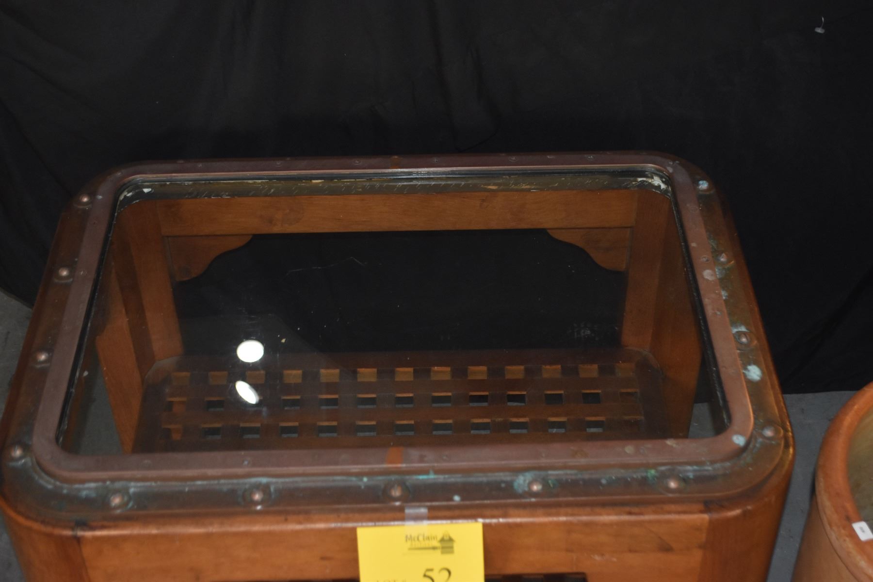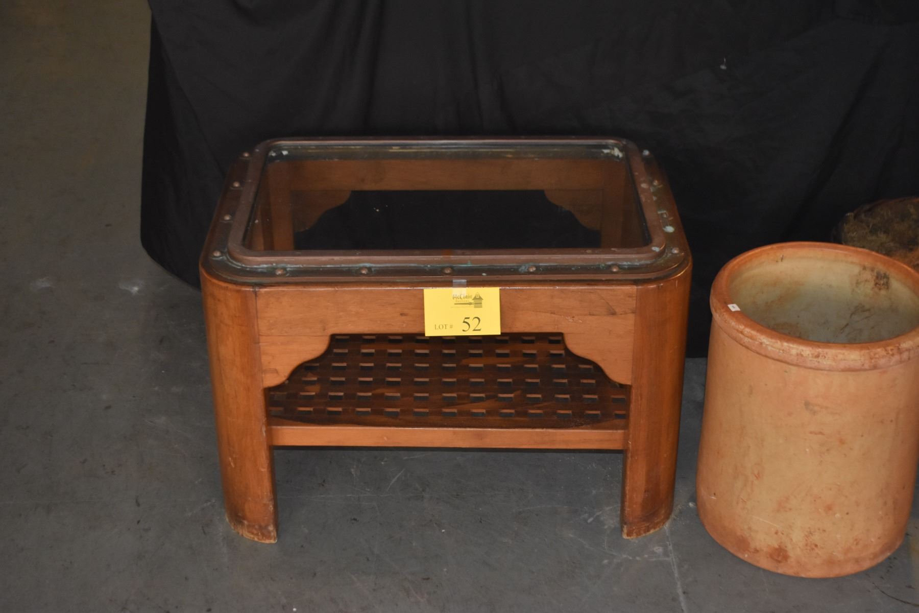 BRASS FRAMED SHIP'S WINDOW SIDE TABLE W/TEAK GRATE
