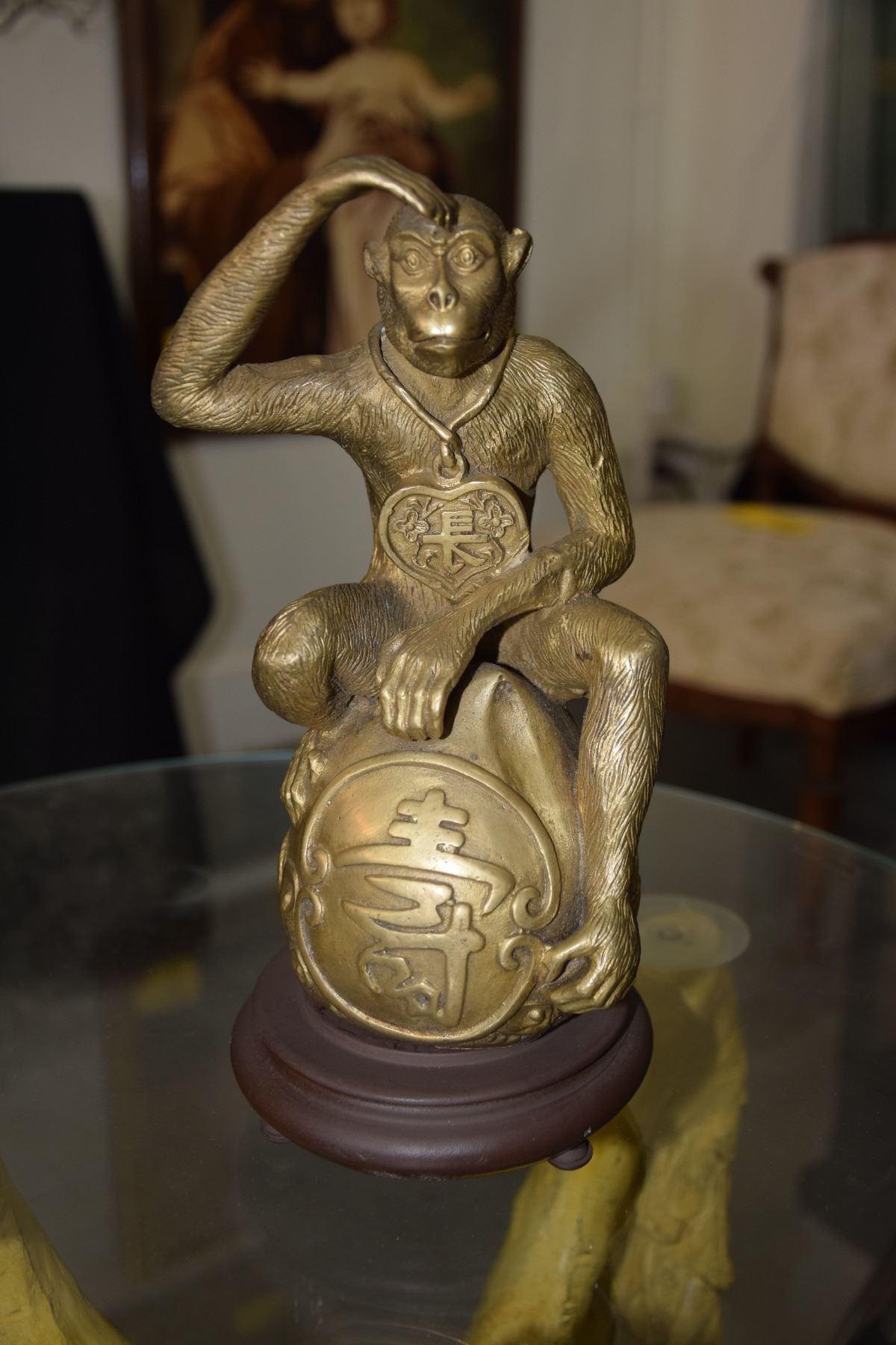 BRASS MONKEY STATUE ON WOOD BASE (FROM REV. CLARENCE GUERREIRO COLLECTION)
