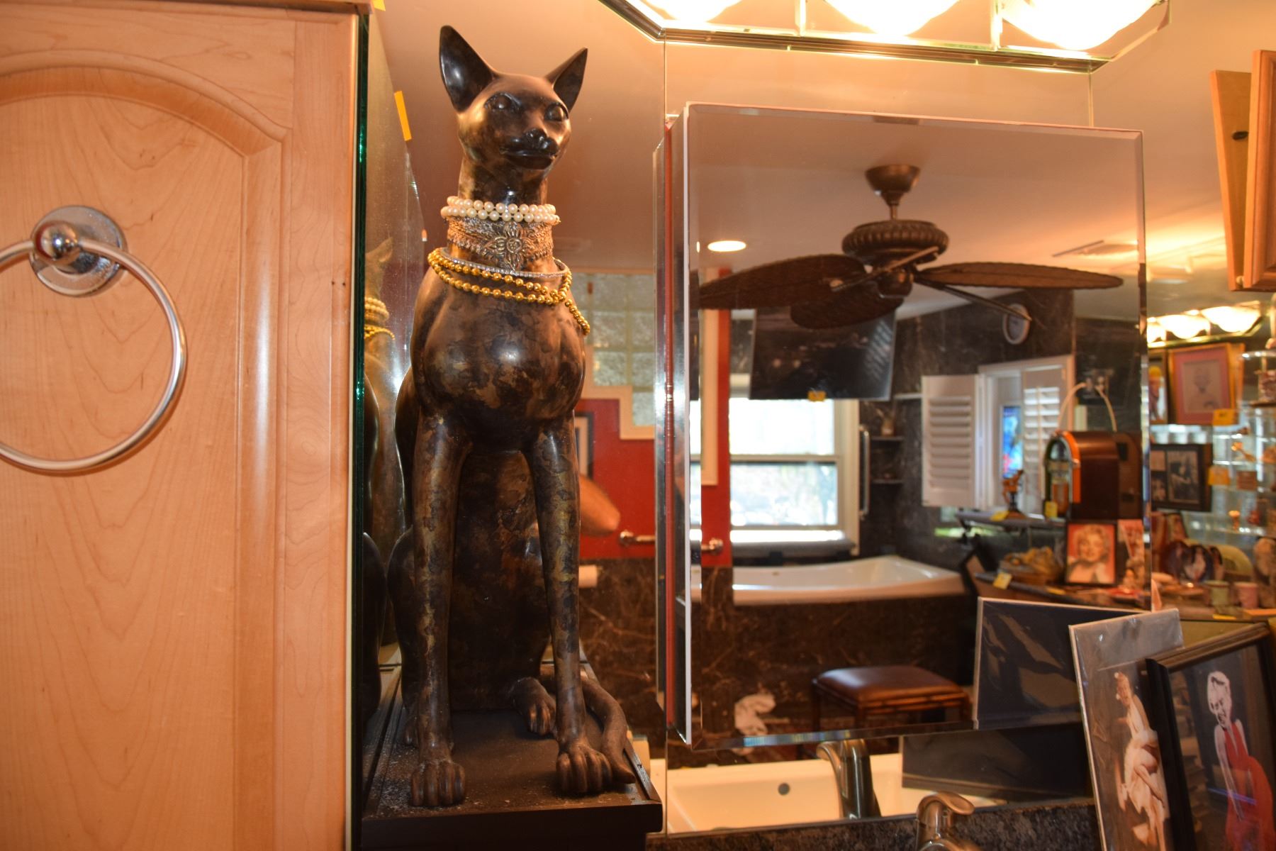 BRASS W/BRONZE FINISH EGYPTIAN CAT SCULPTURE; SIGNED A. TIOT (24" TALL)
