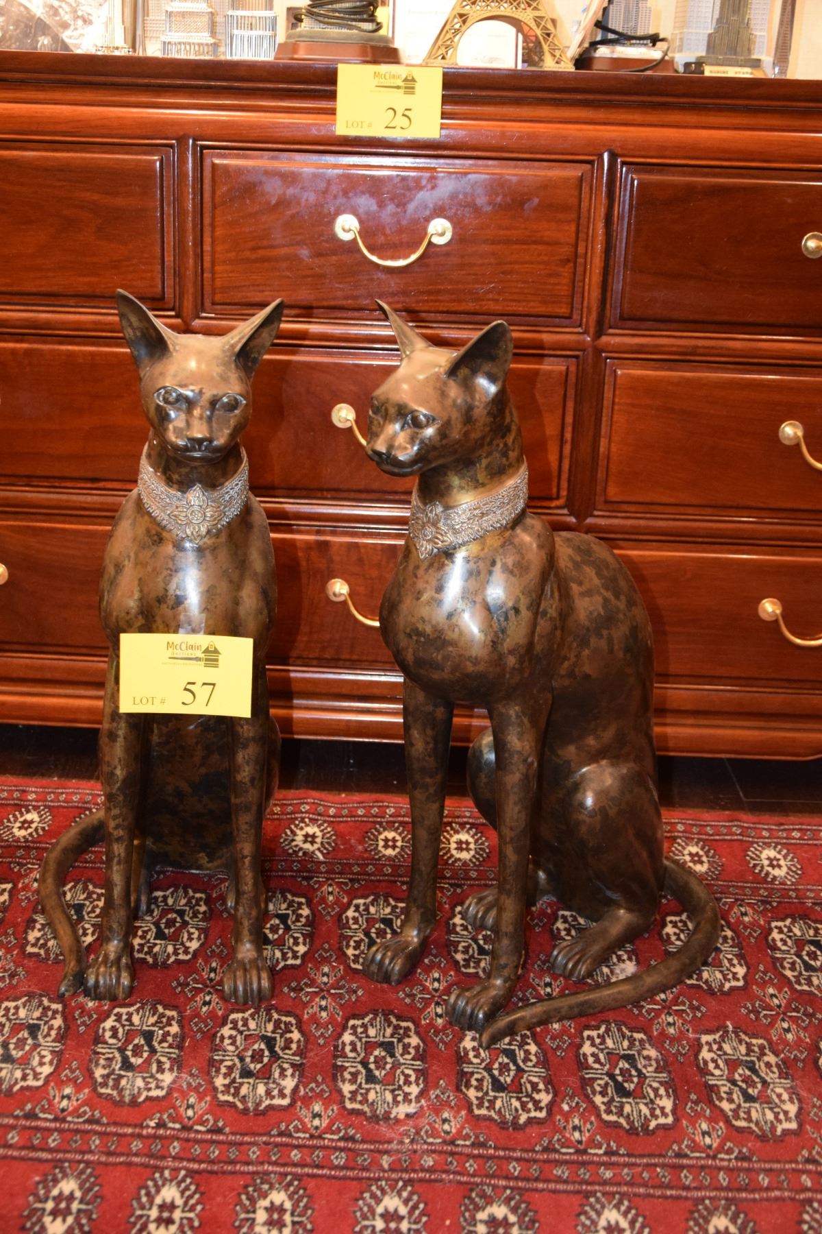 BRASS W/BRONZE FINISH EGYPTIAN CAT SCULPTURES; SIGNED A. TIOT (24" HIGH) (PAIR)