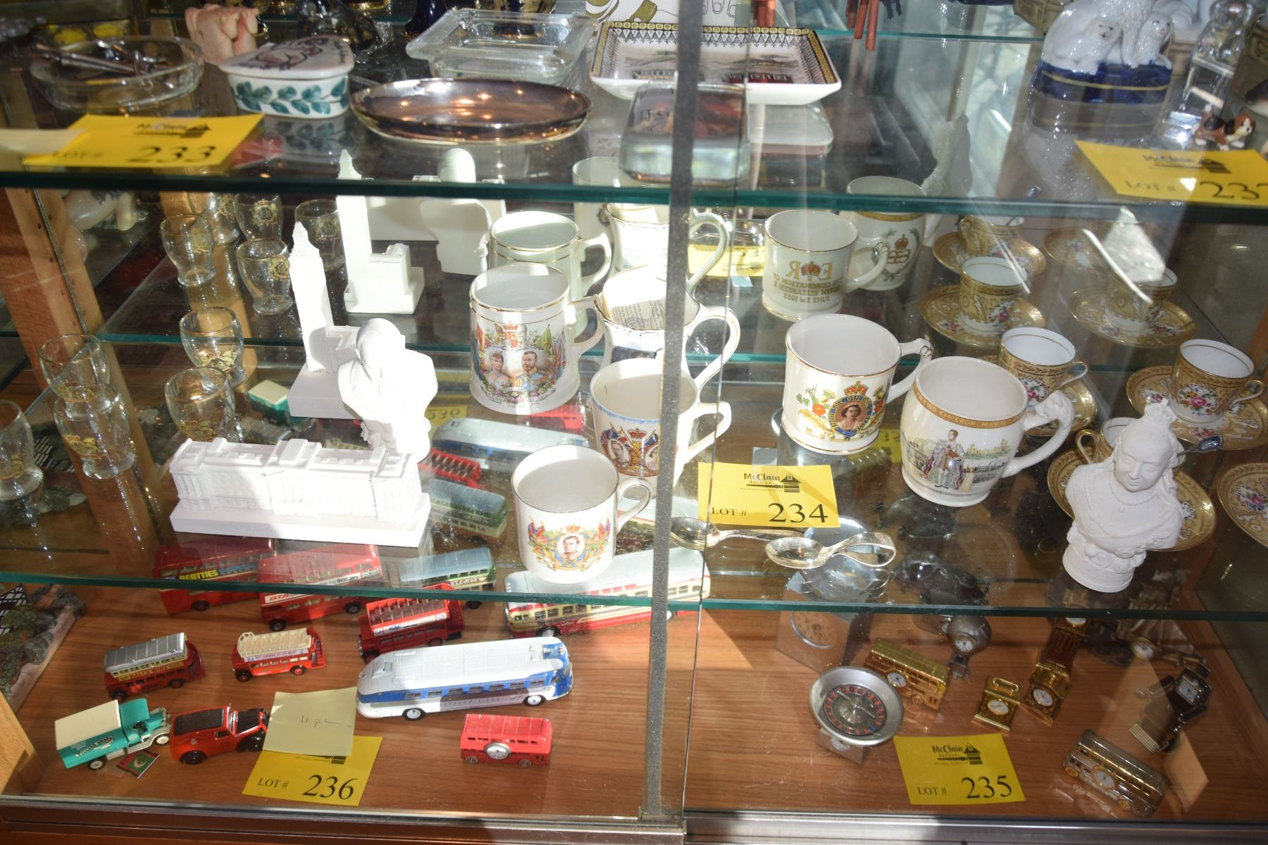 BRITISH SOUVENIRS: CORONATION CUPS, MUGS, BUCKINGHAM PALACE & BIG BEN MODELS, BUST OF CHURCHILL & QUEEN VICTORIA, ETC. (22 PCS)