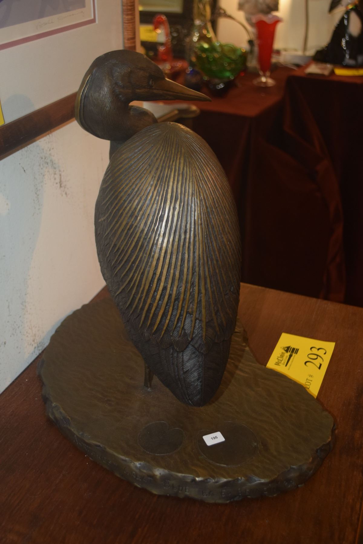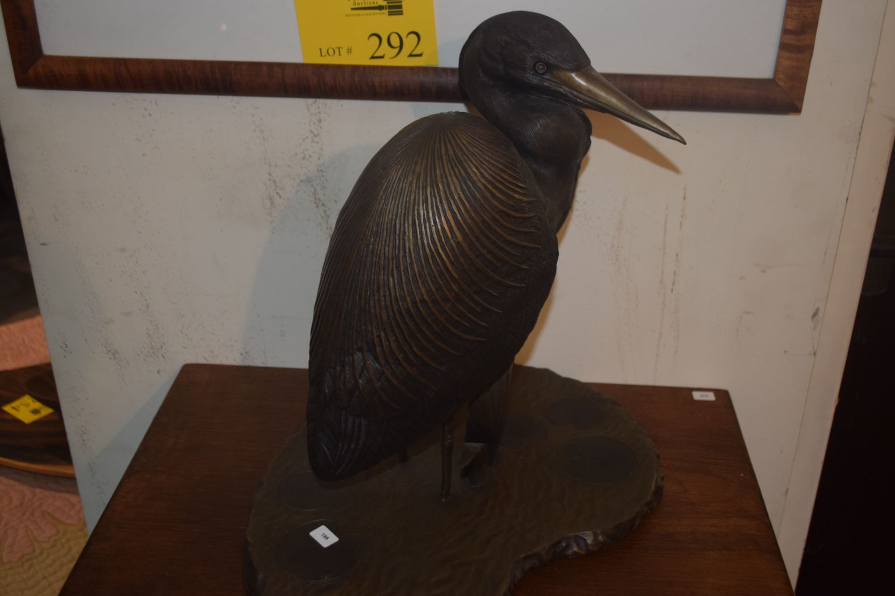 BRONZE SCULPTURE, "BLUE HERON", DEPICTING A HERON STANDING IN A SHALLOW LILY POND; BY ED BENNET (15
