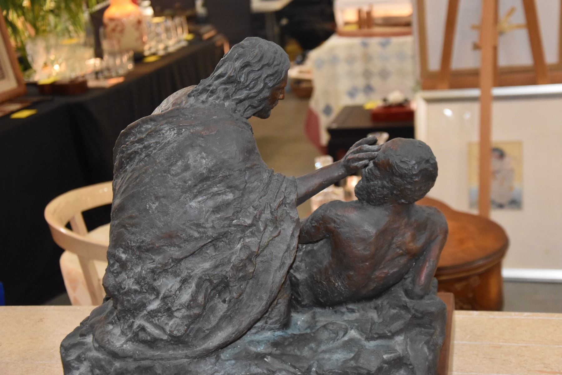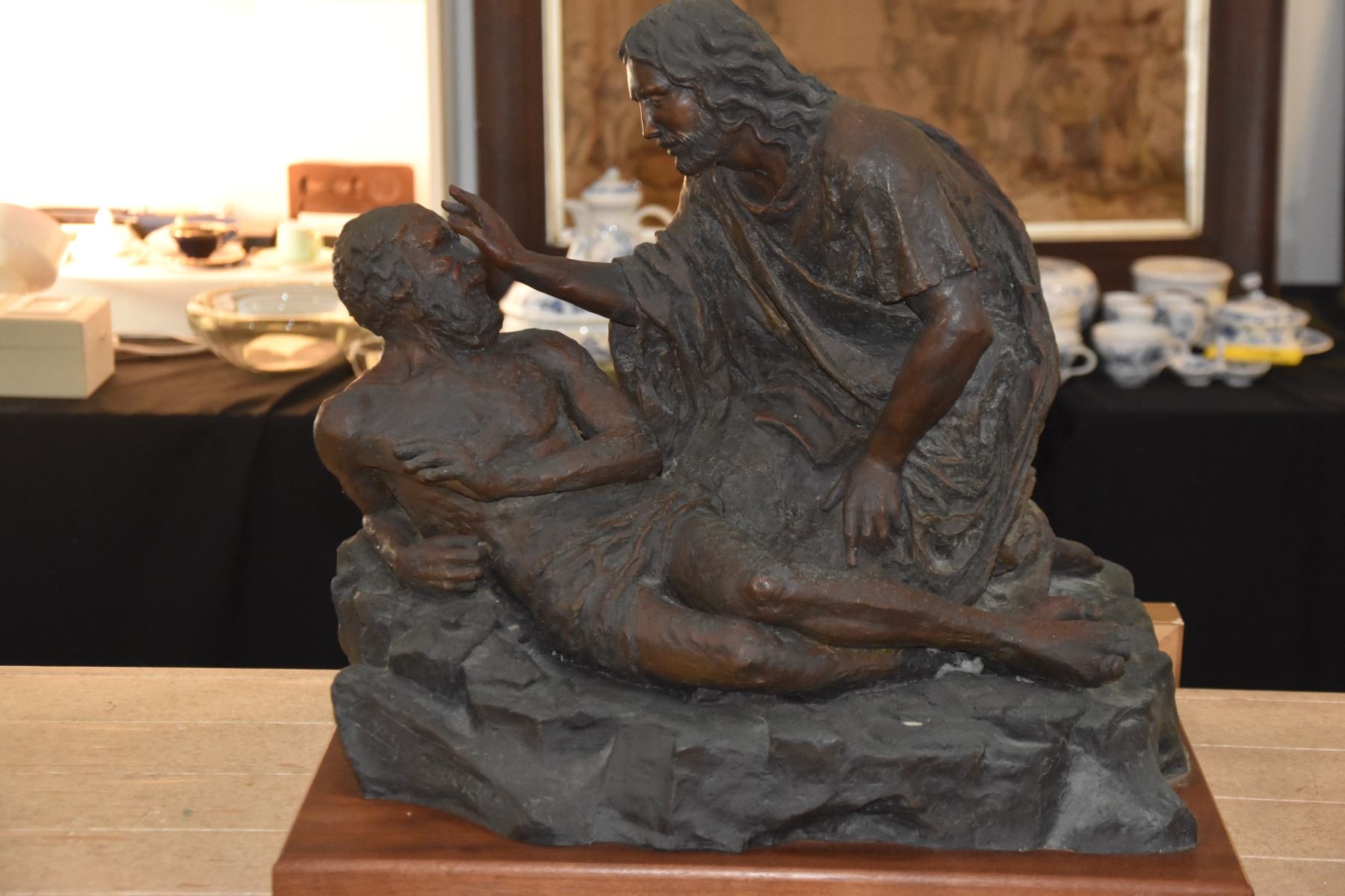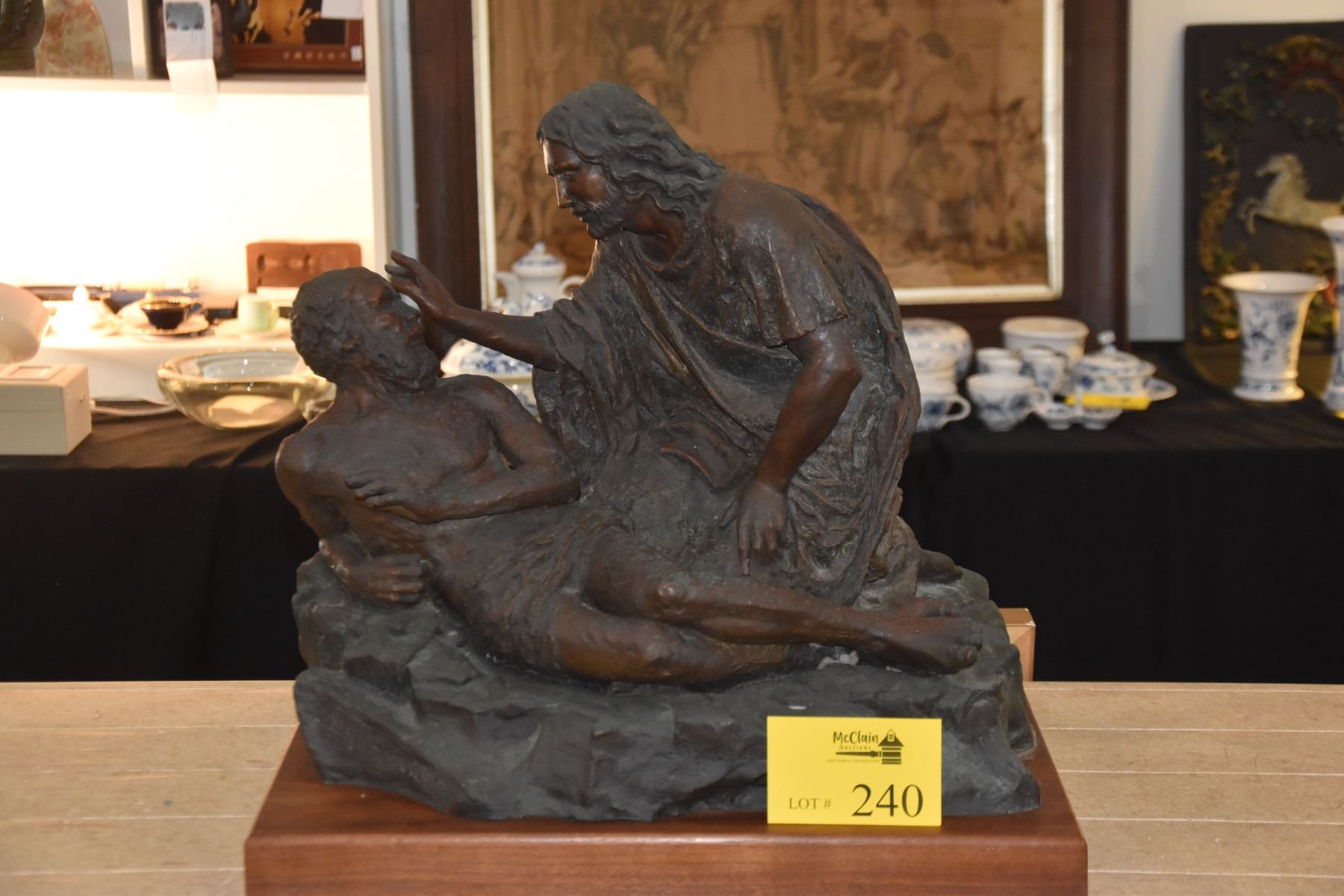 BRONZE STATUE, JESUS HEALING A MAN; SIGNED LEROY TRANSFIELD