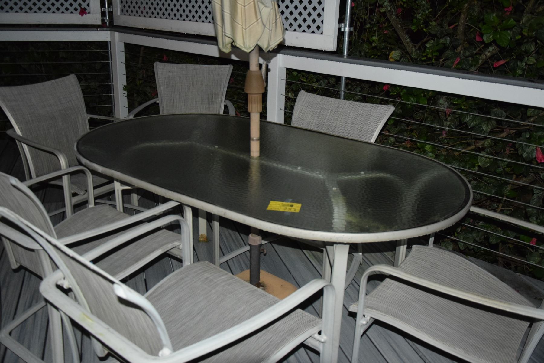 BROWN JORDAN PATIO SET W/TABLE, UMBRELLA & 6 ARM CHAIRS (8 PCS)