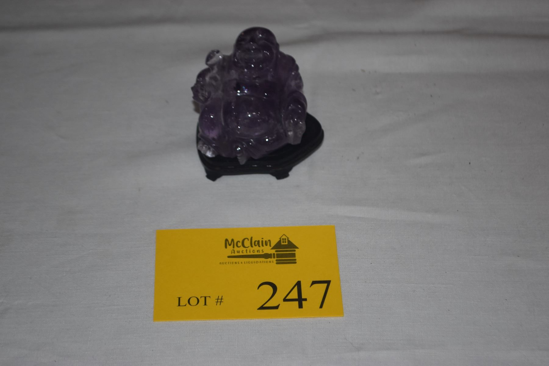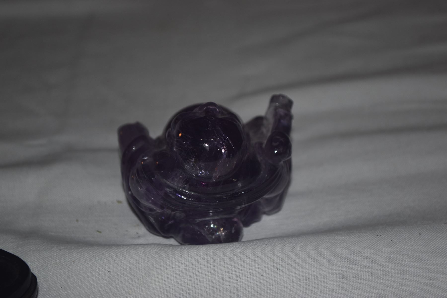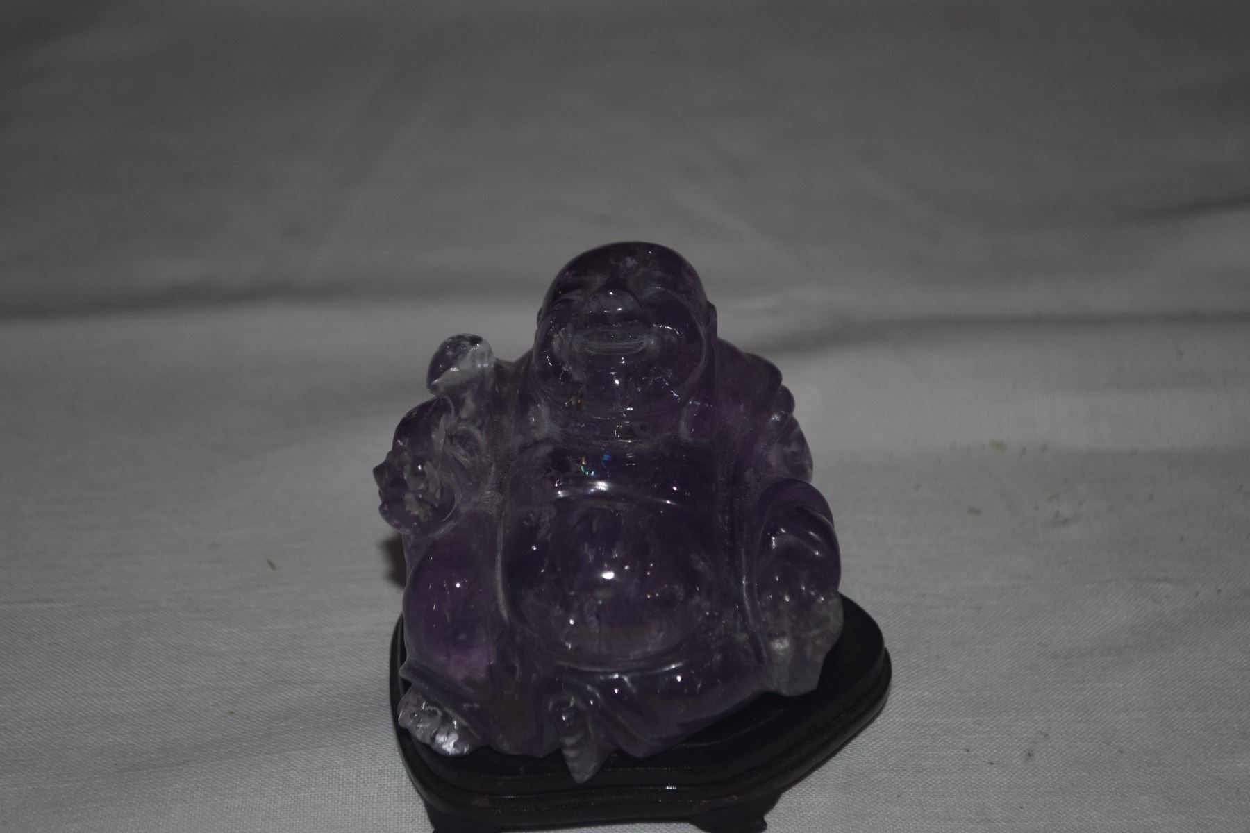 CARVED AMETHYST BUDDHA W/STAND (2" X 2 1/2")