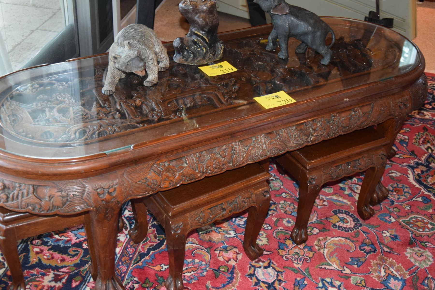 CARVED ASIAN STYLE LOW TABLE W/6 STOOLS (60" X 21" X 18 1/4" H) (7 P CS)