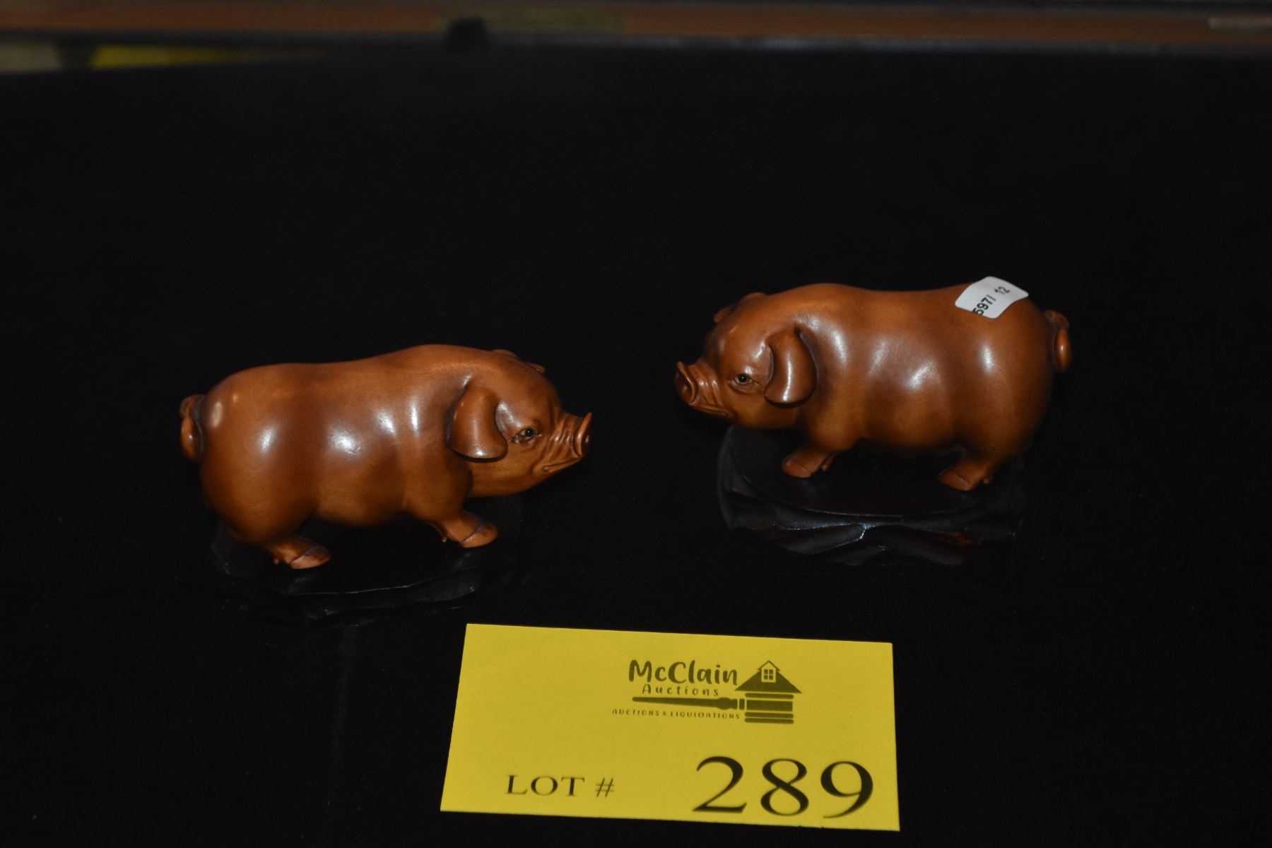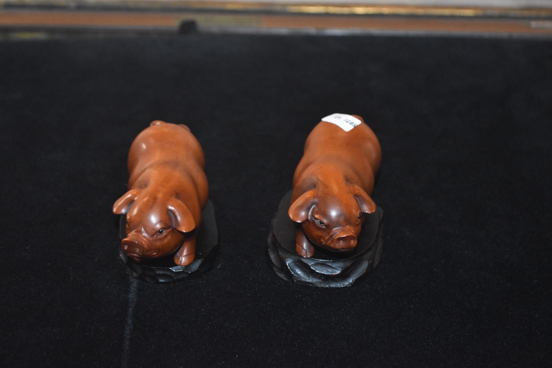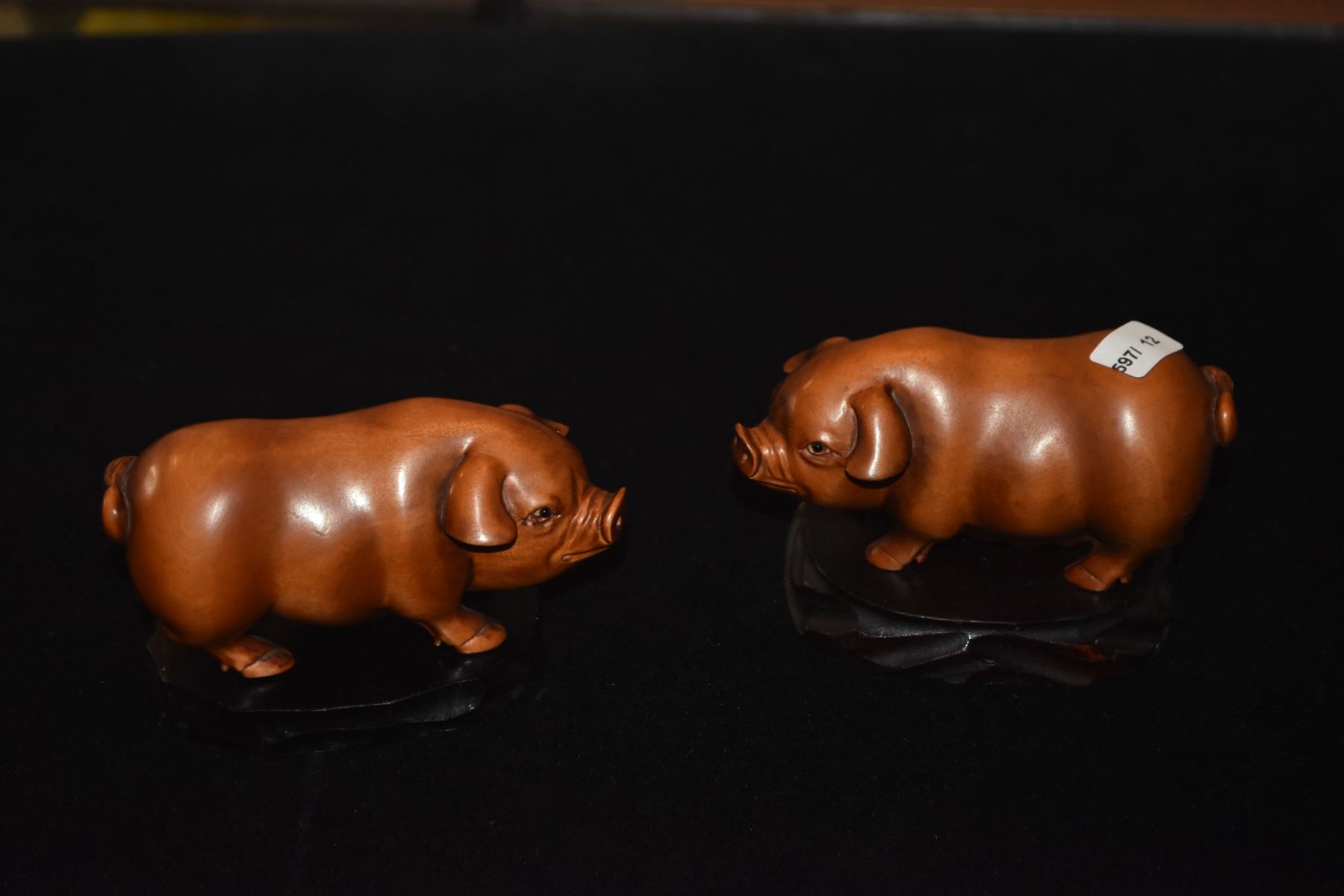 CARVED BOXWOOD OKIMONOS ON STANDS; SIGNED (BOAR & SOW)