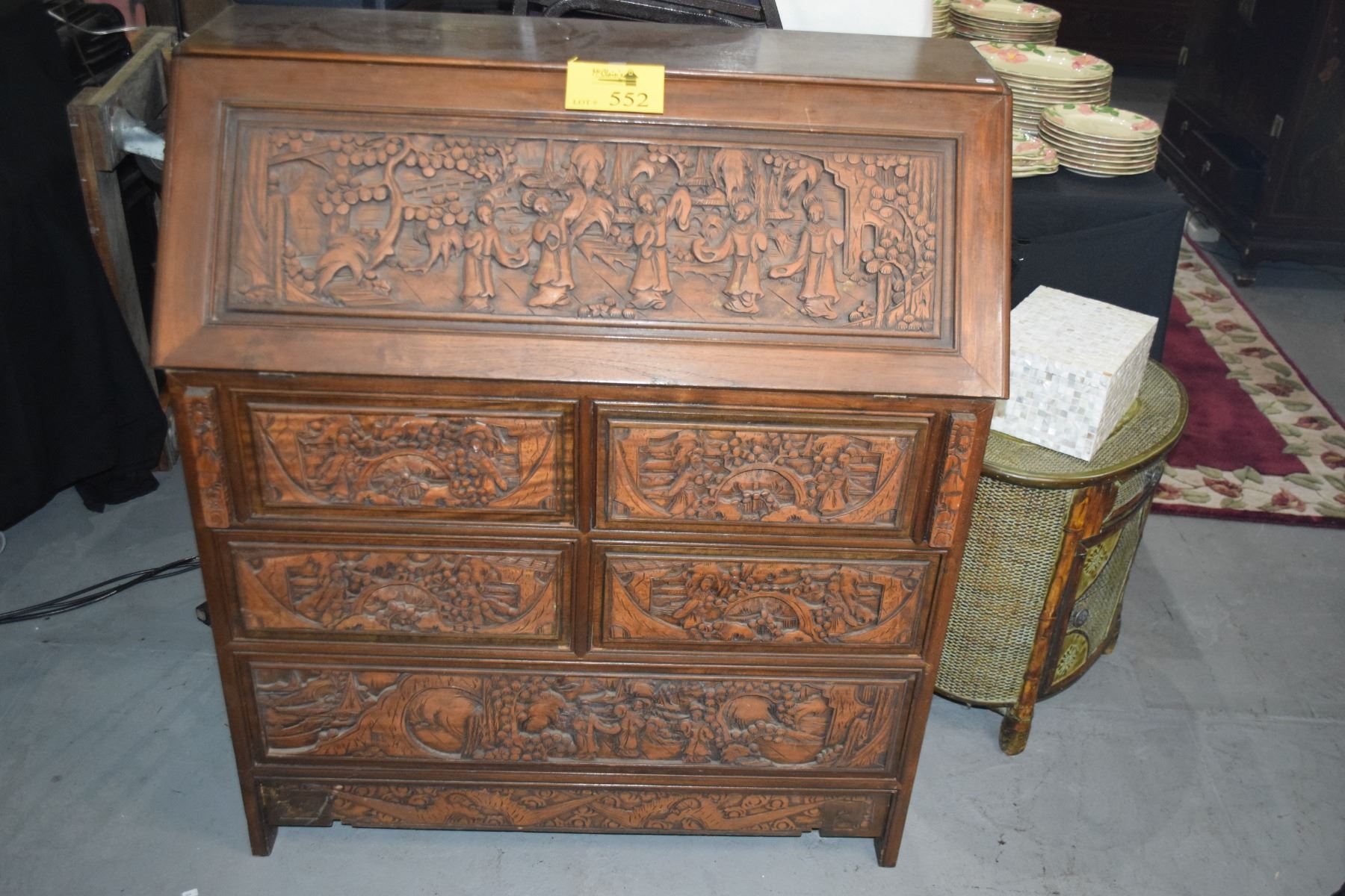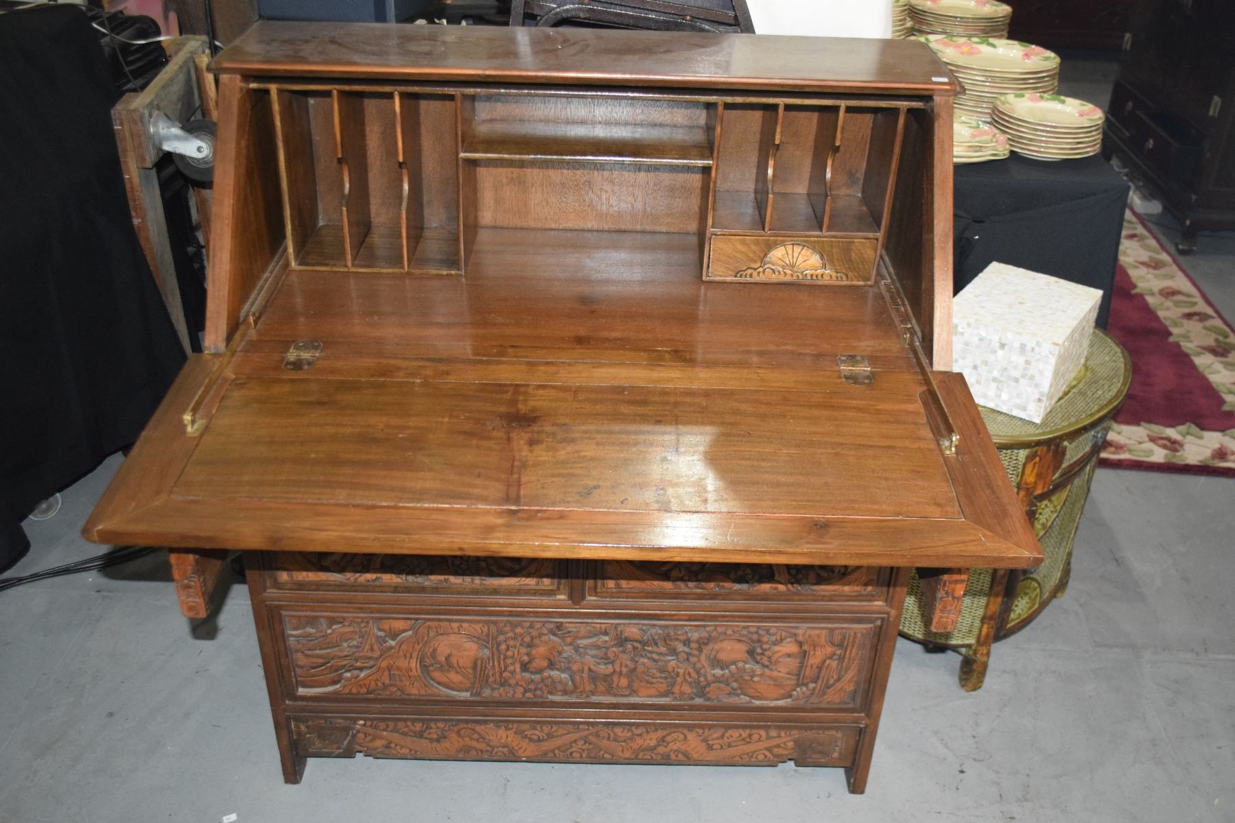 CARVED CHINESE DROP FRONT DESK W/5 DRAWERS