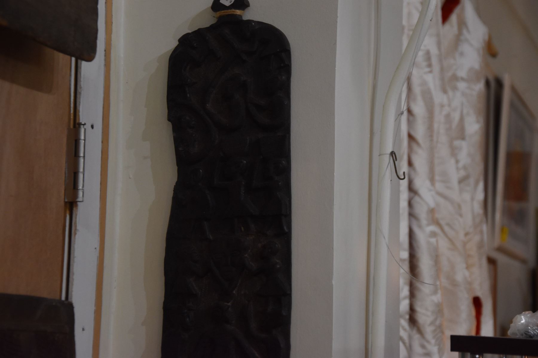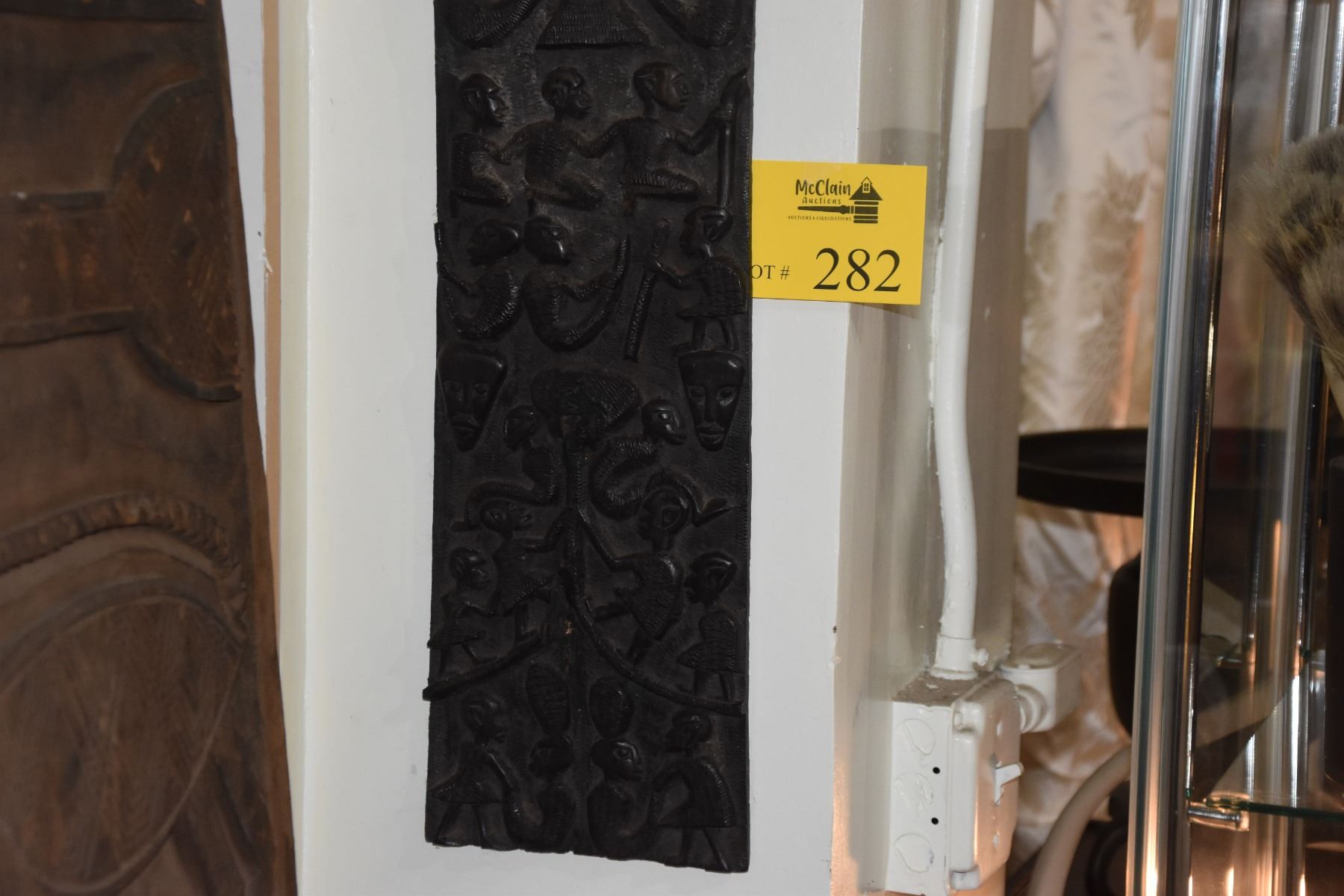 CARVED HARDWOOD STORY BOARD; SIGNED & DATED (35" X 6 1/2")