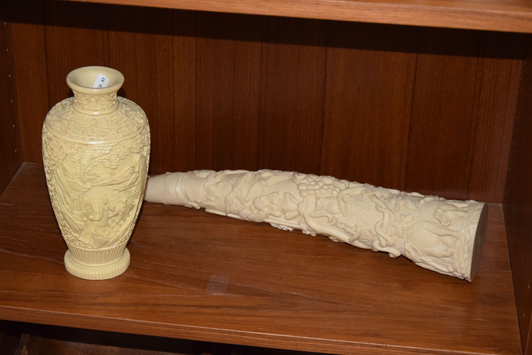CARVED VASE & FAUX IVORY TUSK (2 PCS) (GIVEN TO FATHER CLARENCE GUERREIRO/TERRANCE KNAPP)